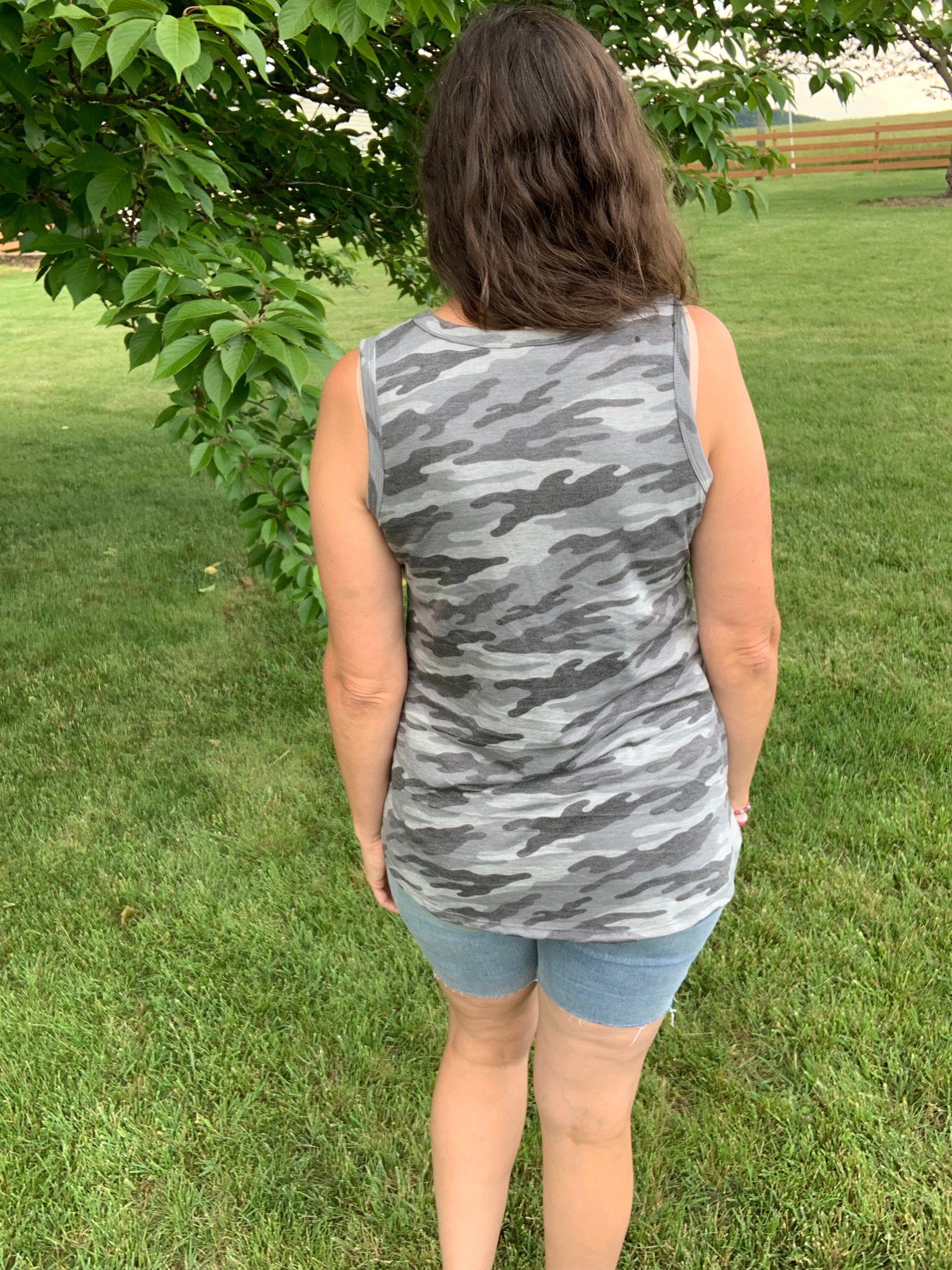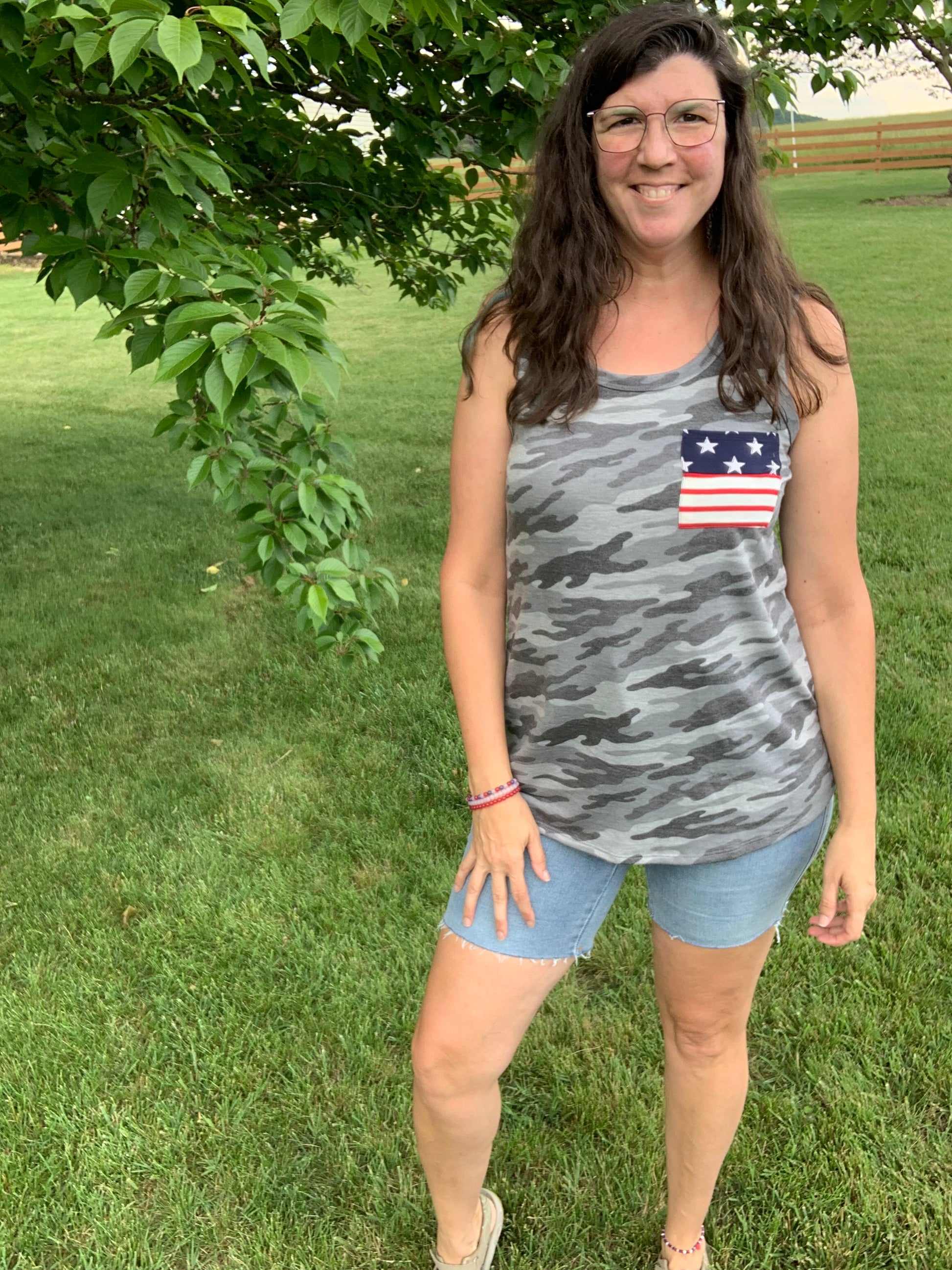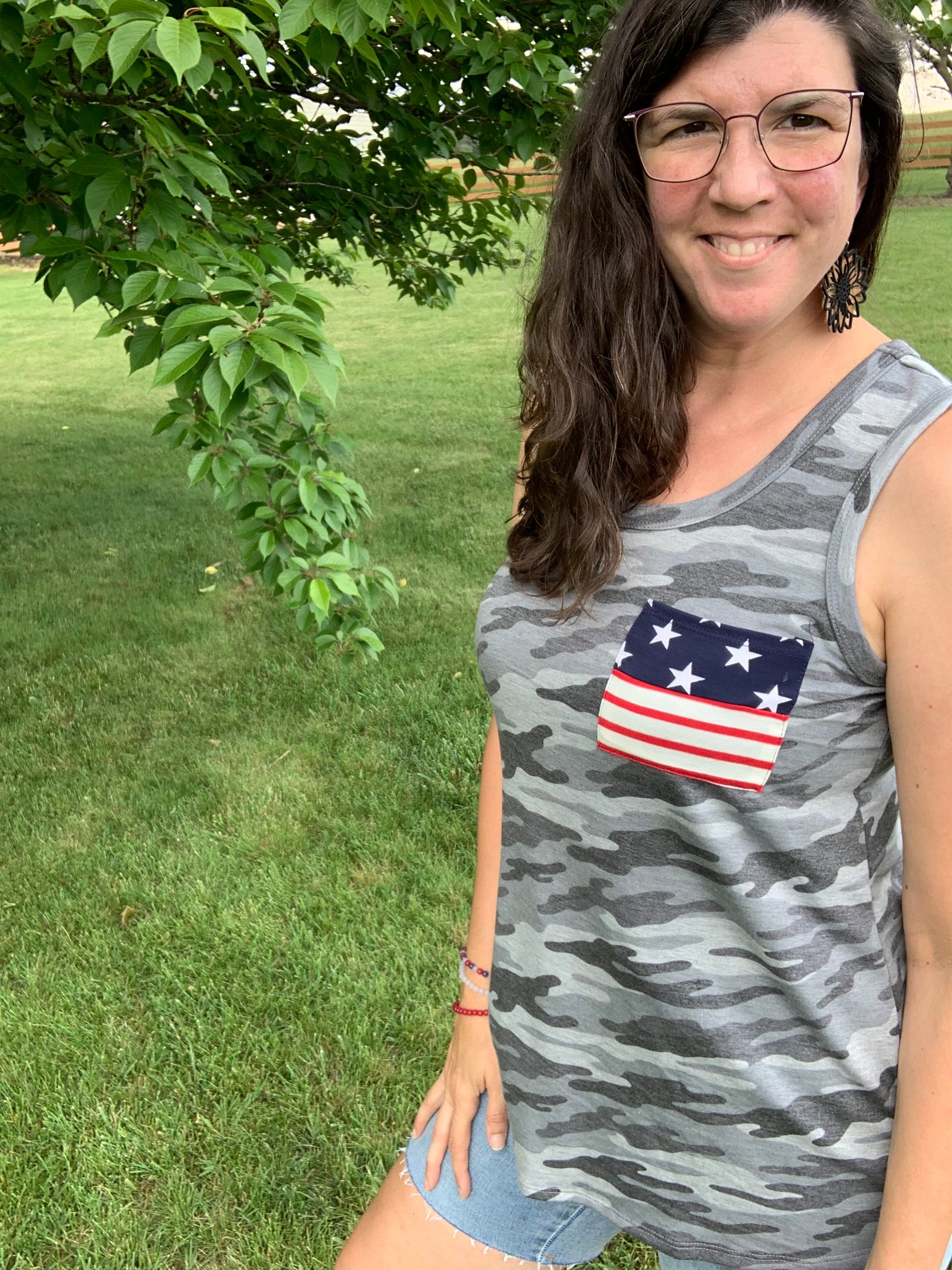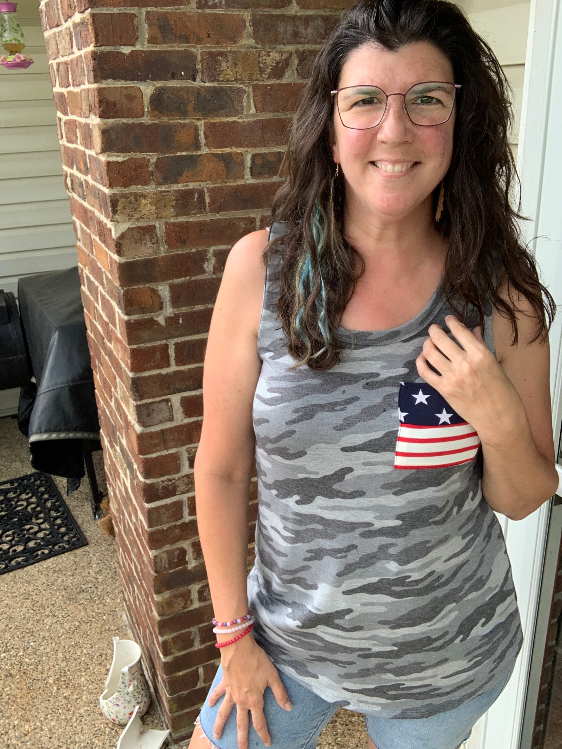 Cute camouflage tank with American Flag πΊπΈ front patch pocket. Soft & stretchy material.