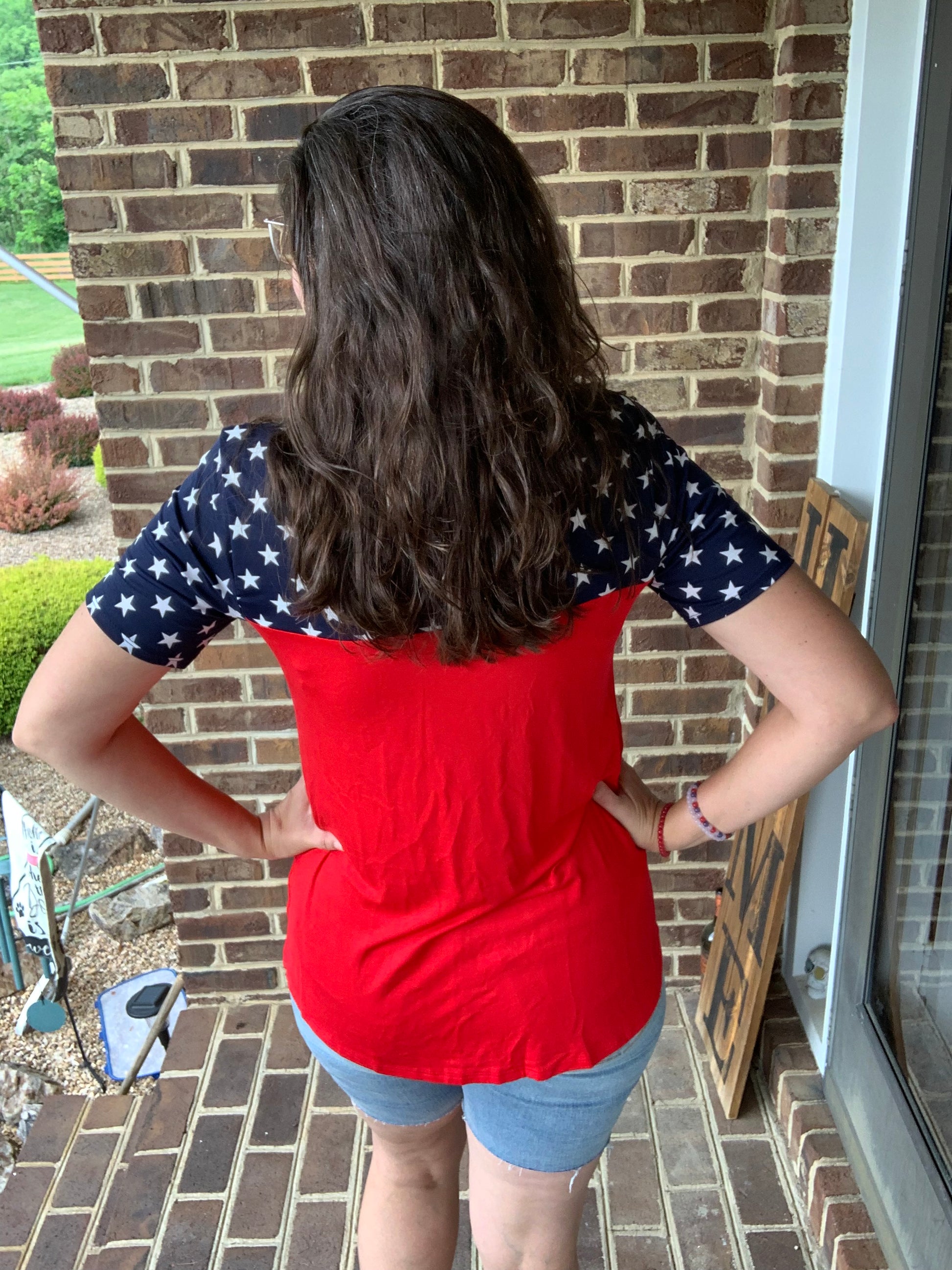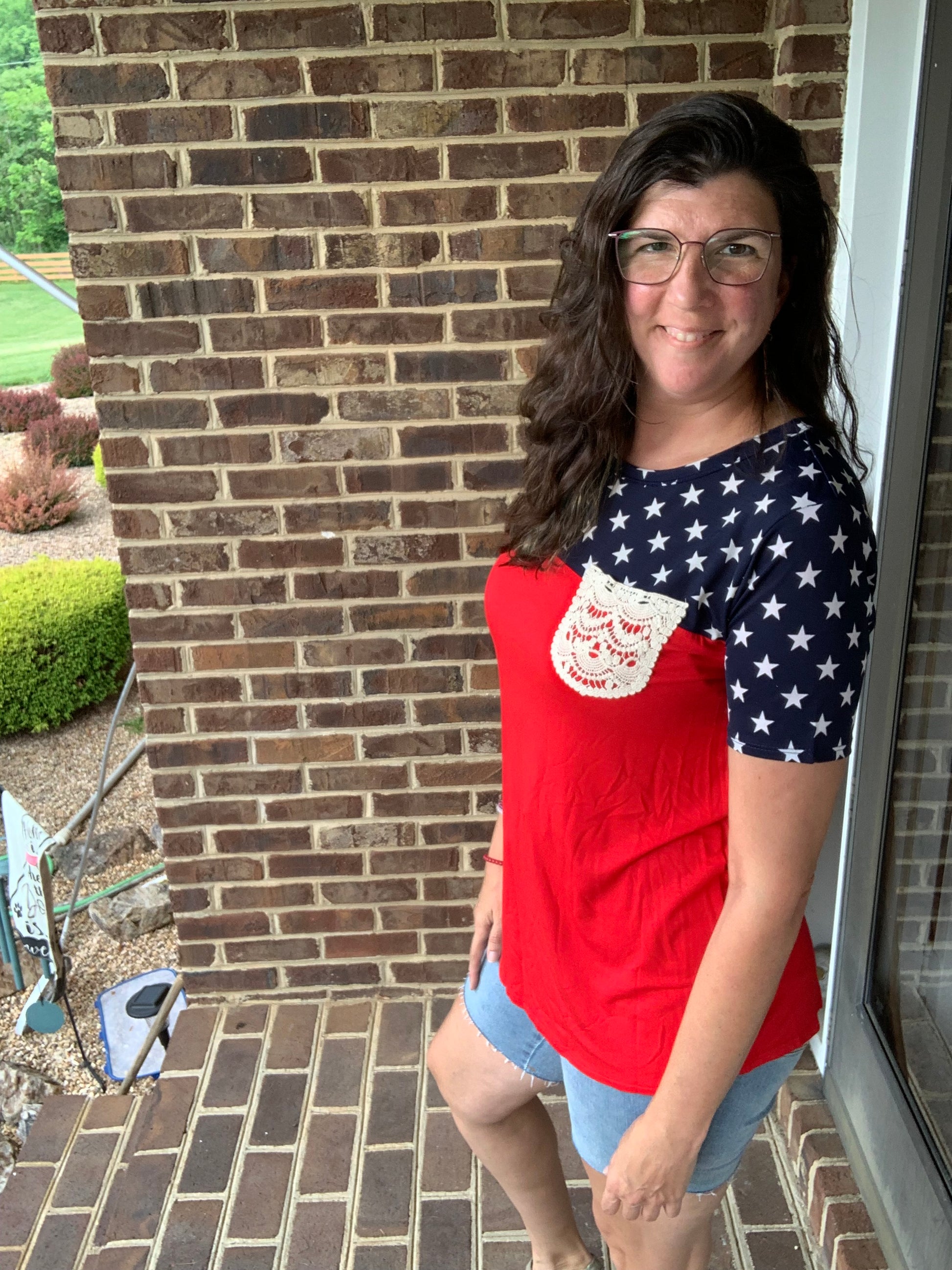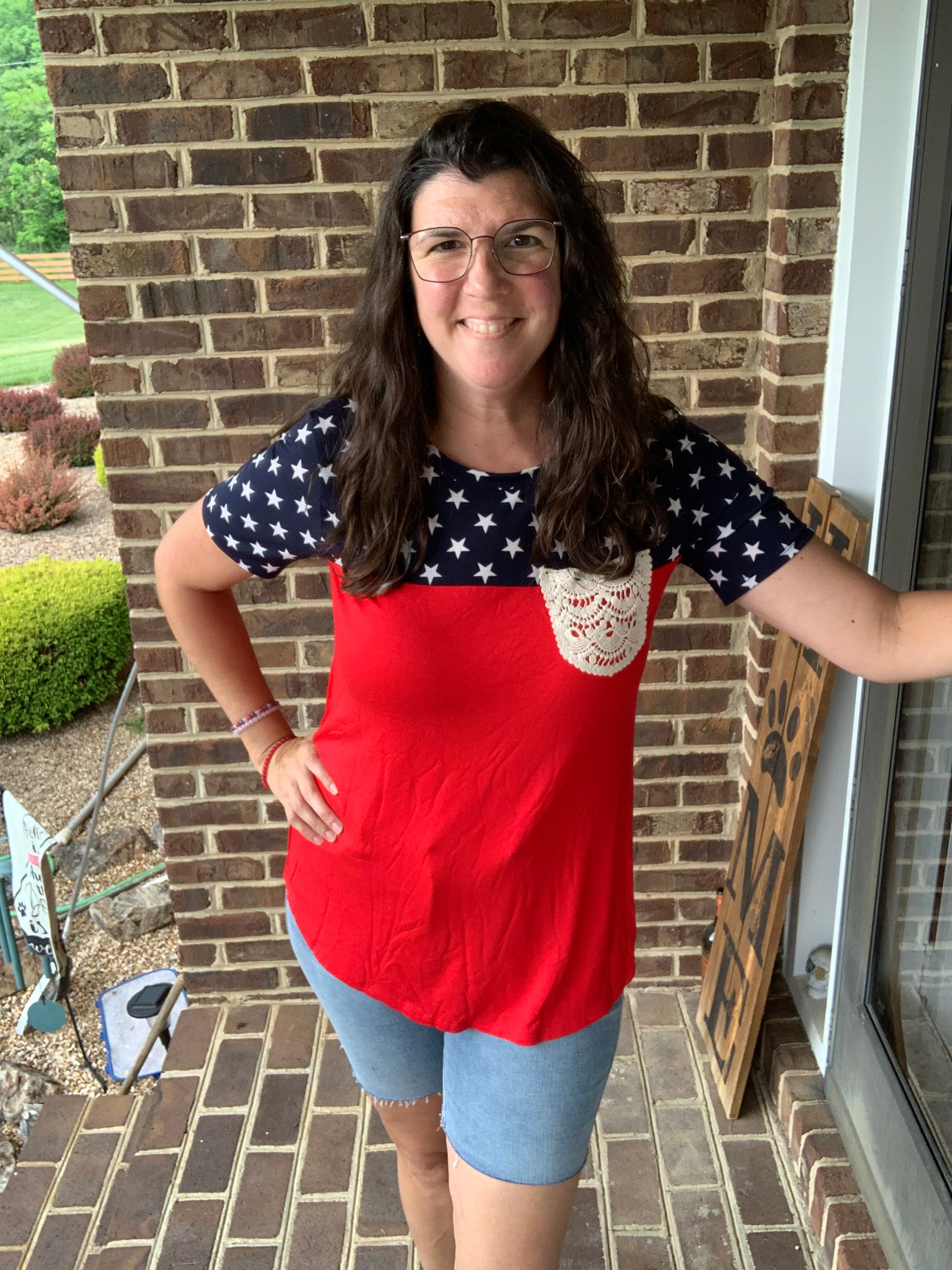 Red, white, & blue Americana top. So cute with the navy & white stars & red body. Accented with a functional front lace pocket.