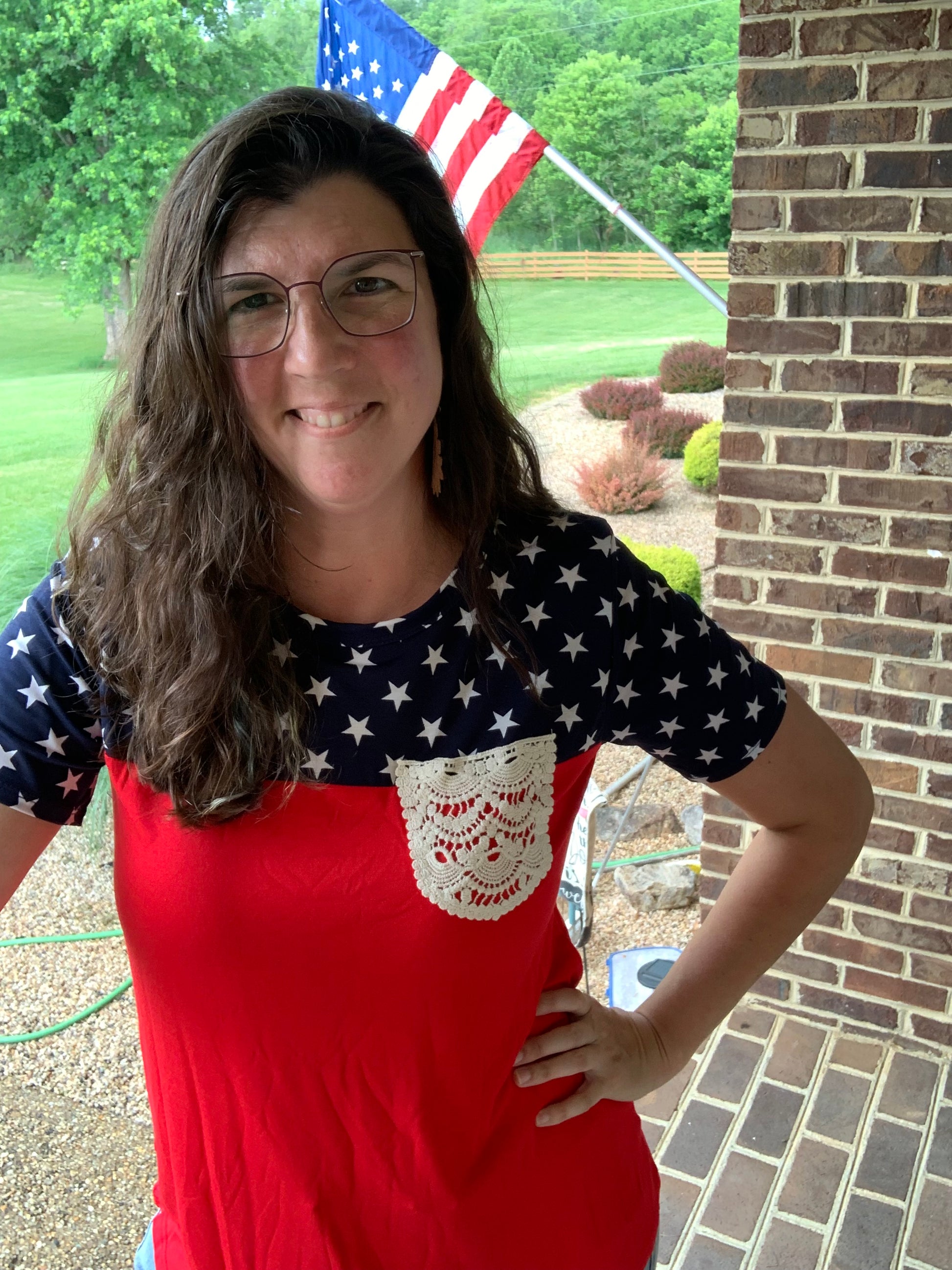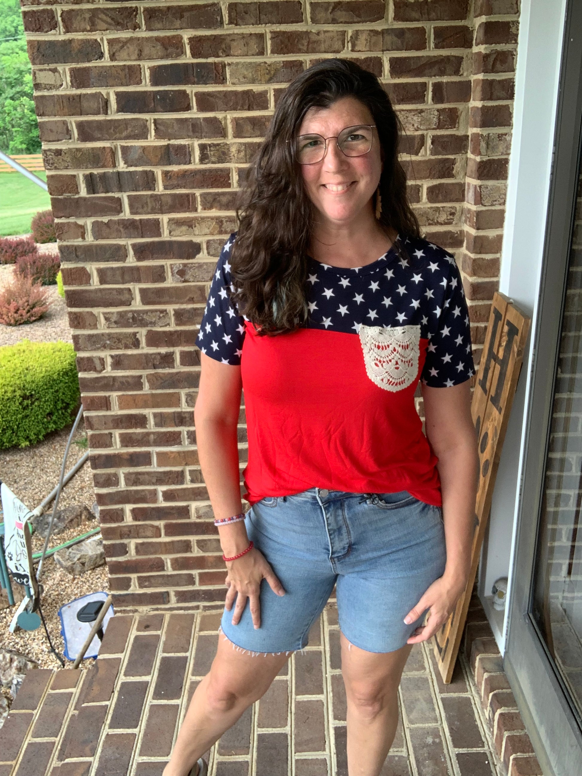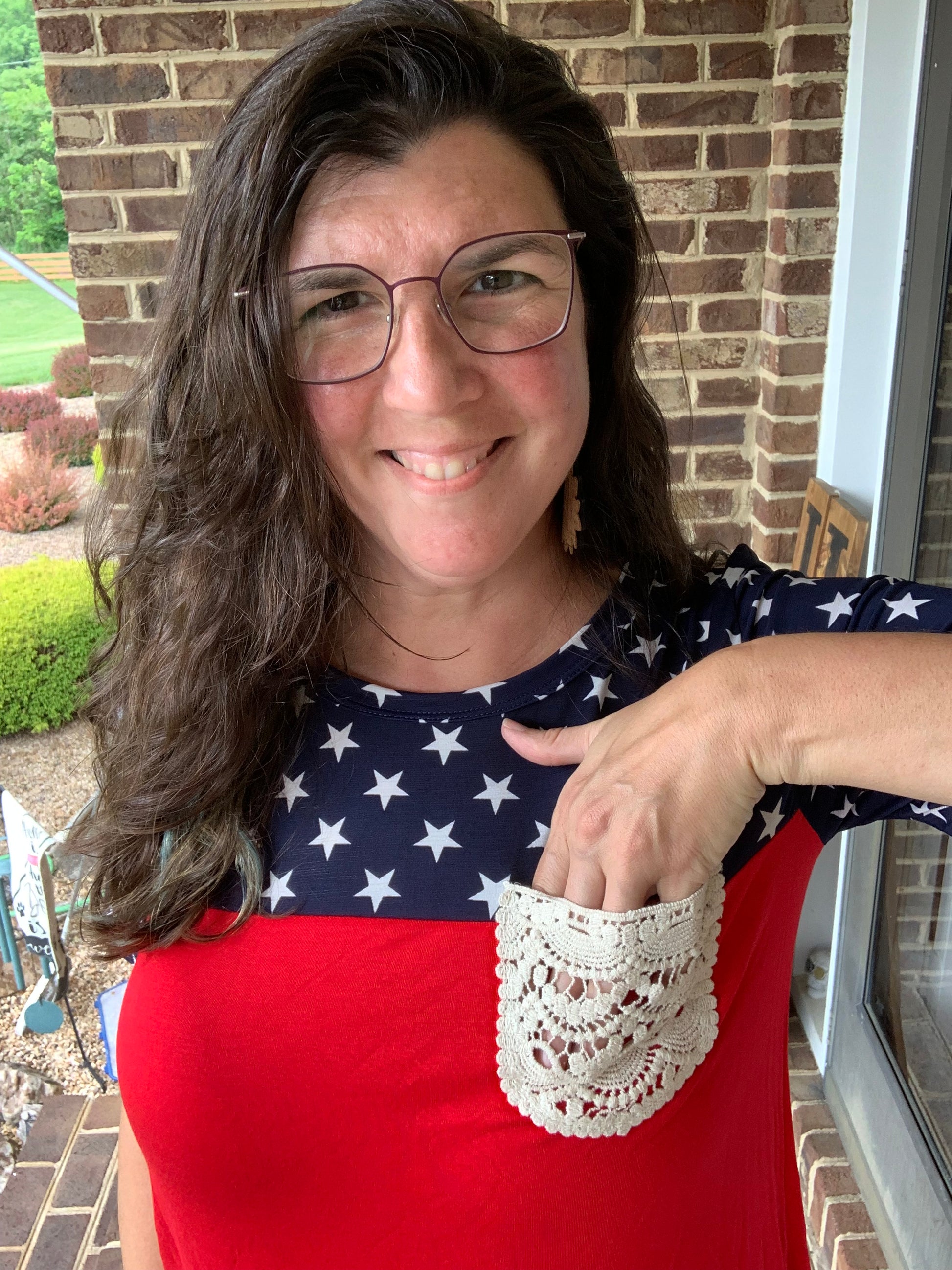 Red, white, & blue Americana top. So cute with the navy & white stars & red body. Accented with a functional front lace pocket.