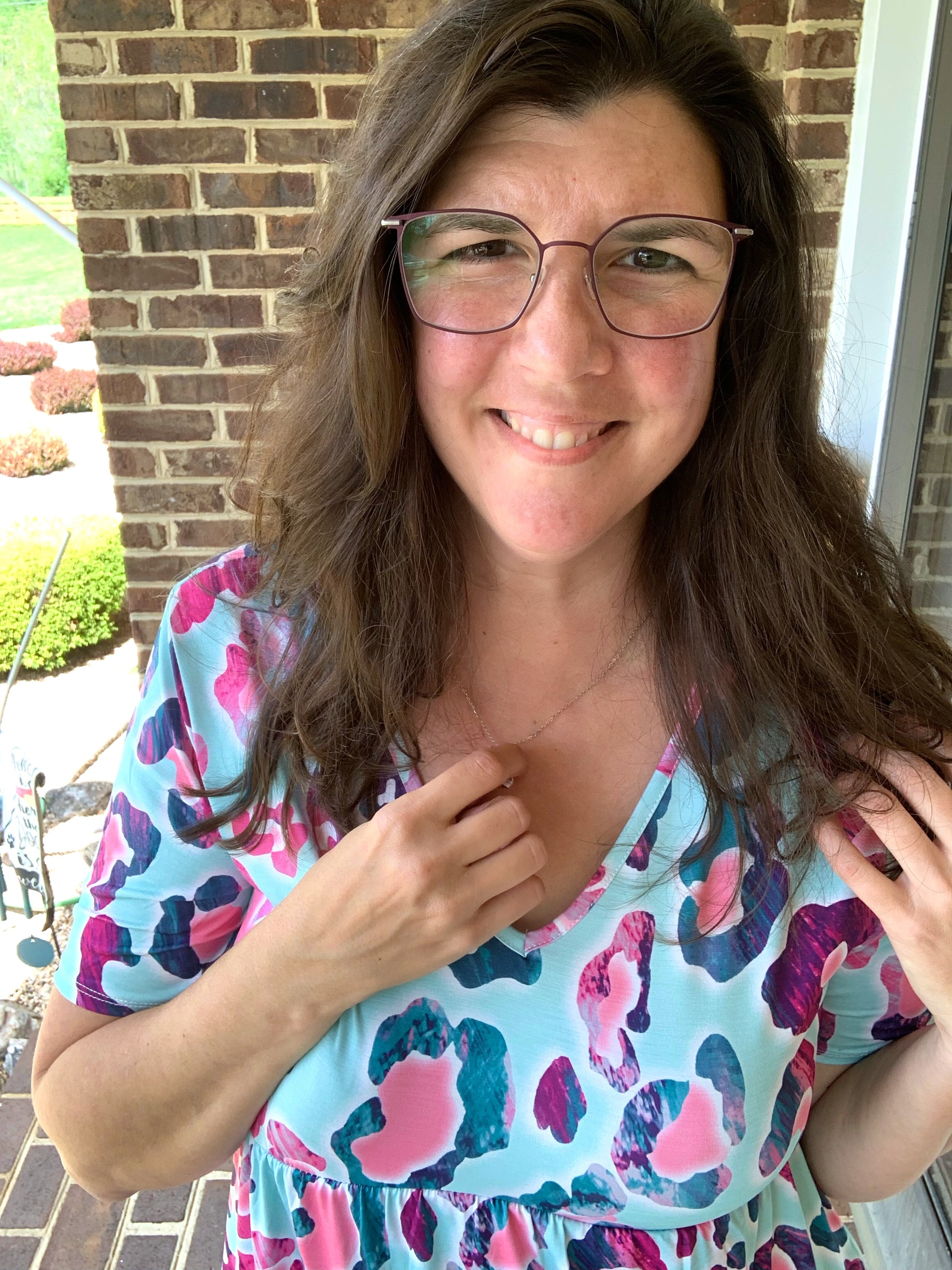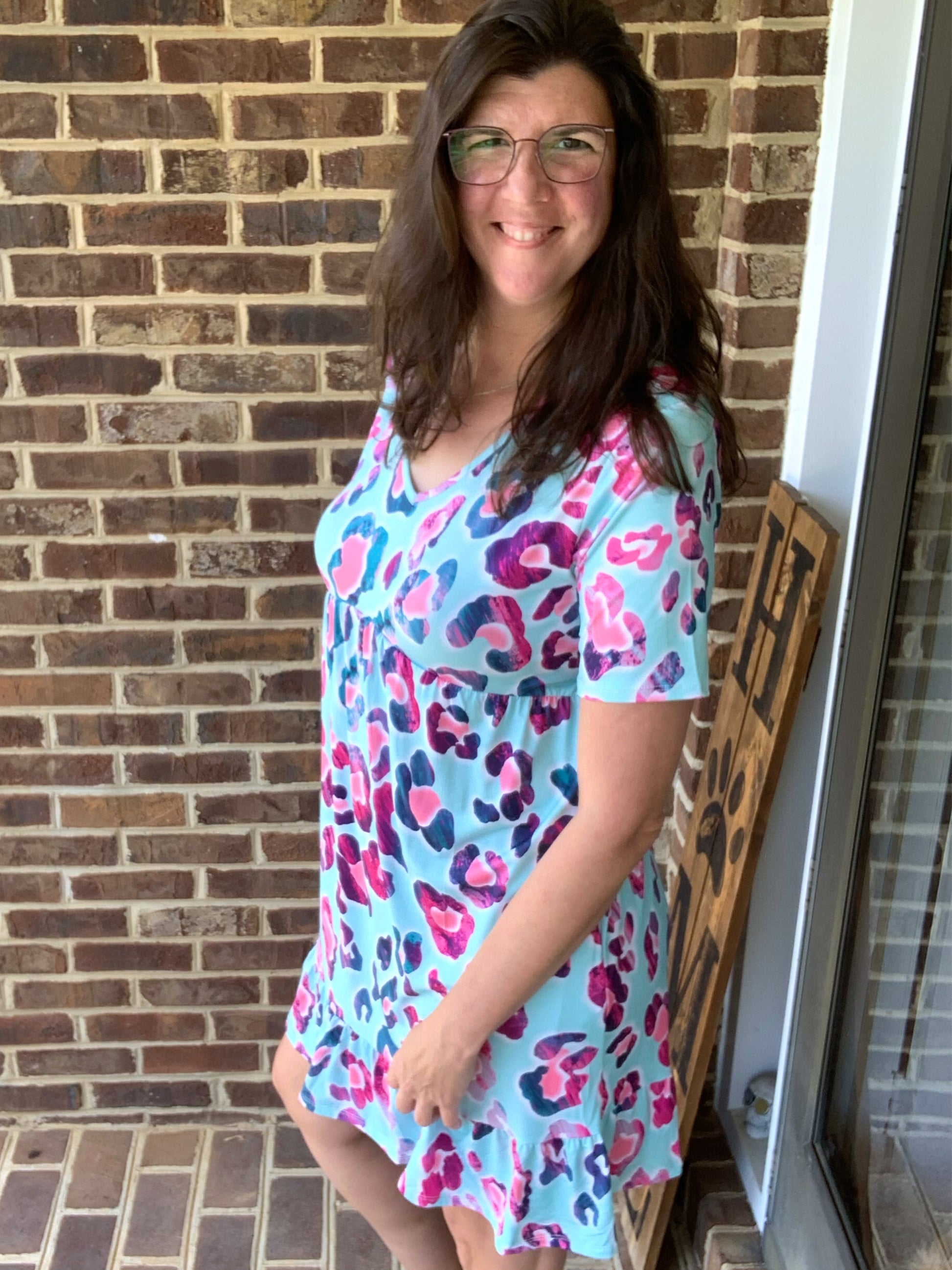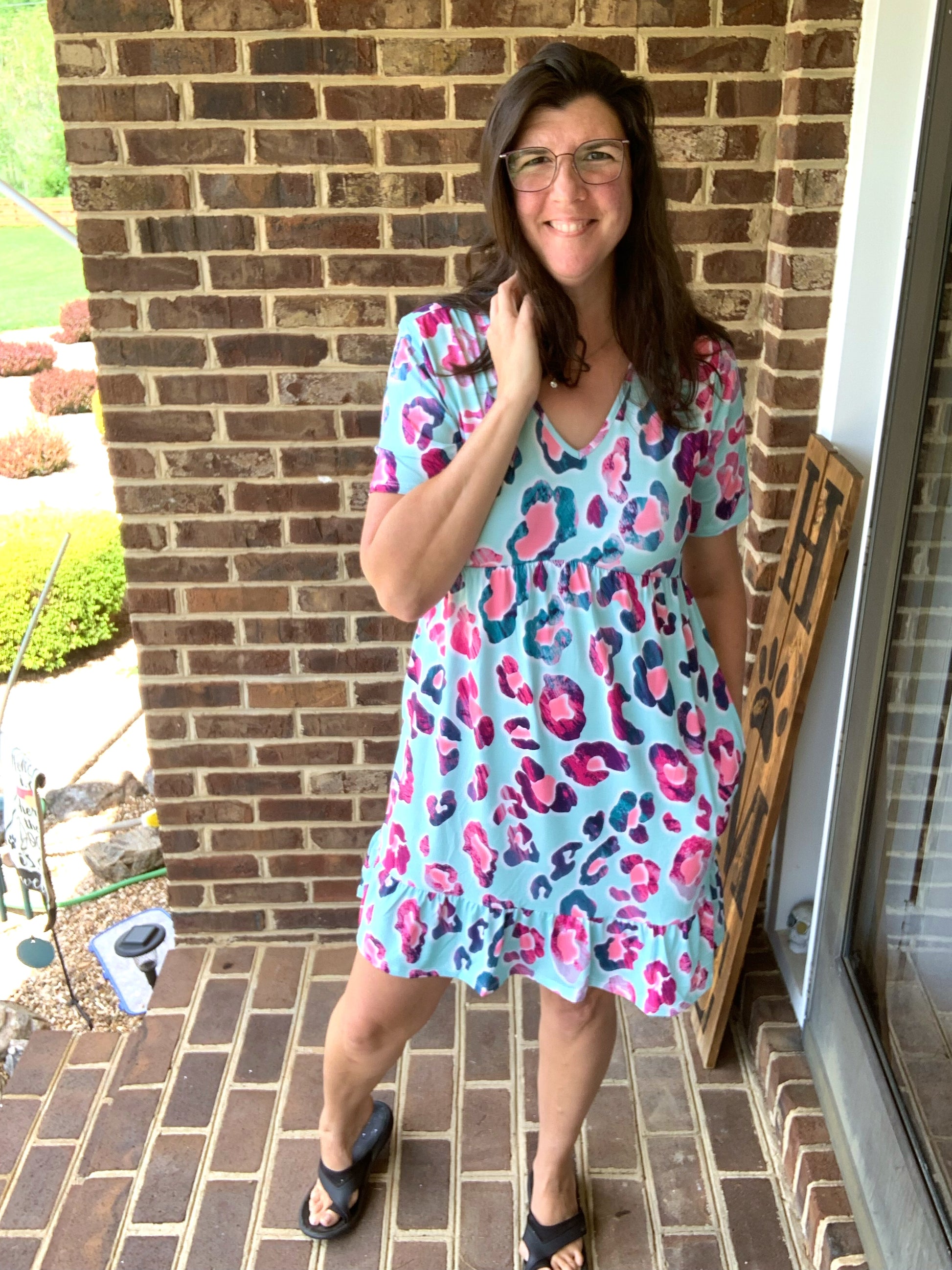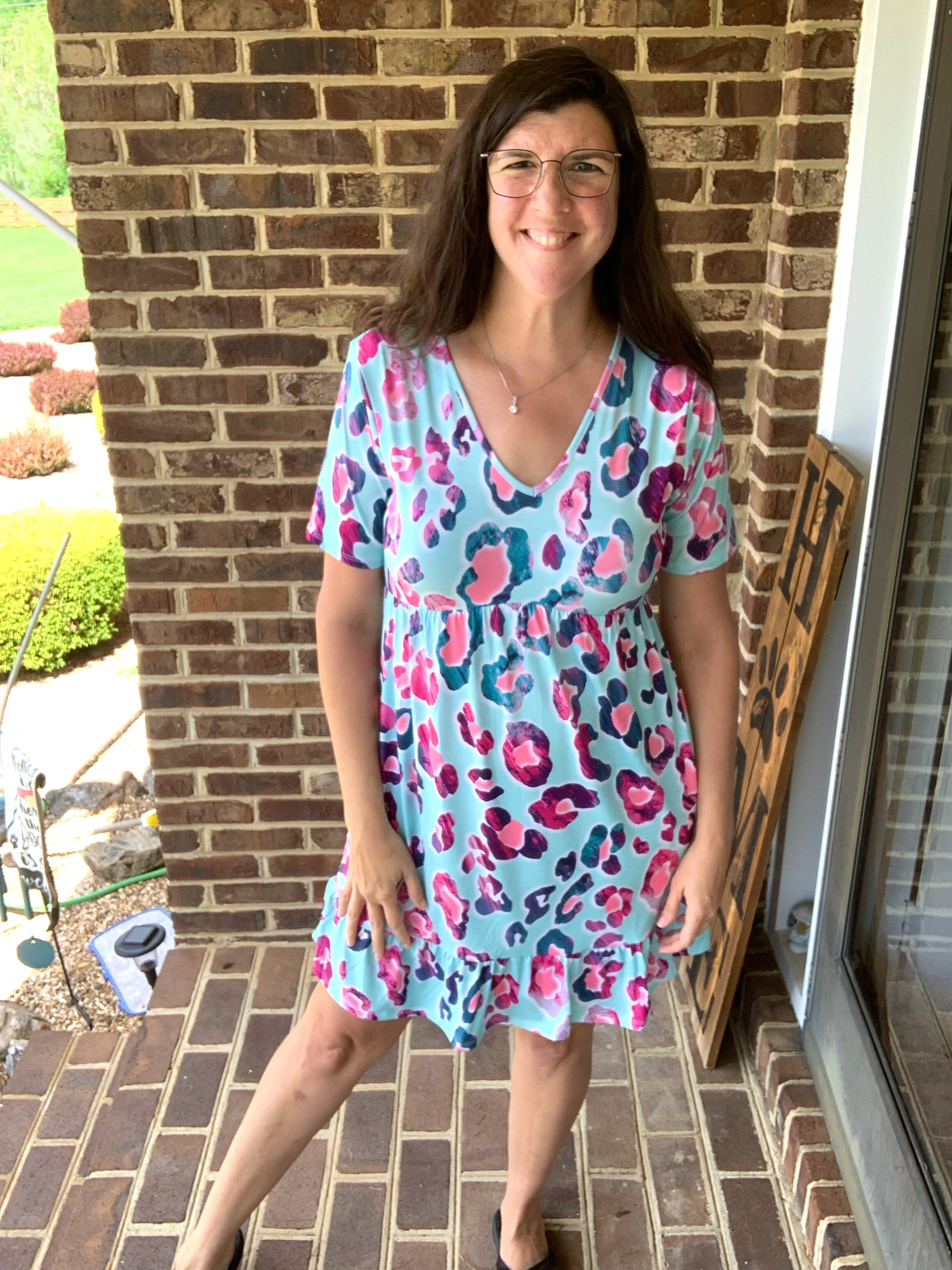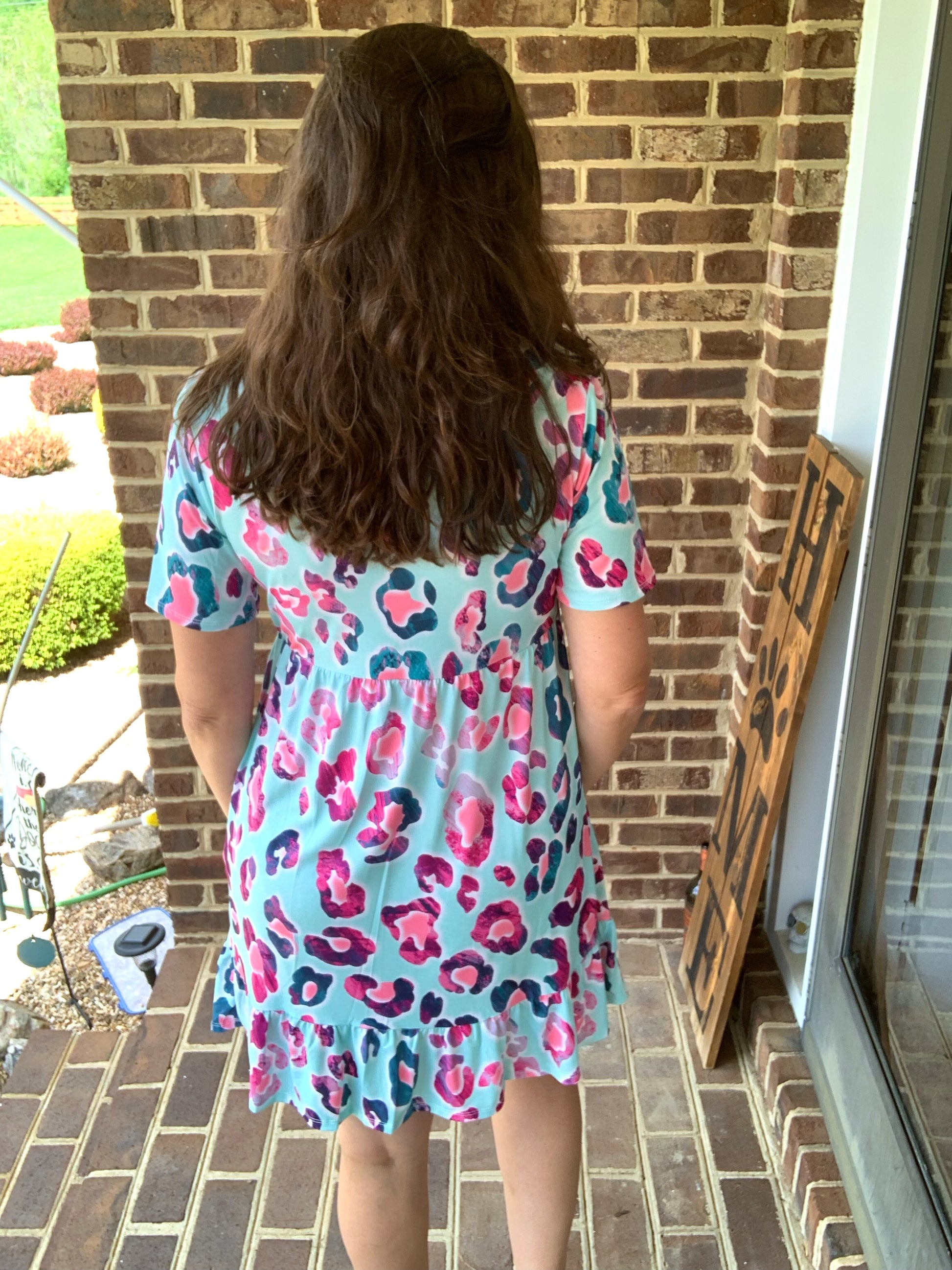 Minty Blue cheetah print dress with pink, teal, & purple. Front yoke and Ruffle hem. V-neckline. Will hit at the knee or right below for short/average height ladies. Above the knee on taller ladies.