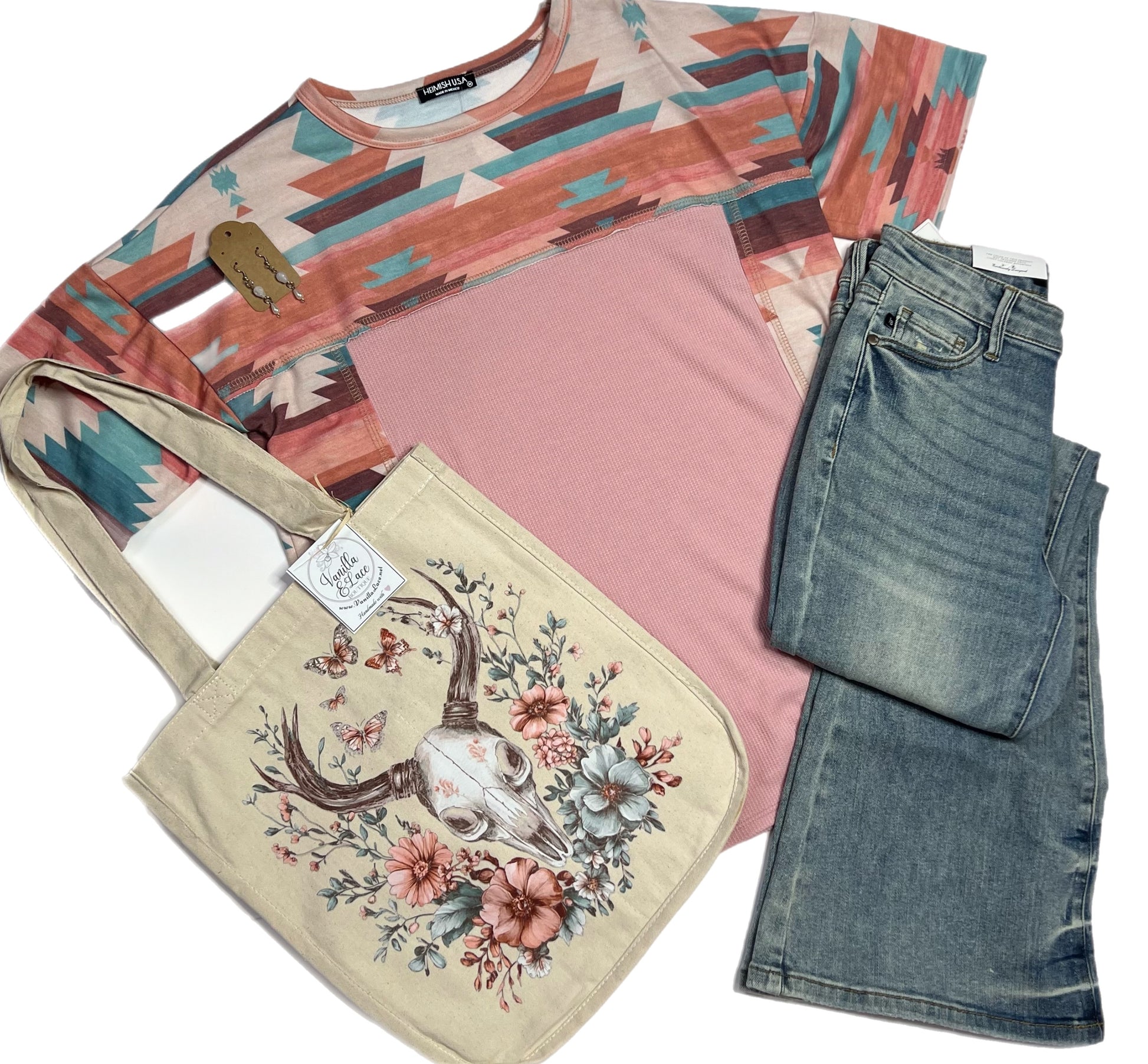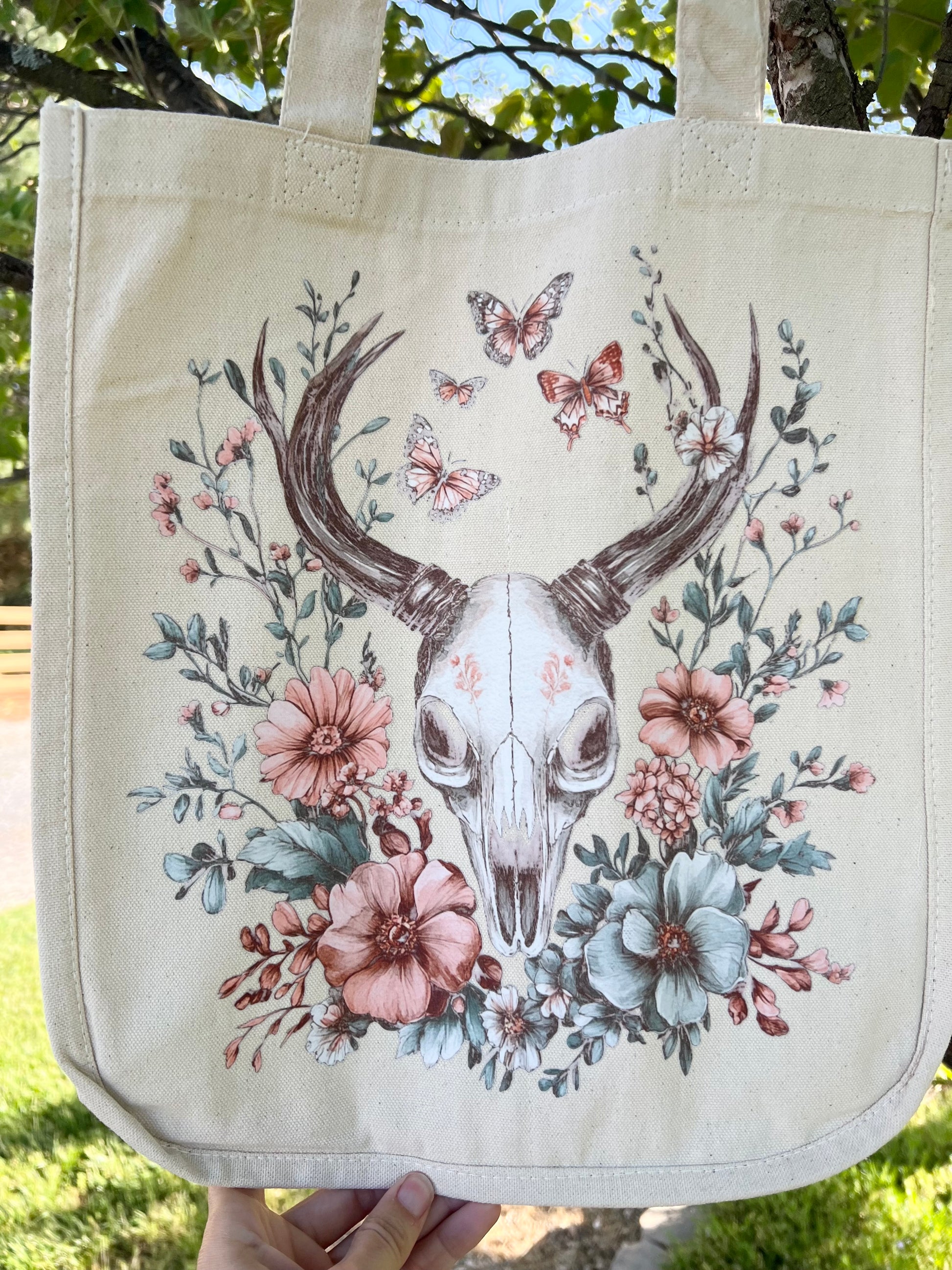 Customized Canvas Tote - Boho Floral Bull Skull Design
