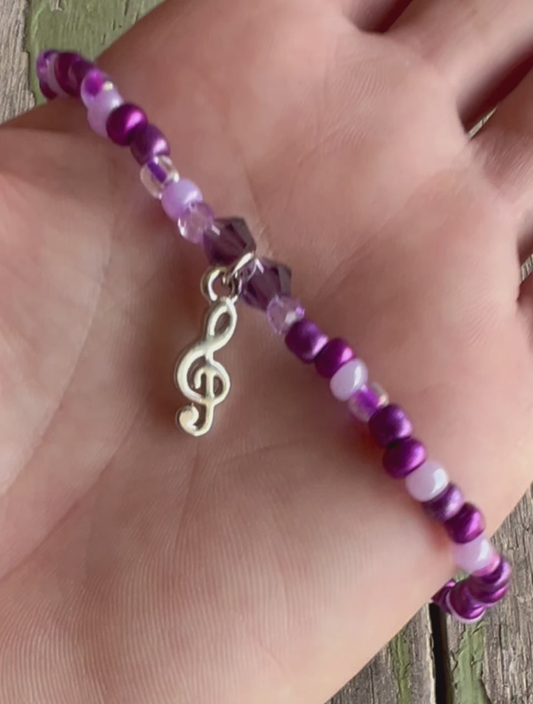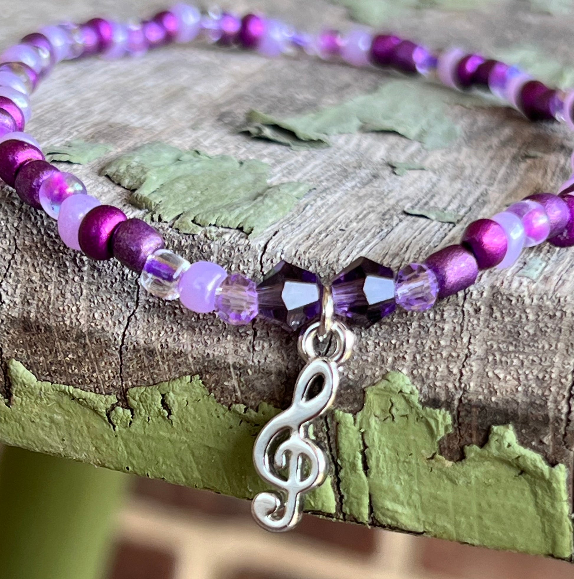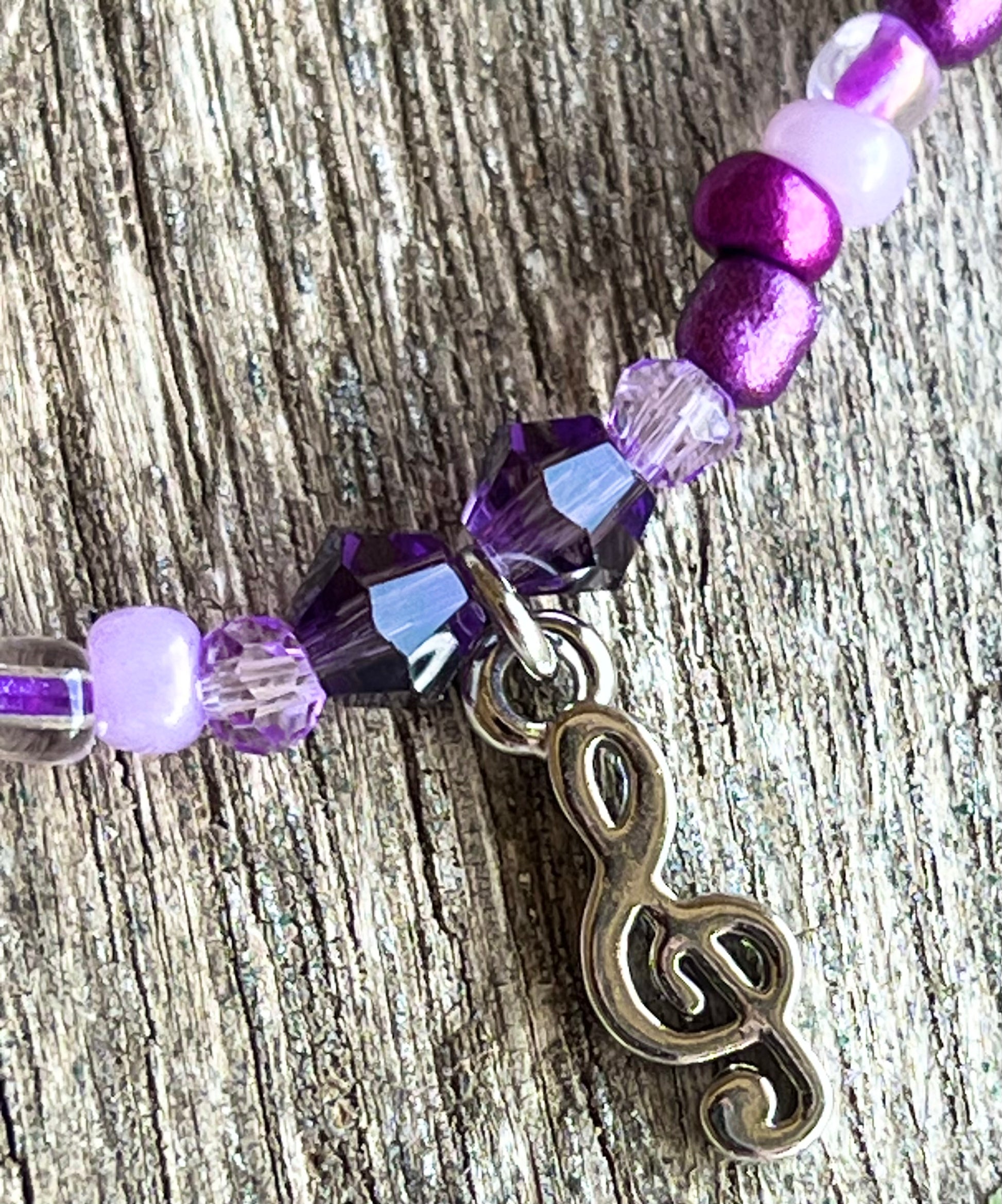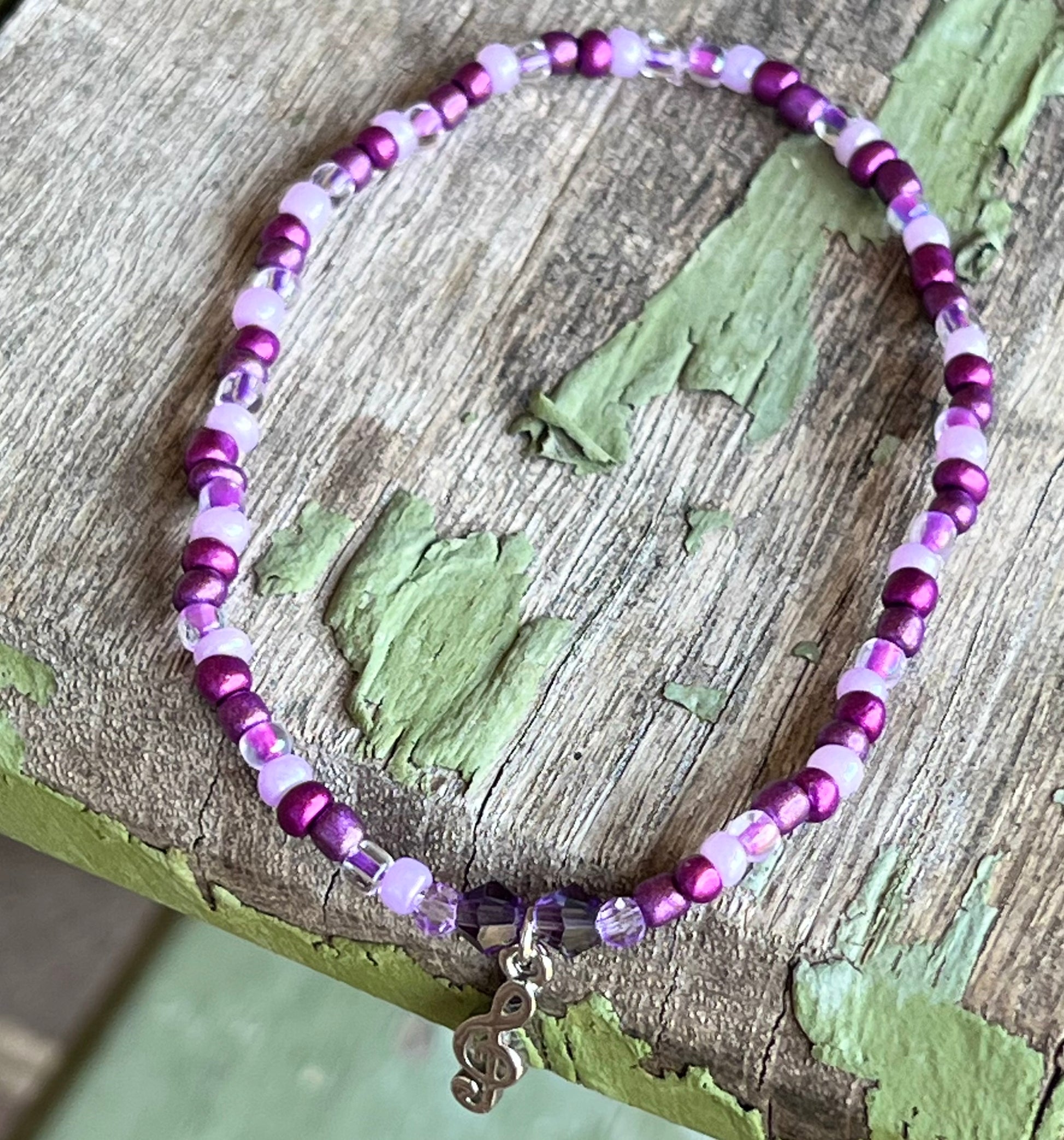 Vary shades of purple glass seed beads & musical 🎵 charm.