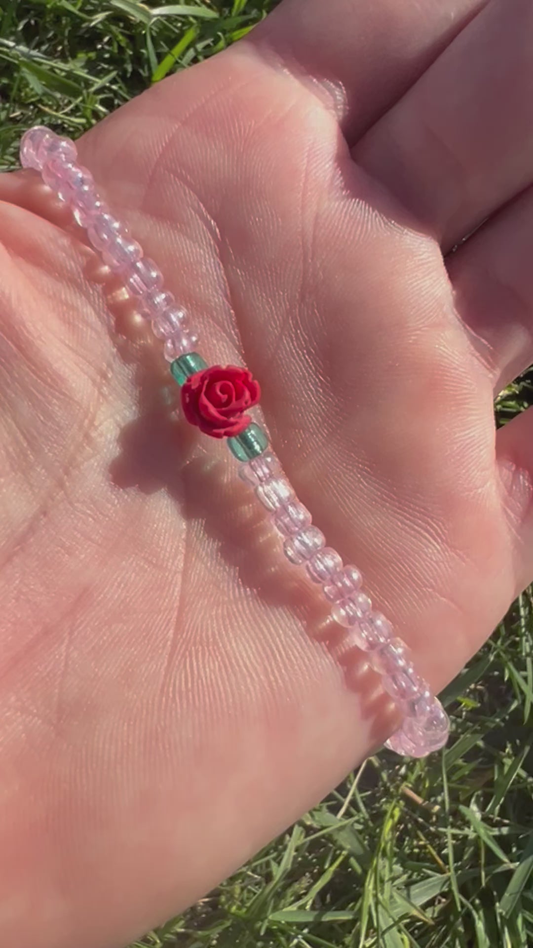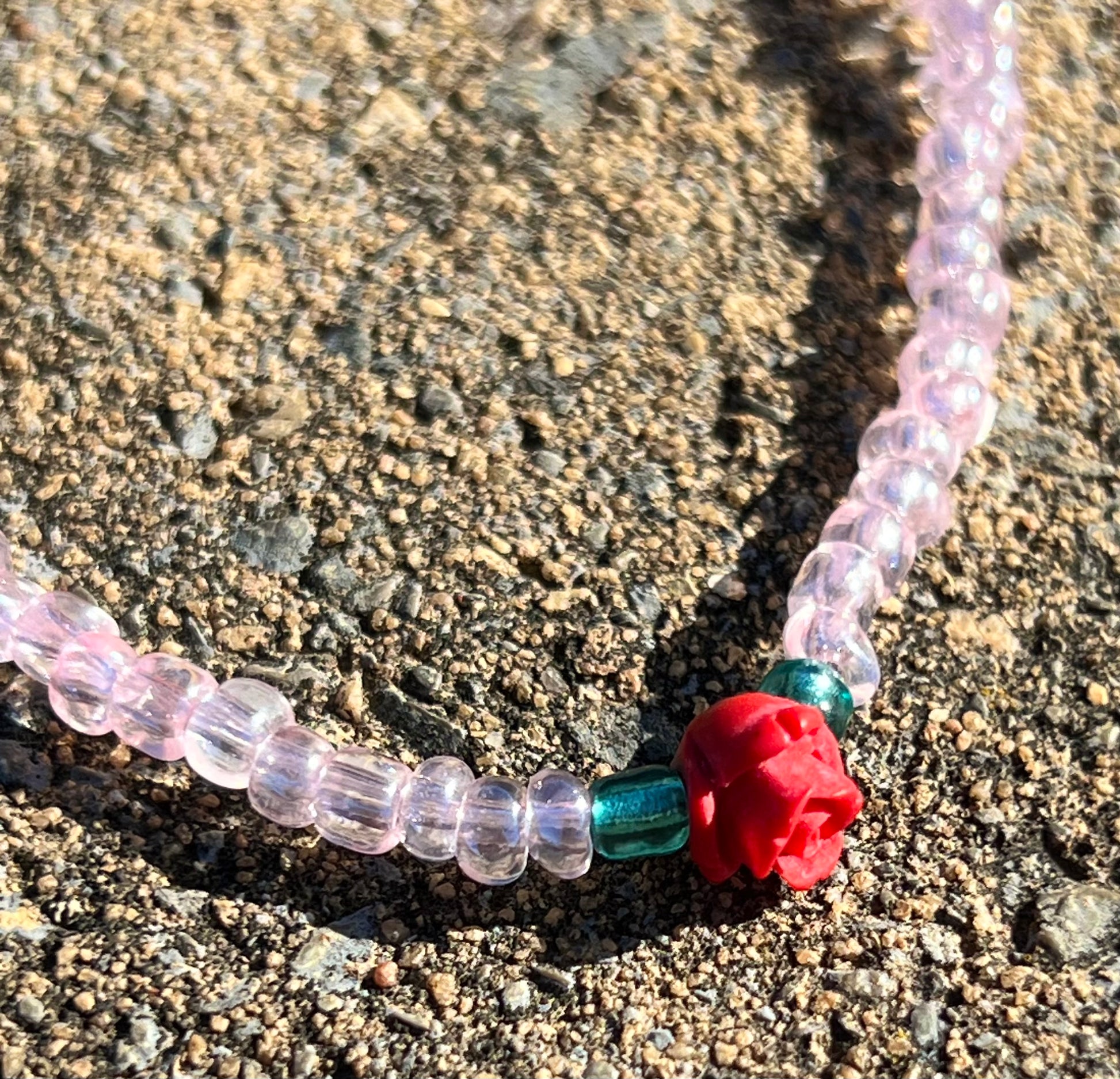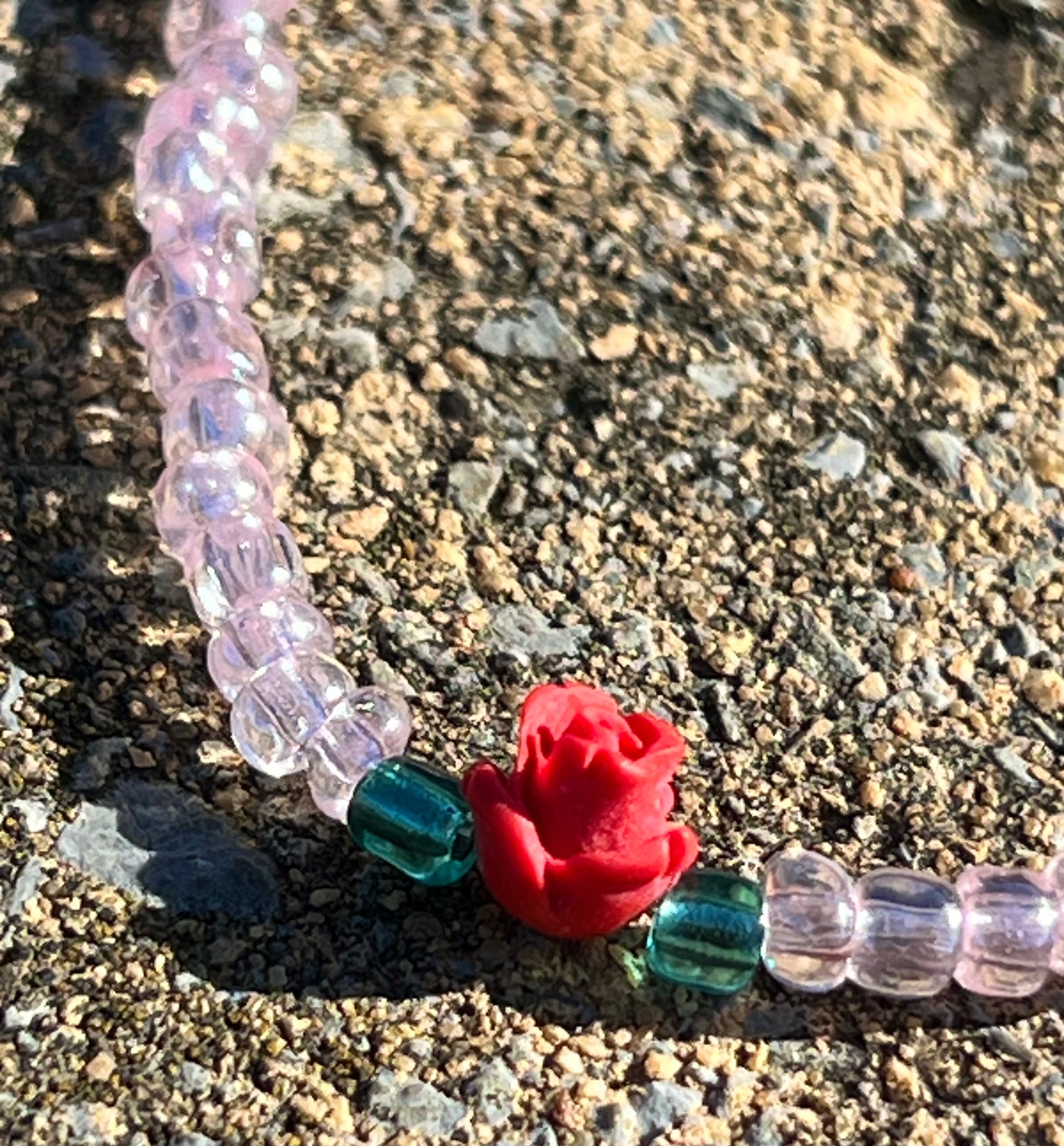 Perfectly little rose bead with teal & pale pink iridescent glass beads.