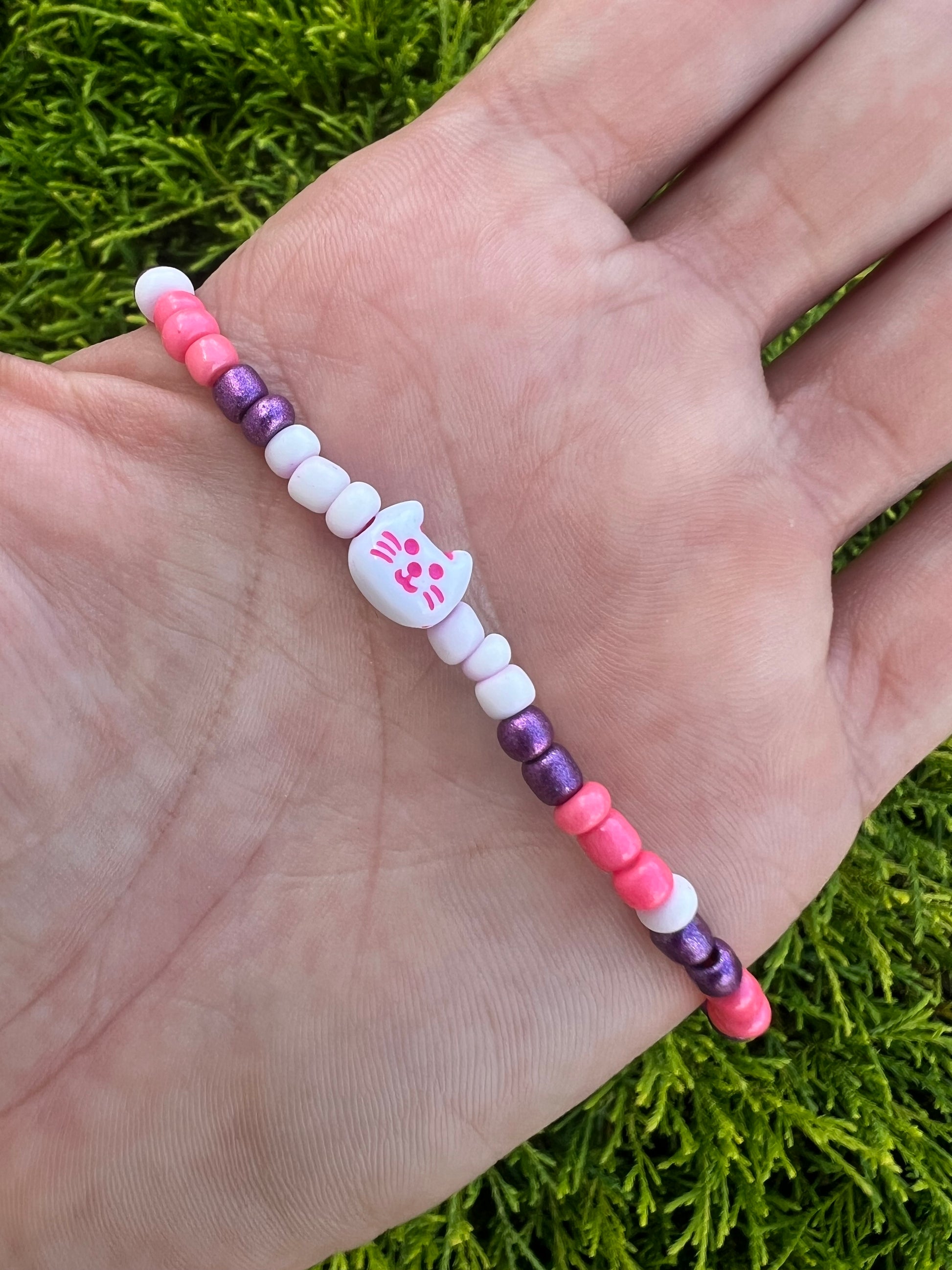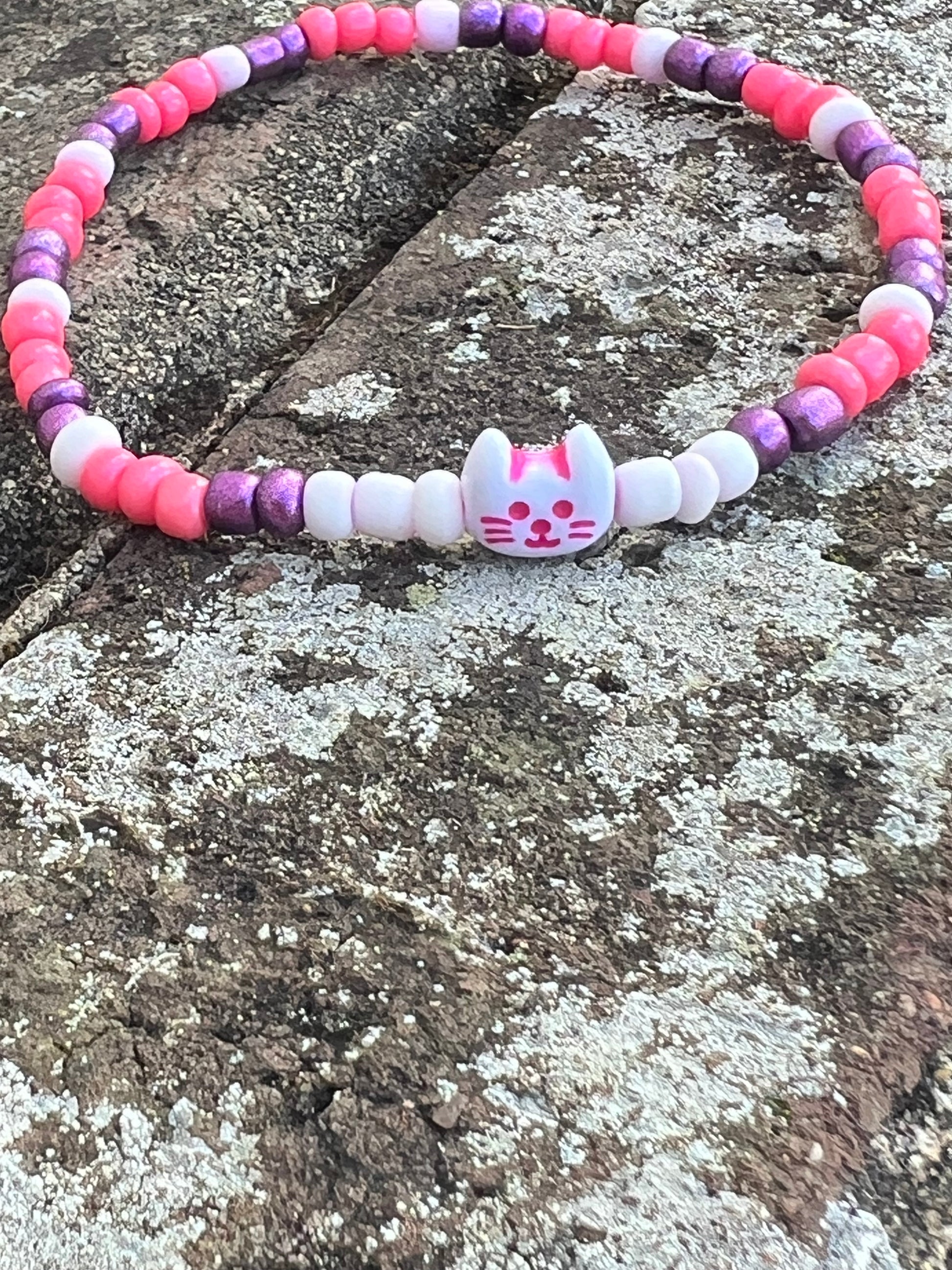 Adorable cat face surrounded by soft lilac & pearlized purple & pink glass seed beads.