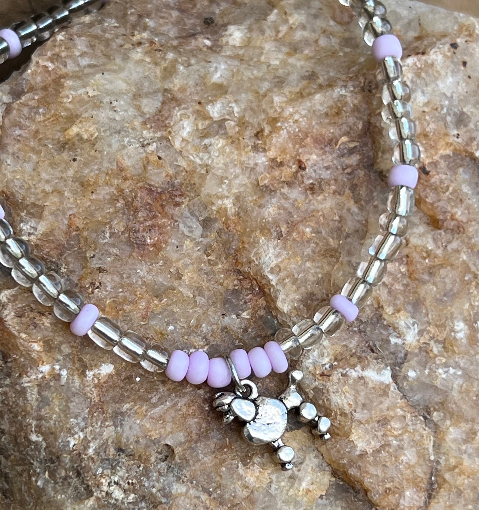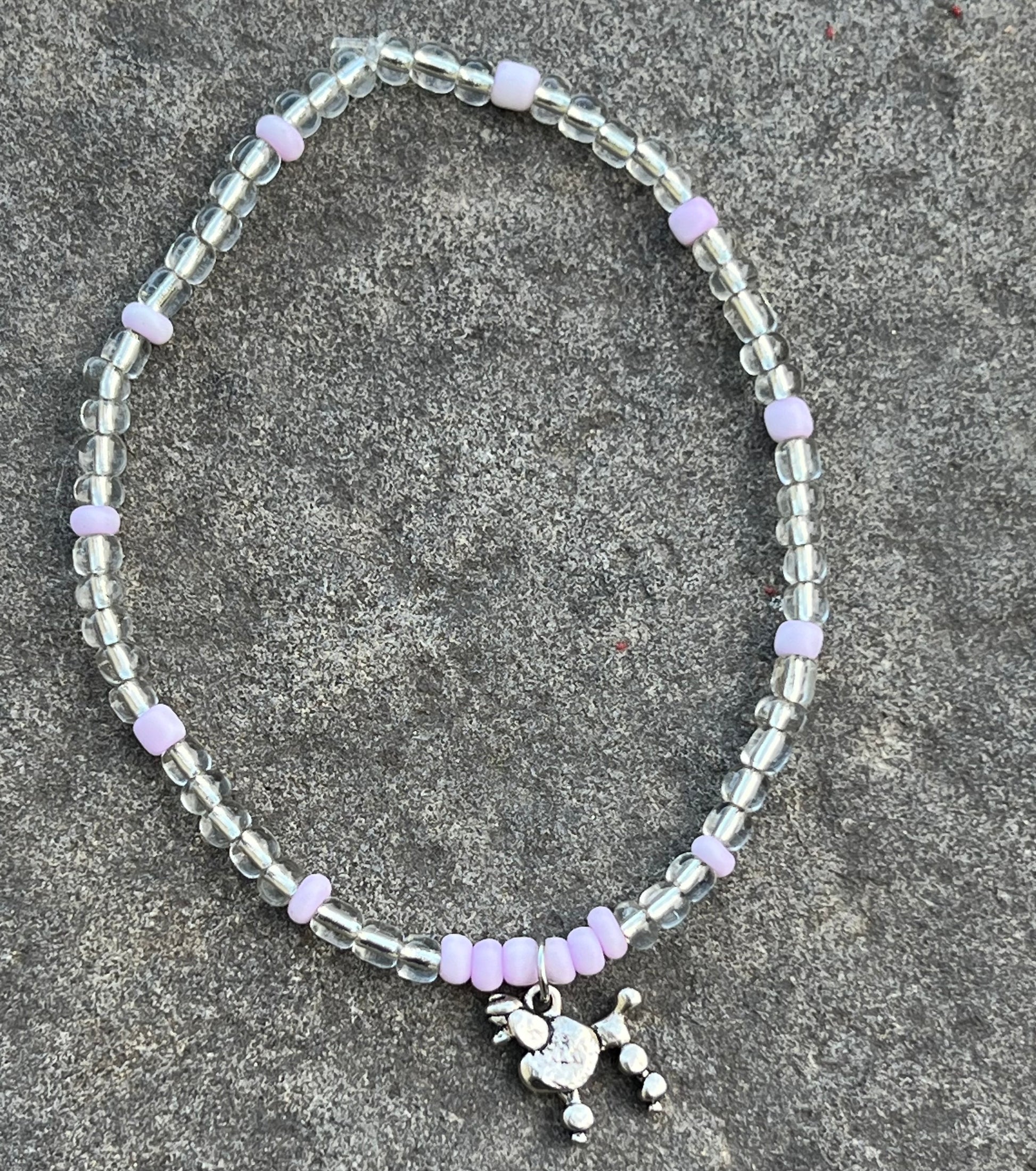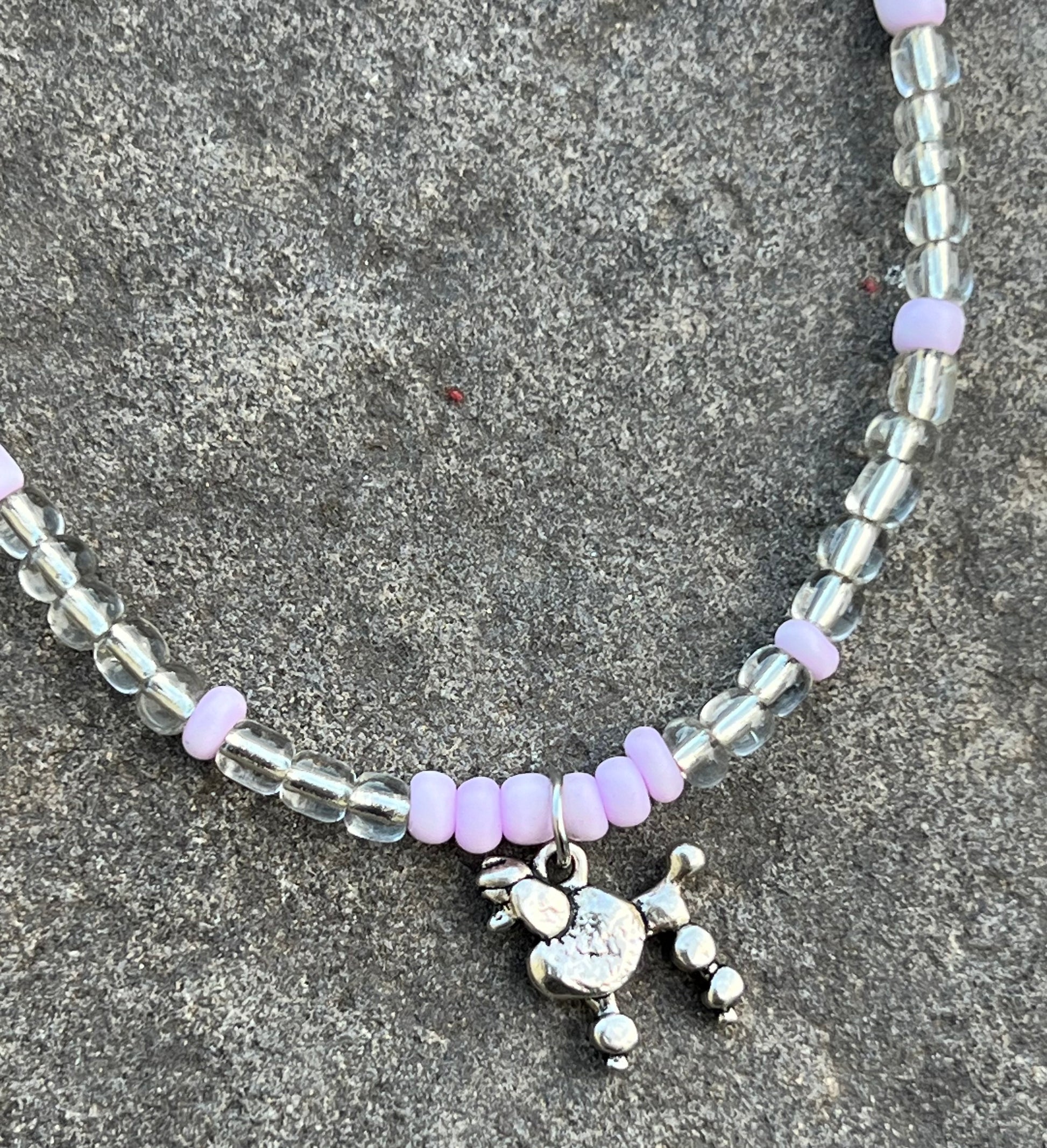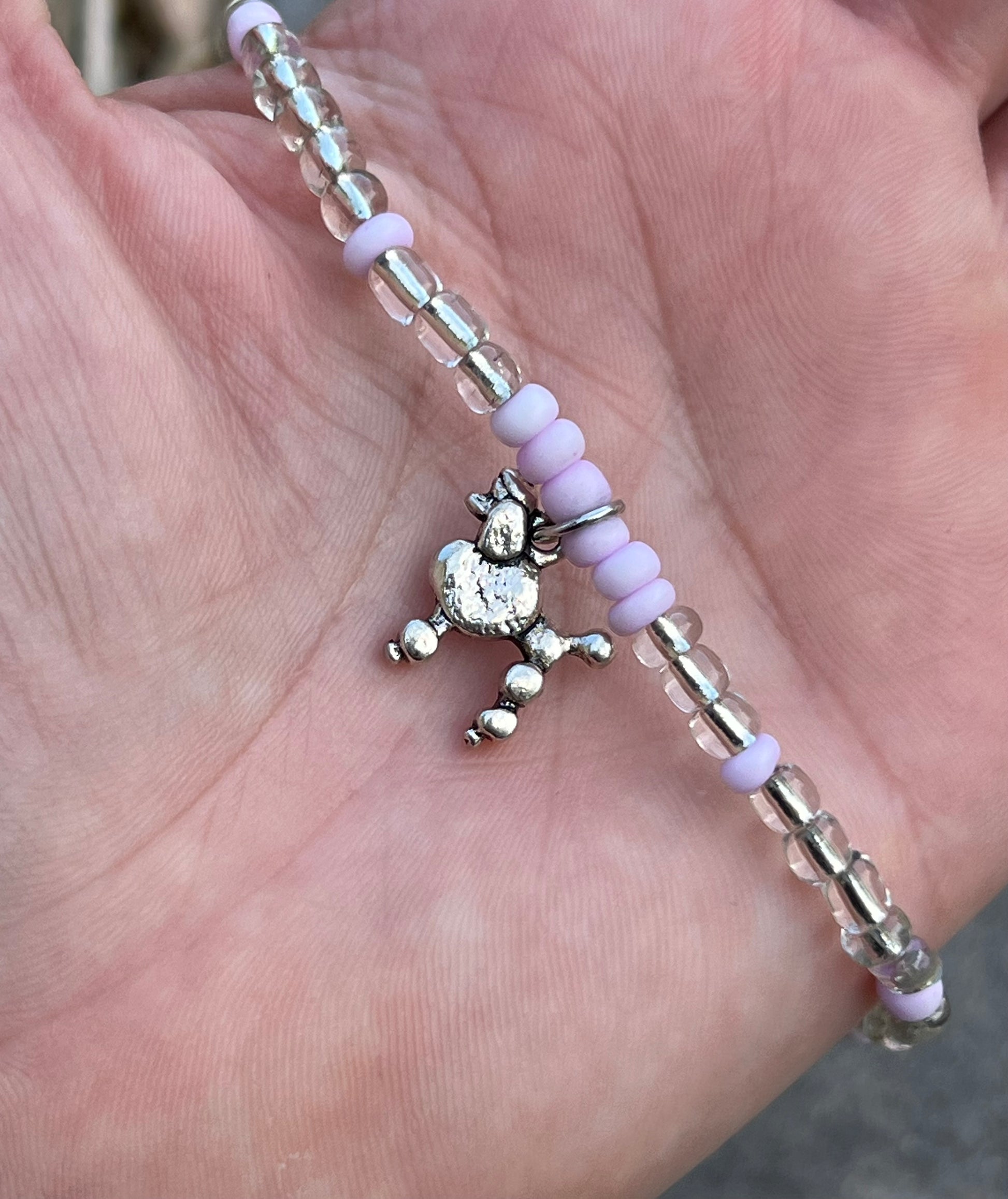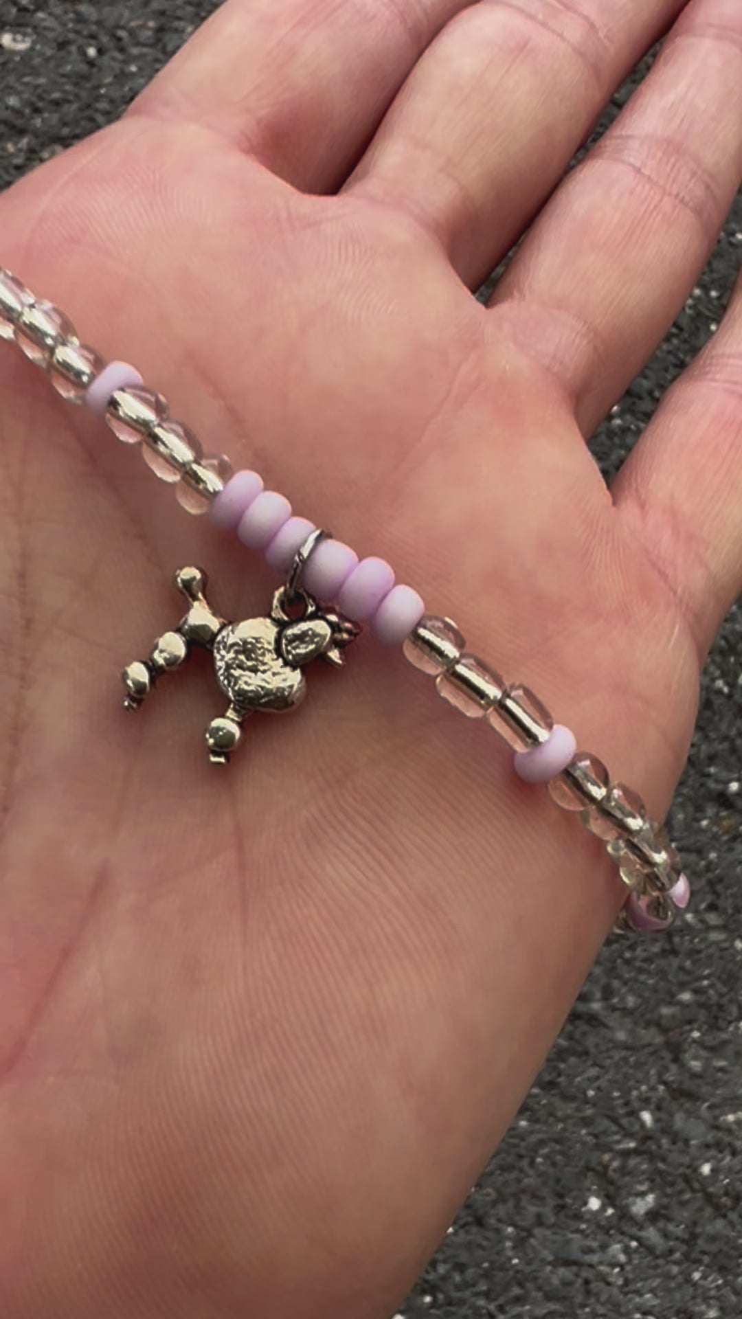 Cute poodle charm surrounded by clear & lilac purple glass seed beads.