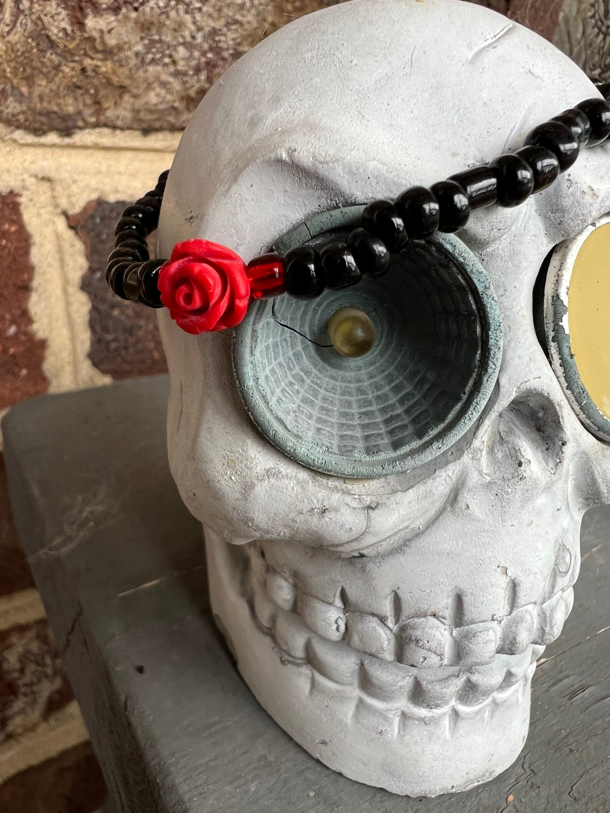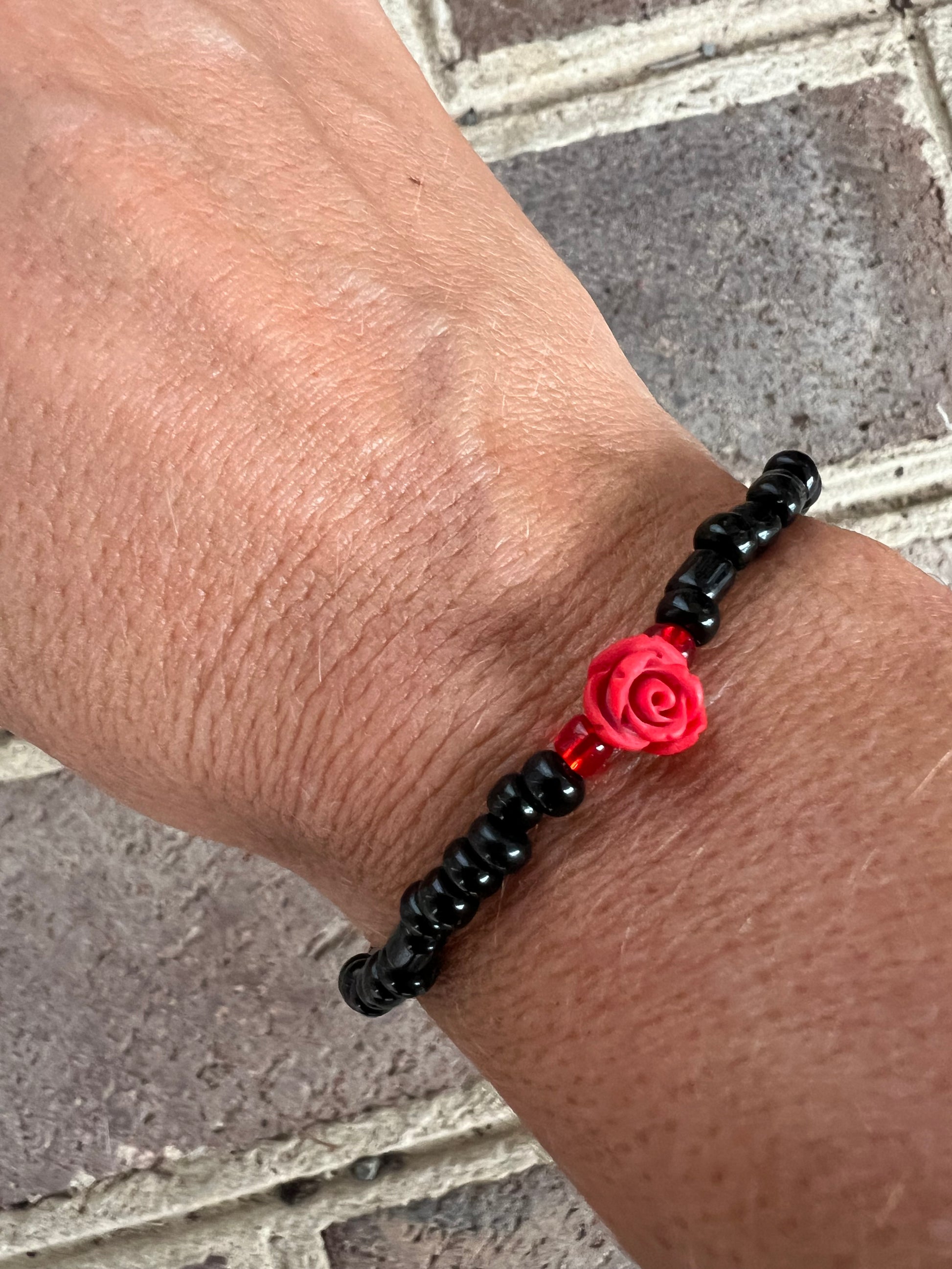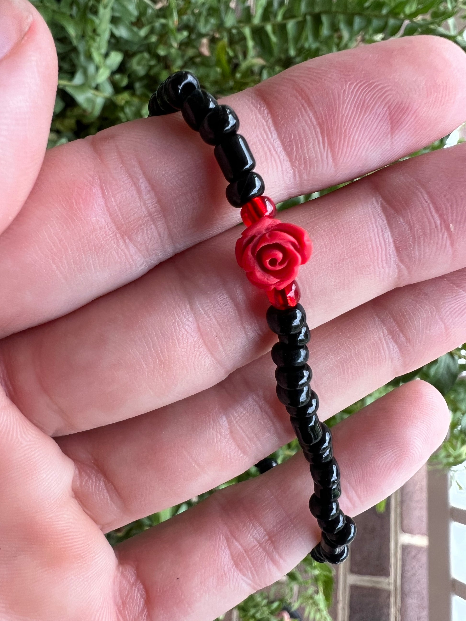 Stunning rose bloom bead with black & red glass seed beads. Simple yet beautiful. Perfect to layer with other anklets/bracelets.
