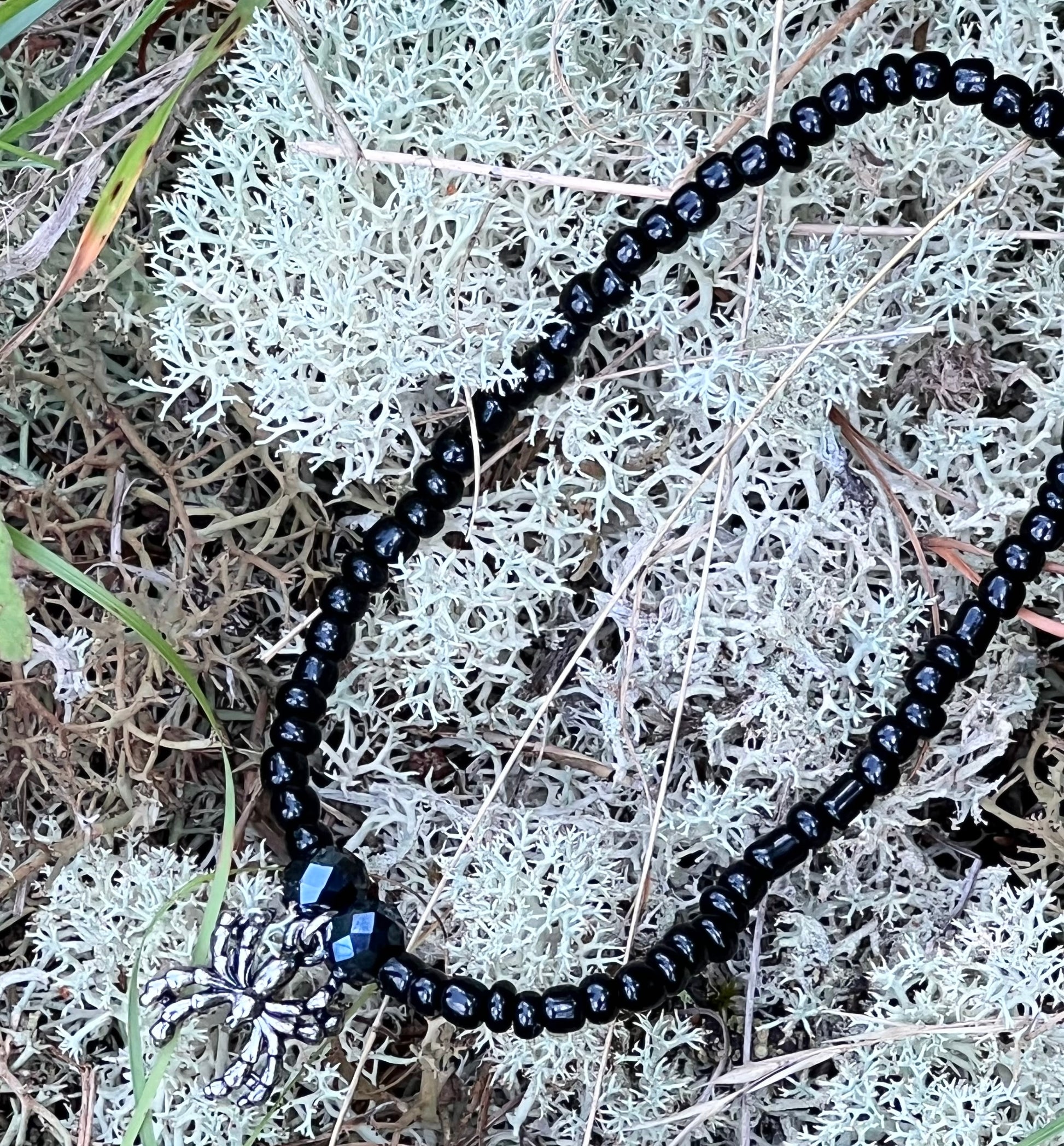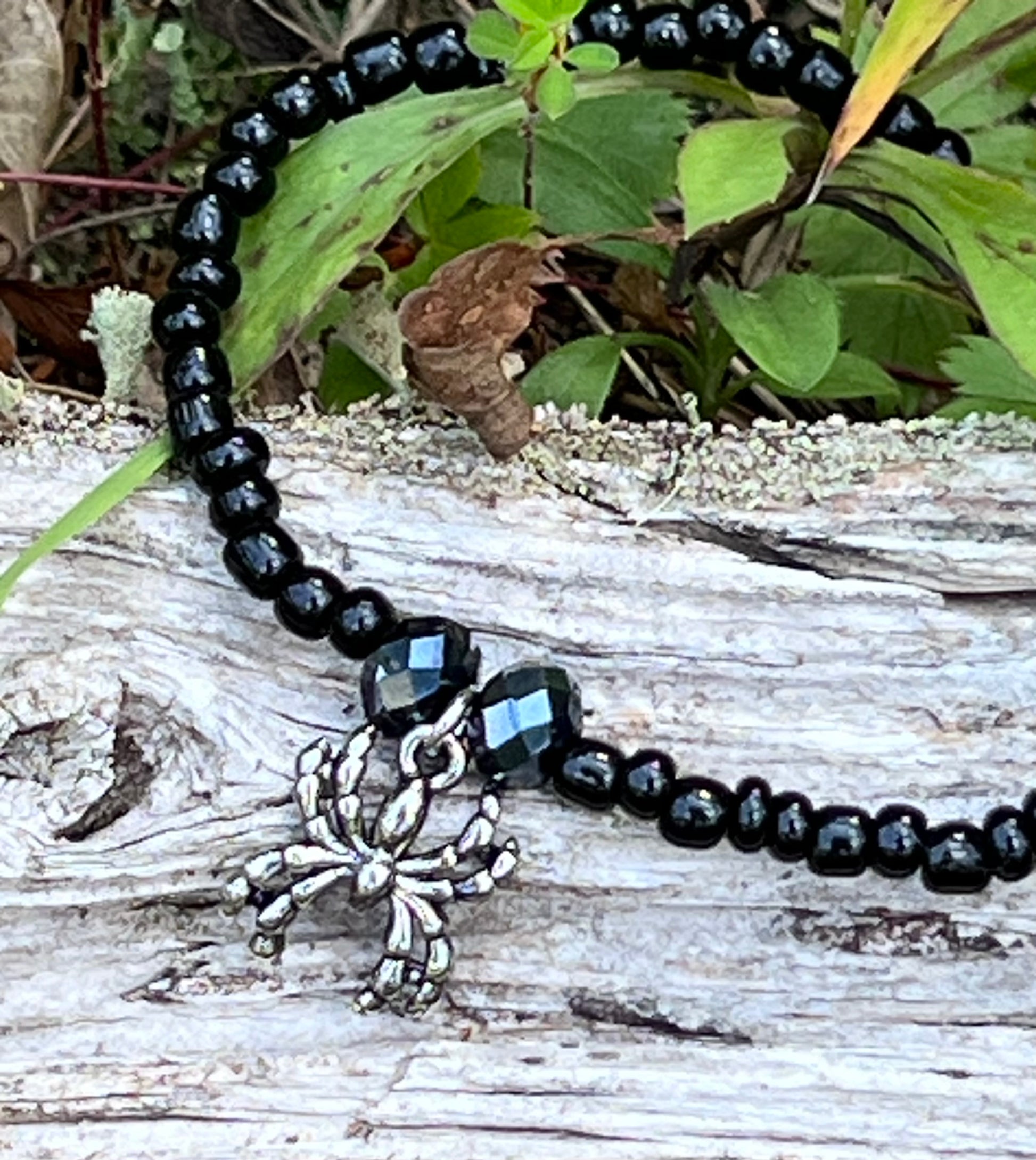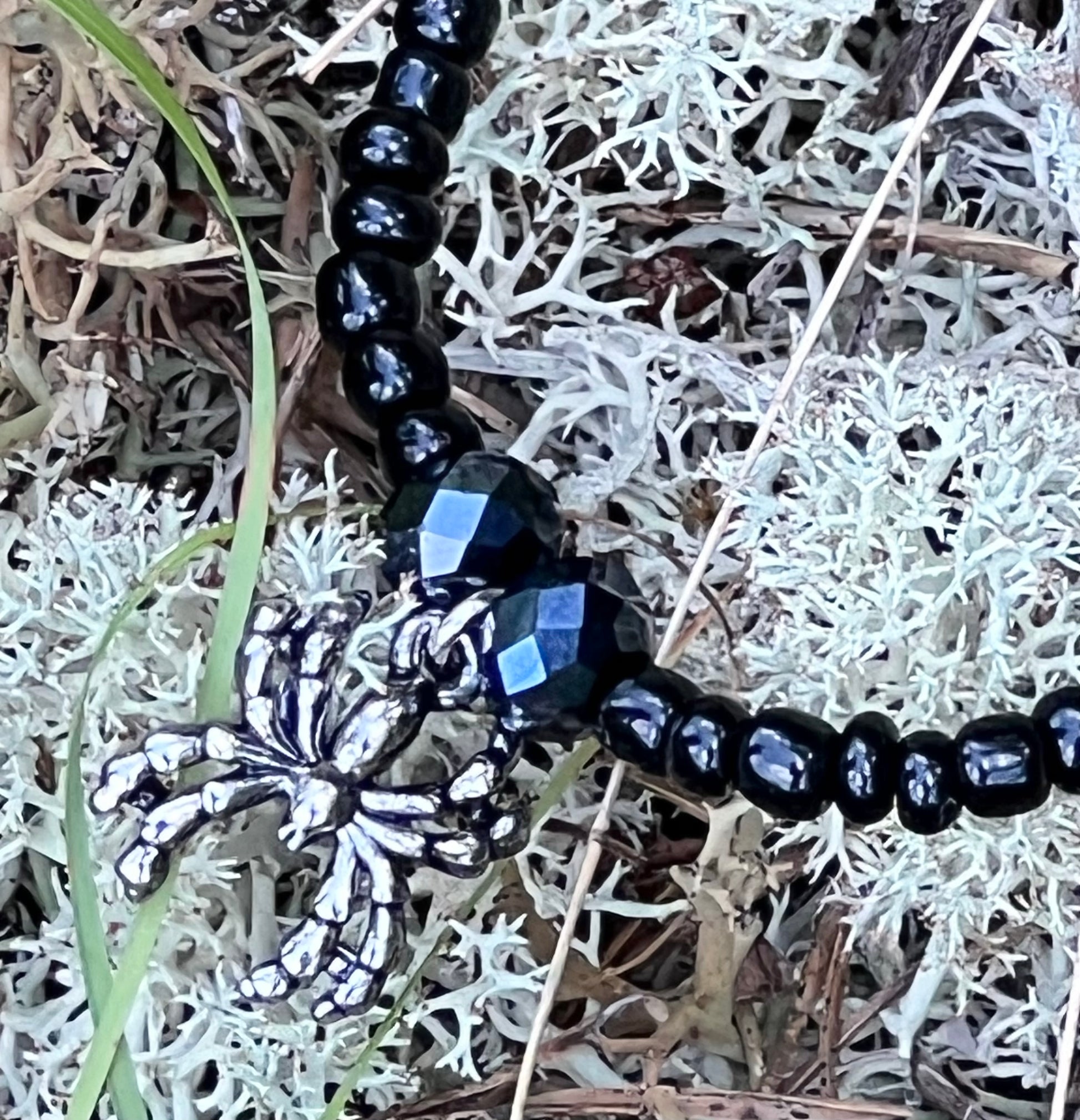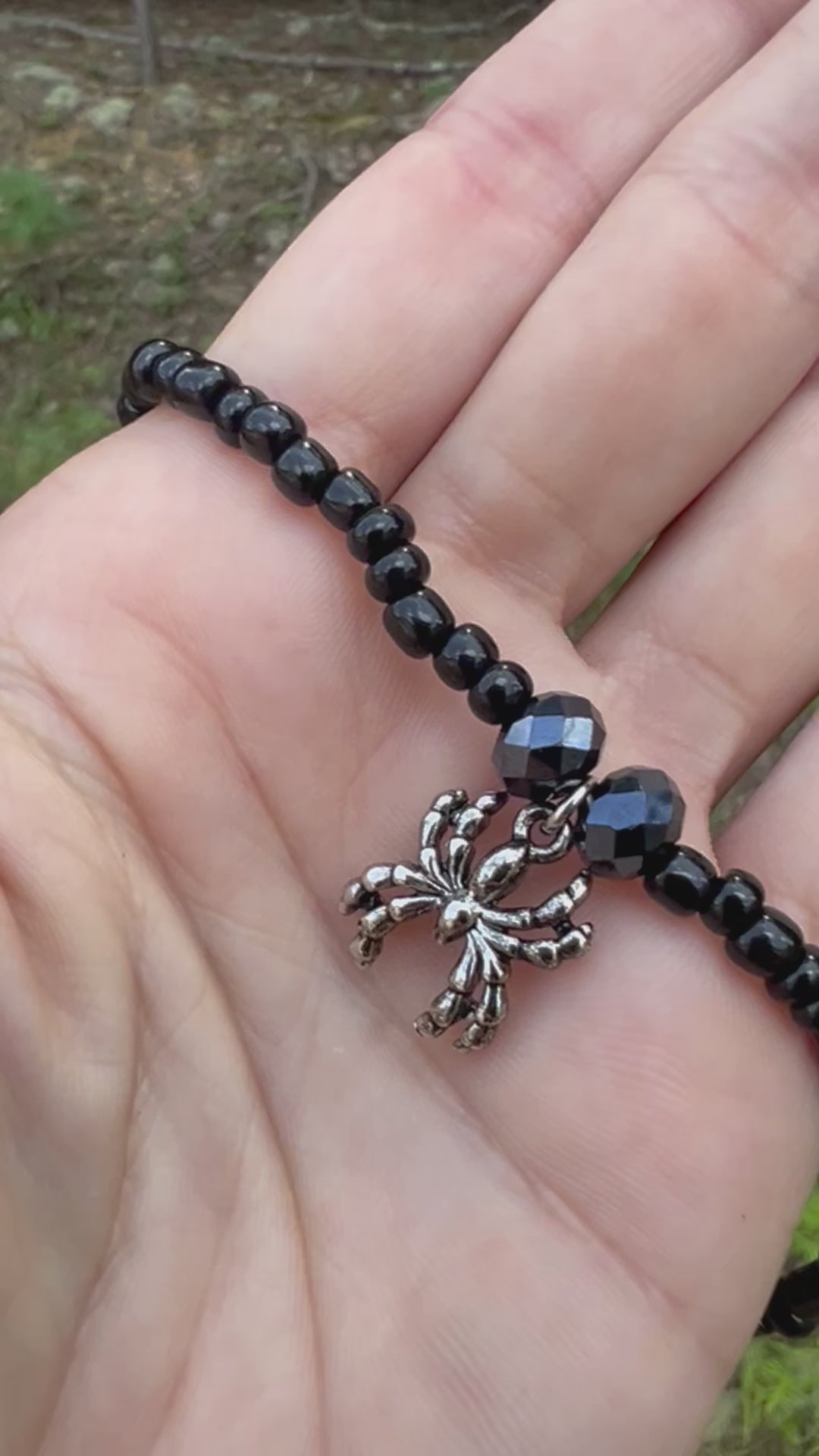 Black seed beads surround this cute spider charm. On either side, you will find a faceted bead. Adorable for those that love arachnids/spiders or for the Halloween season.