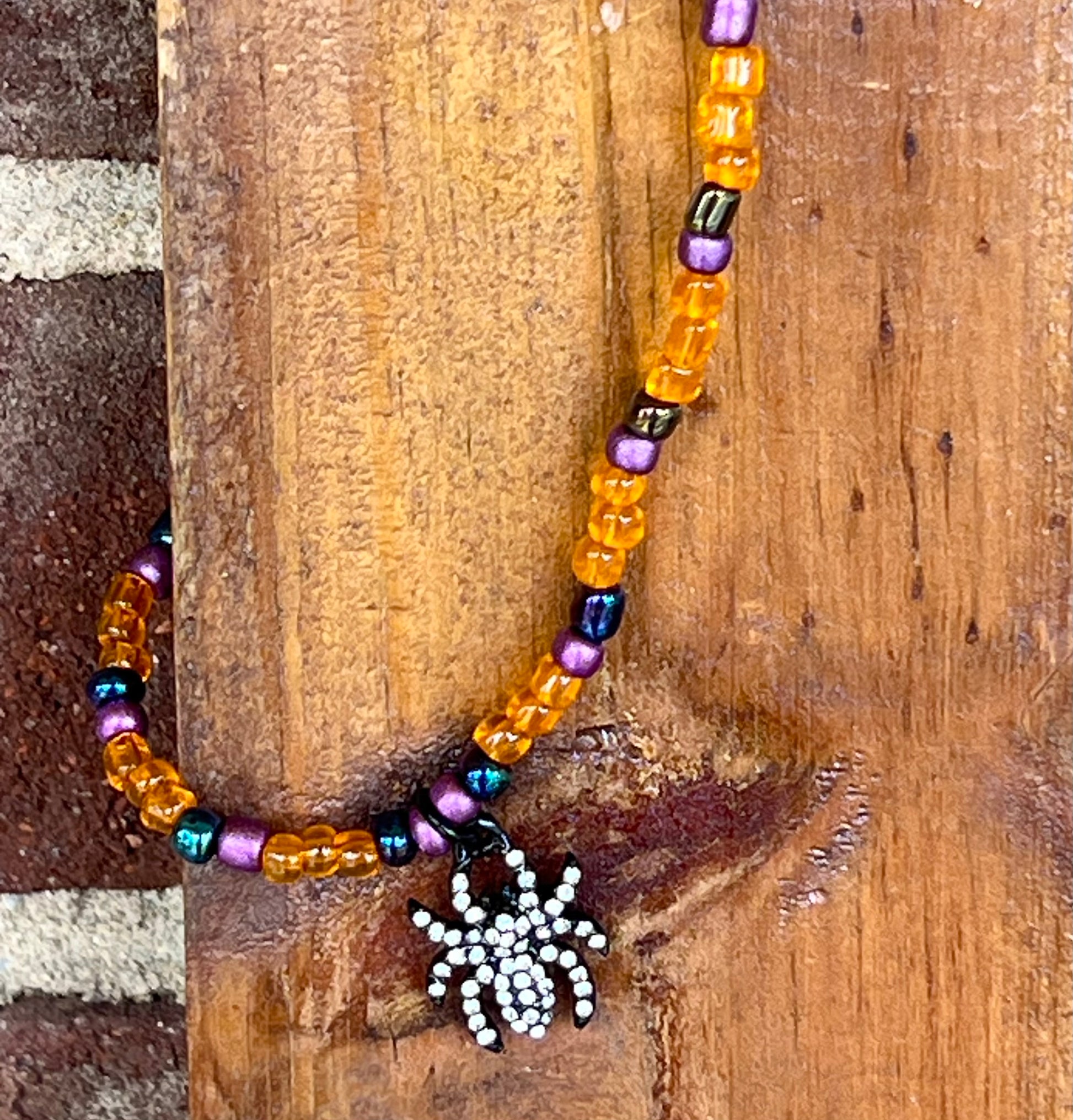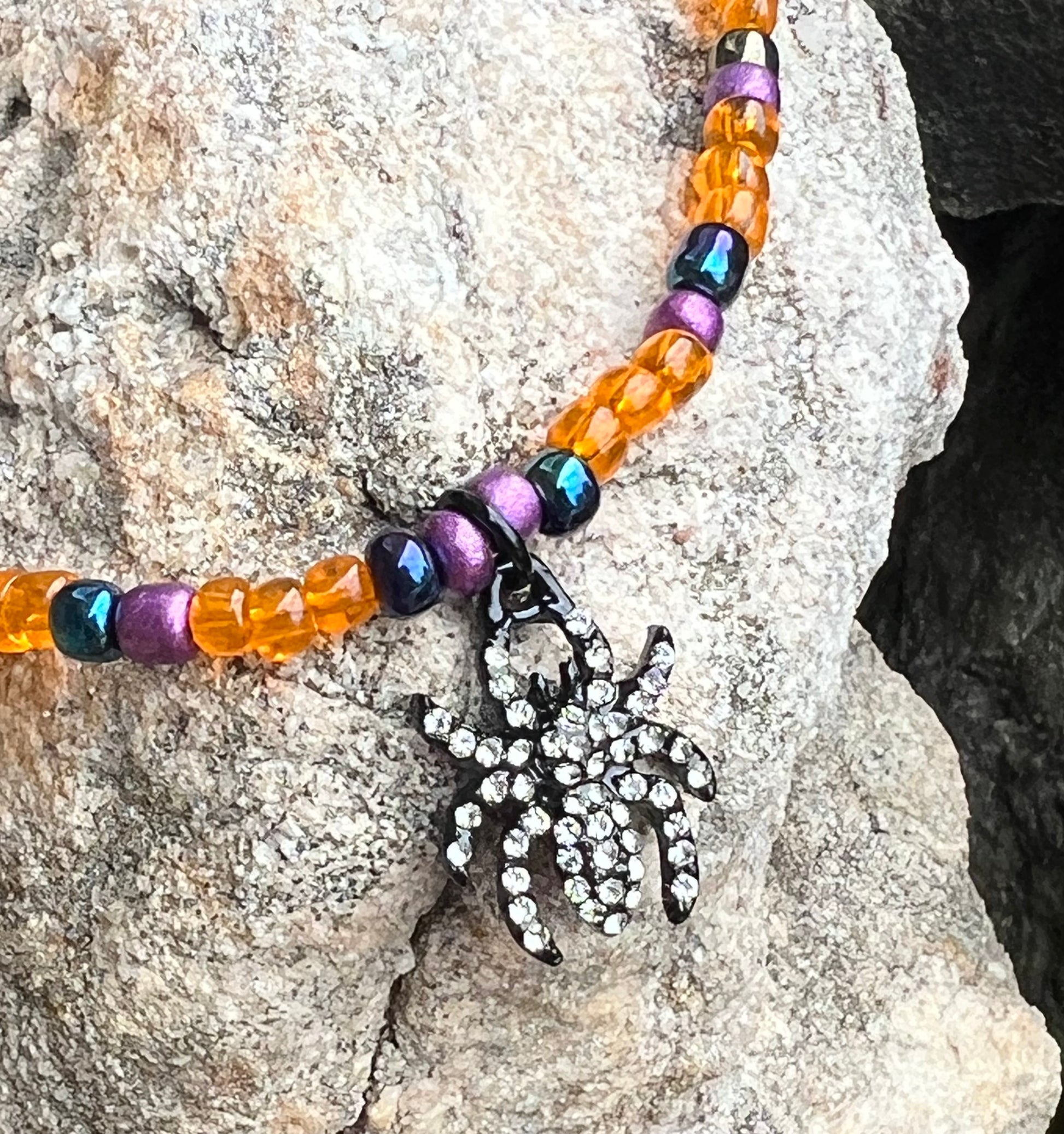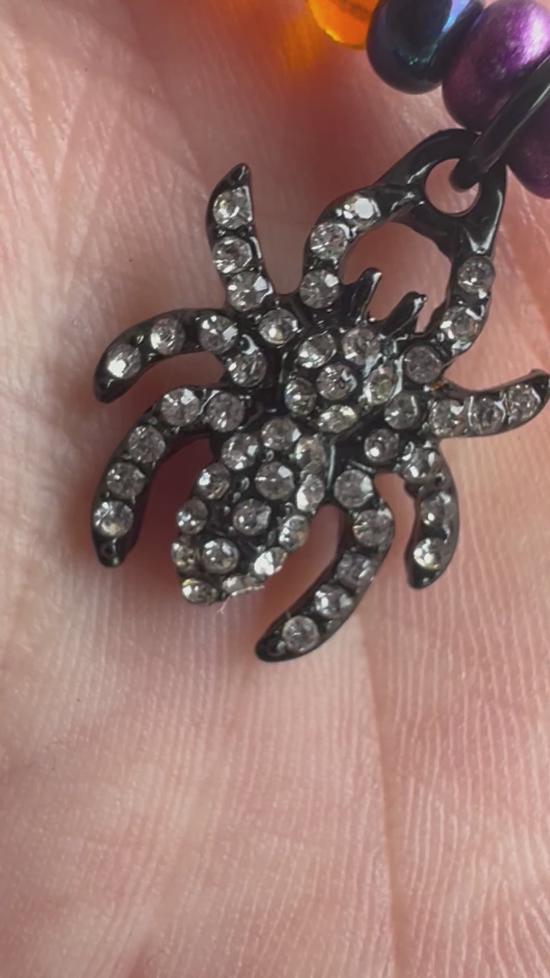 Iridescent Orange, oil spill, & black seed beads surround this cute rhinestone spider charm. On either side, you will find a faceted bead. Adorable for those that love arachnids/spiders or for the Halloween season.