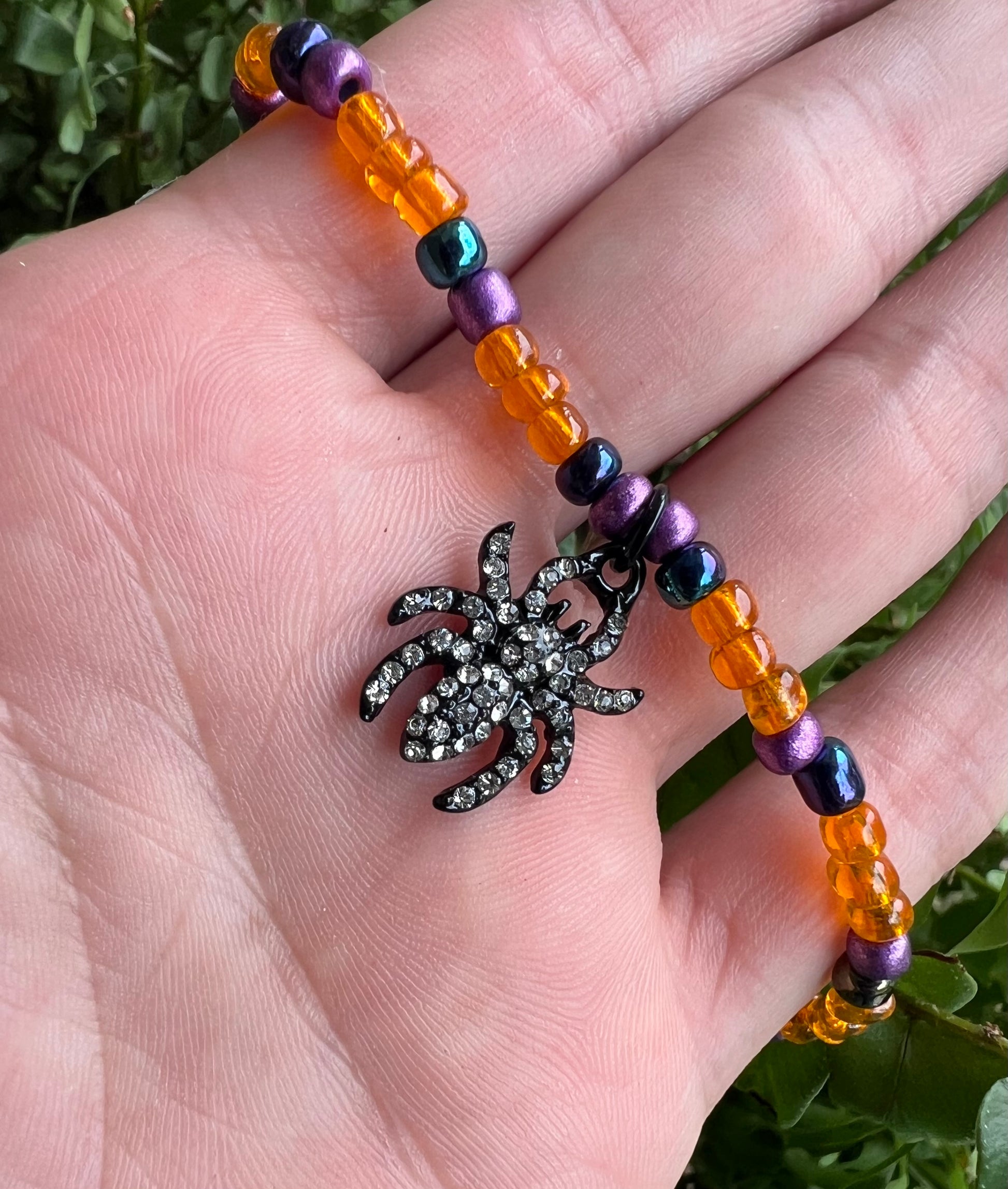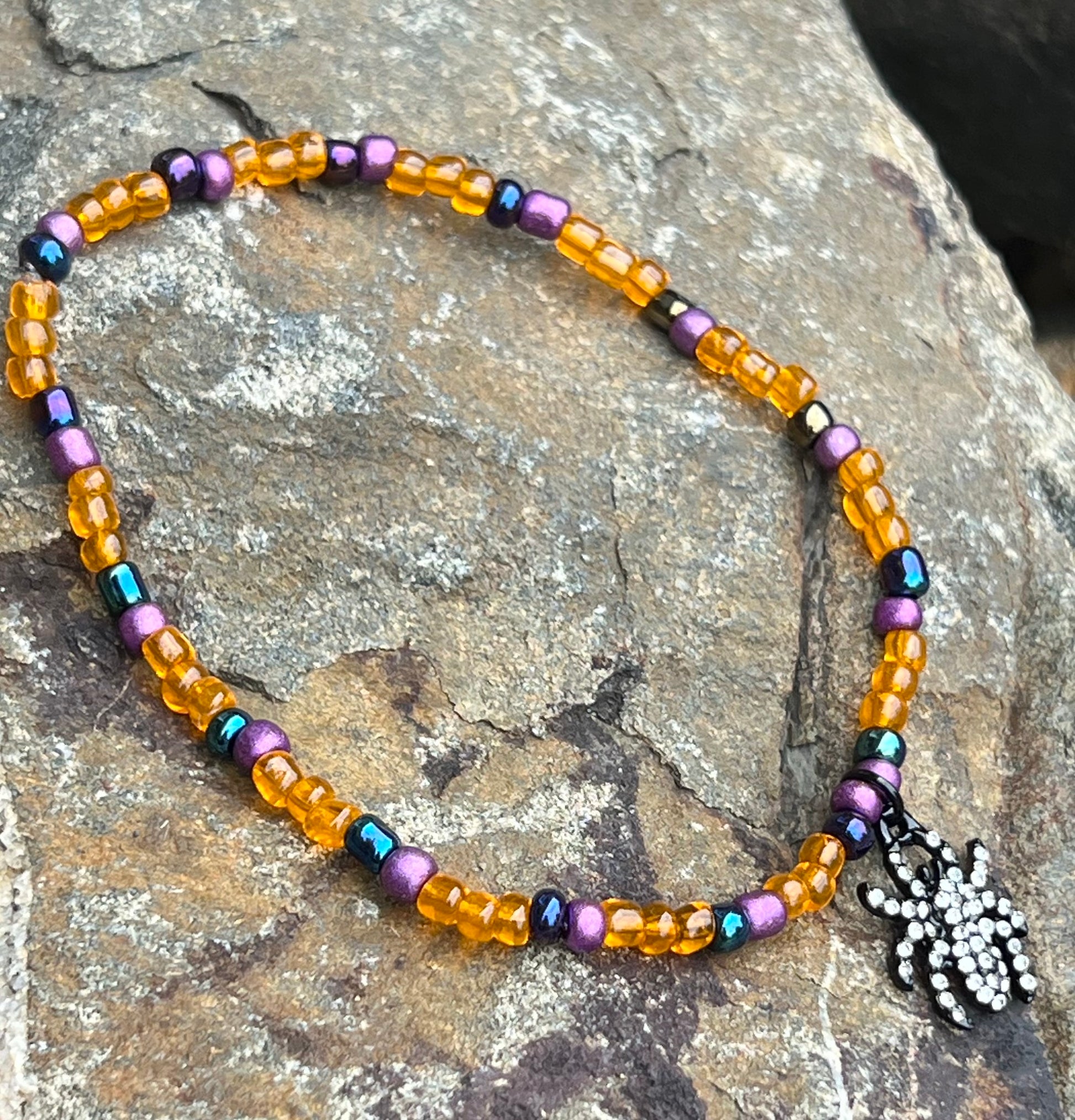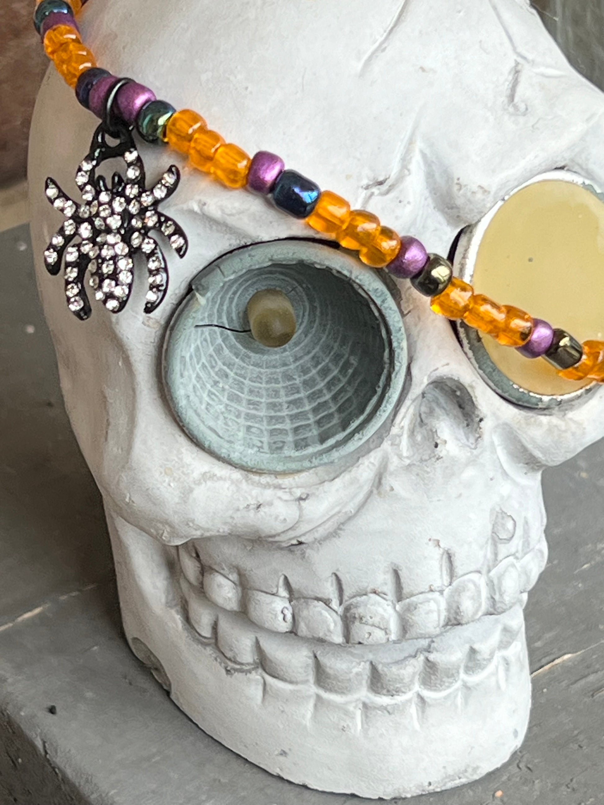 Iridescent Orange, oil spill, & black seed beads surround this cute rhinestone spider charm. On either side, you will find a faceted bead. Adorable for those that love arachnids/spiders or for the Halloween season.