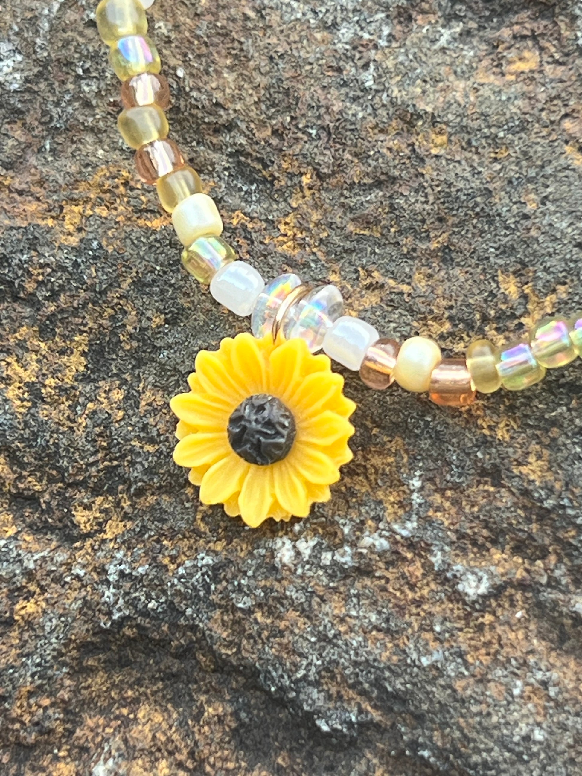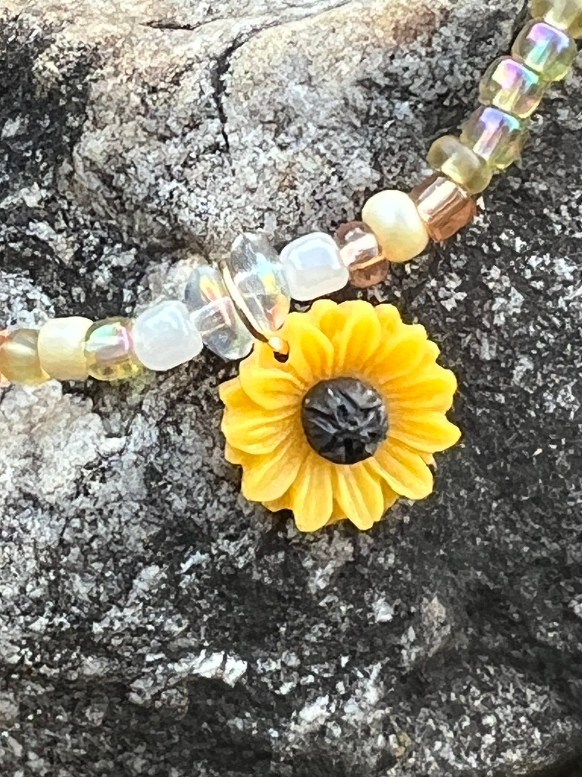 Resin blooming sunflower charm surrounded by cream, golden, & white seed beads. Beautiful iridescent disc accent beads. You’ll be a walking ray of sunshine ☀️.