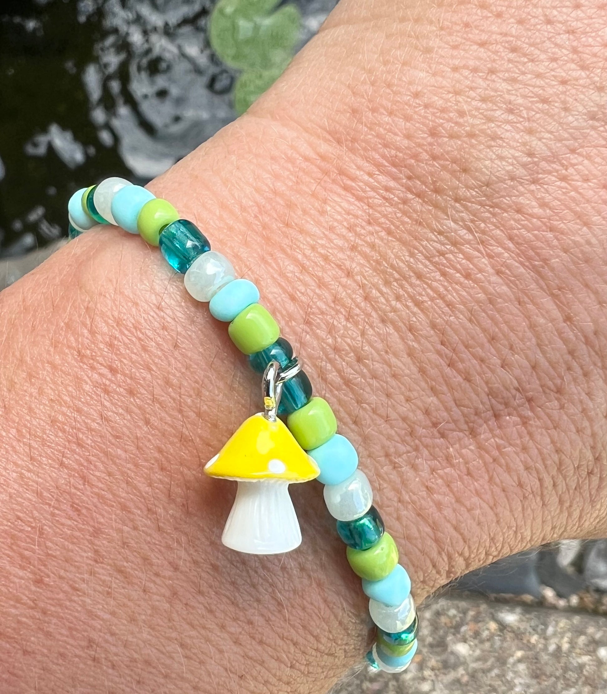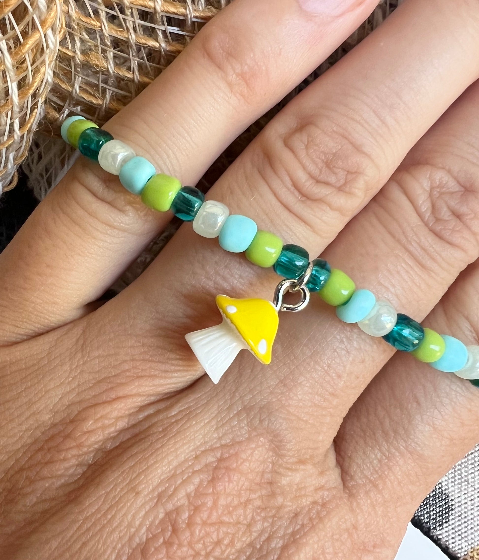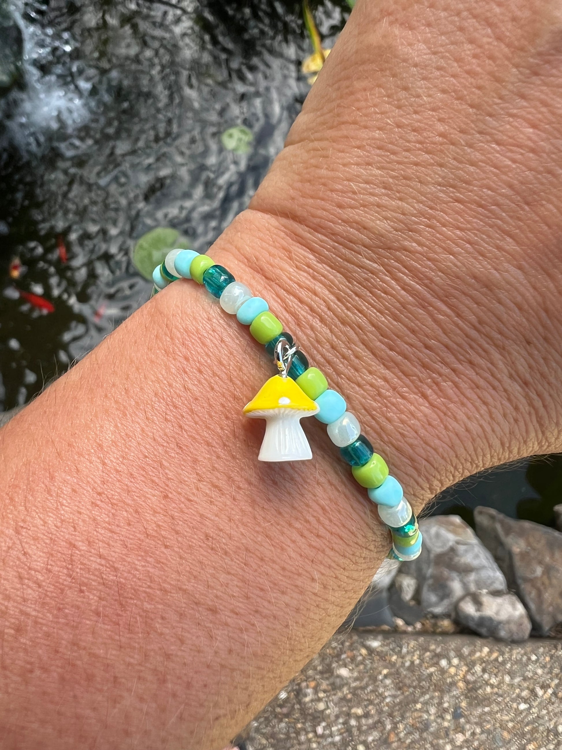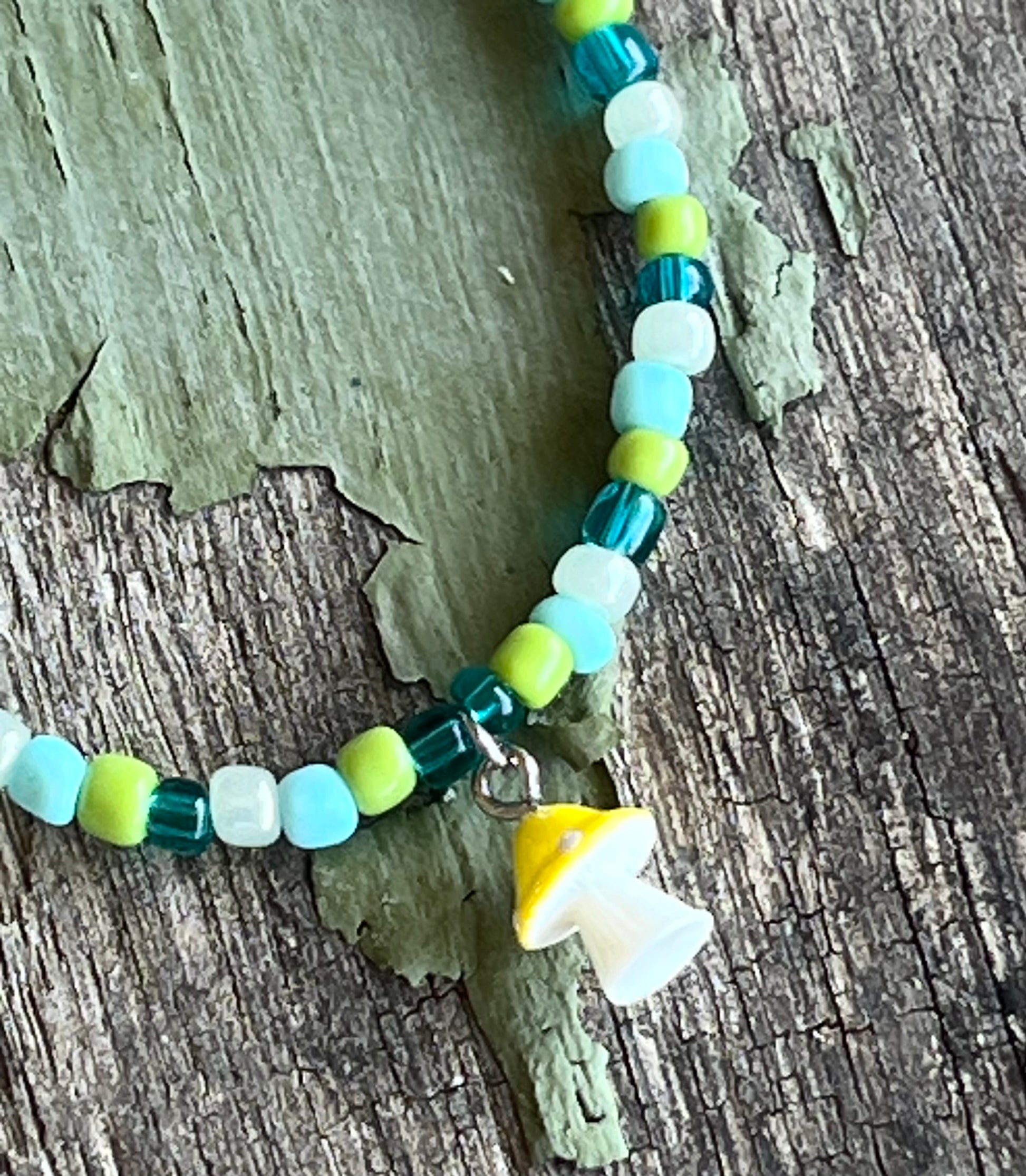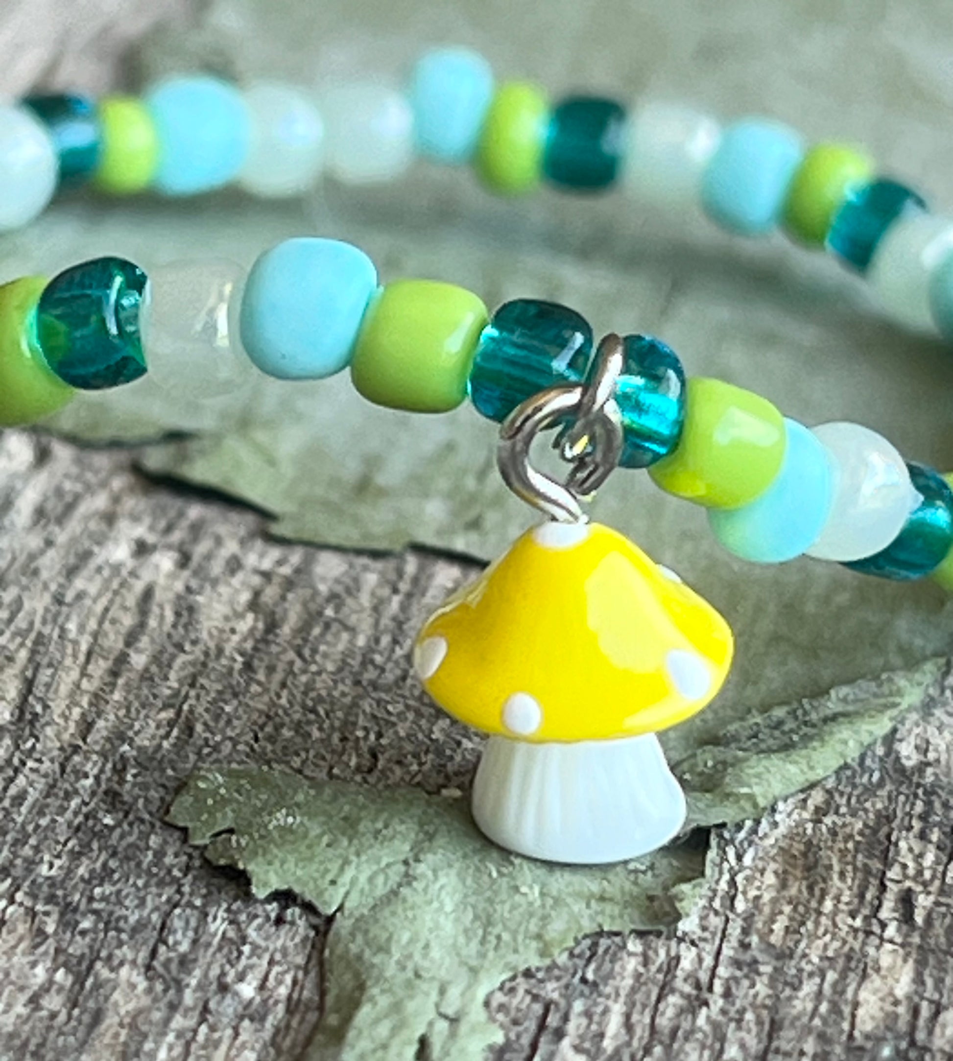 Cute little yellow & white mushroom surrounded by retro green, pink, & yellow glass seed beads.