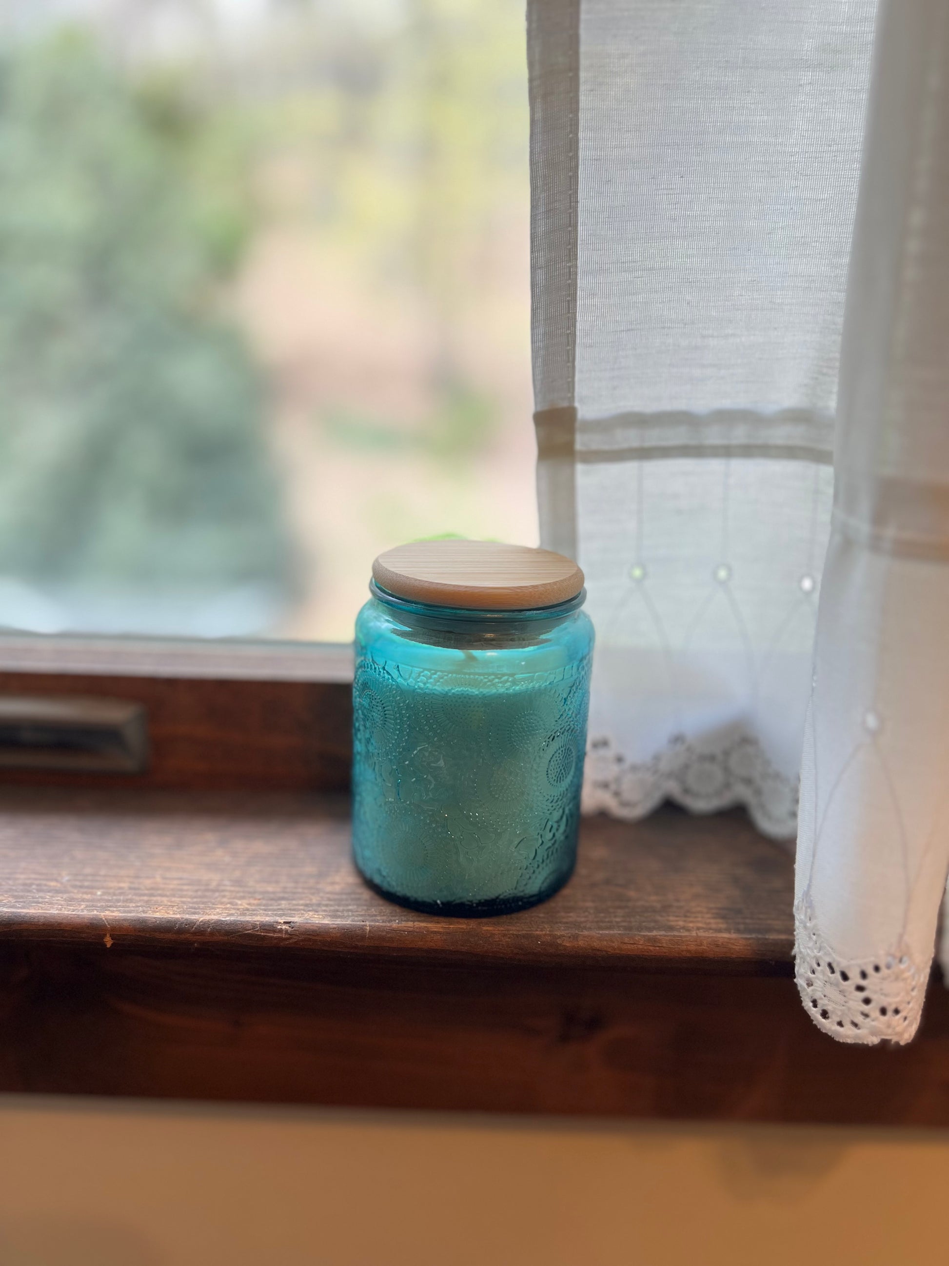 Turquoise boho glass jar. Creates a beautiful array of light when lit.
