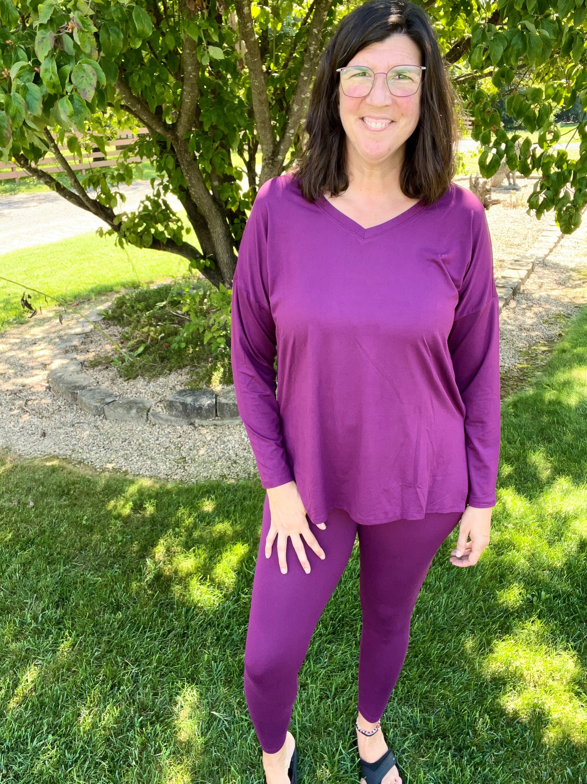 Oh so soft Zenana solid plum purple v-neck long sleeve top w/ matching leggings set!!!