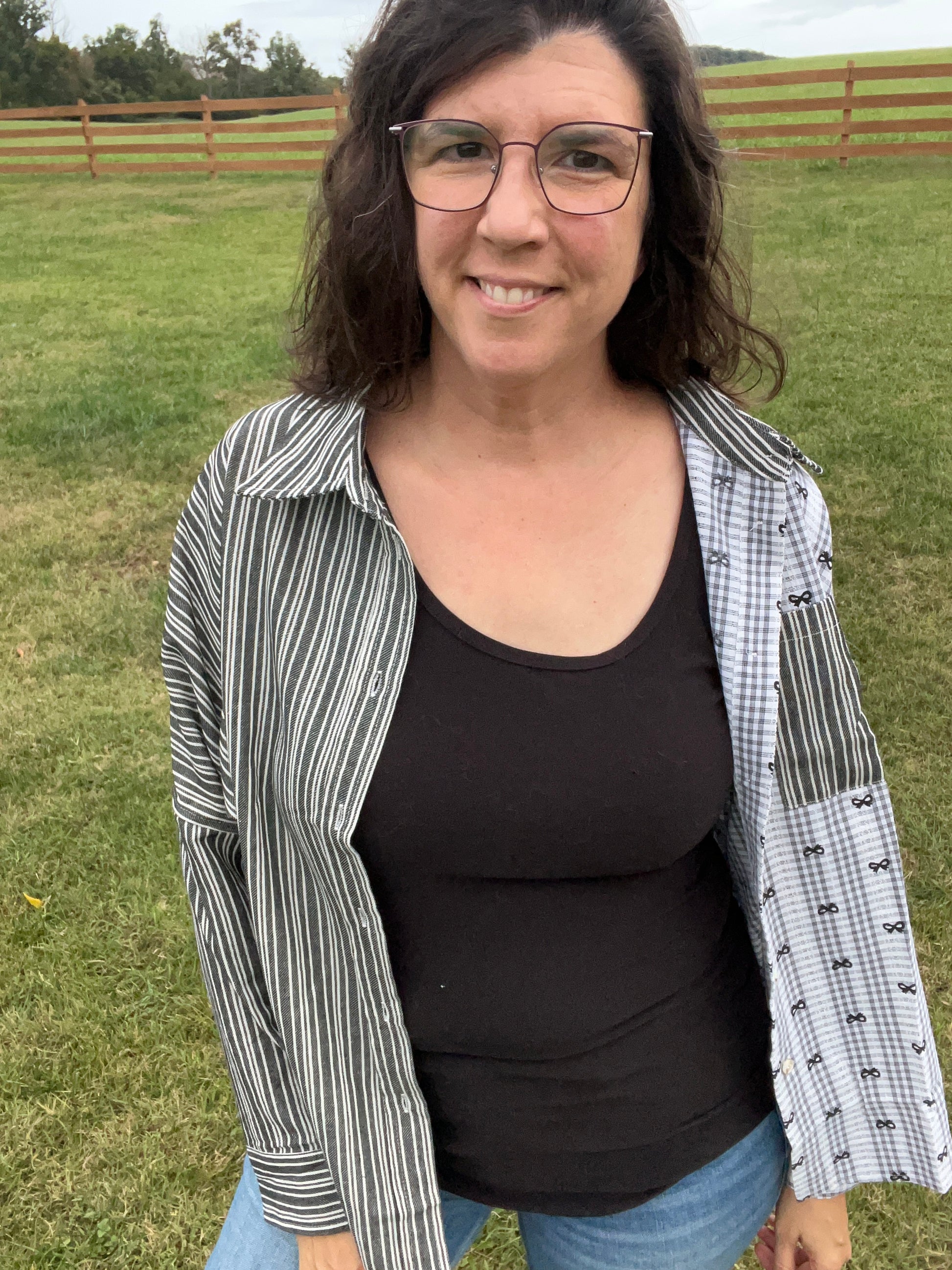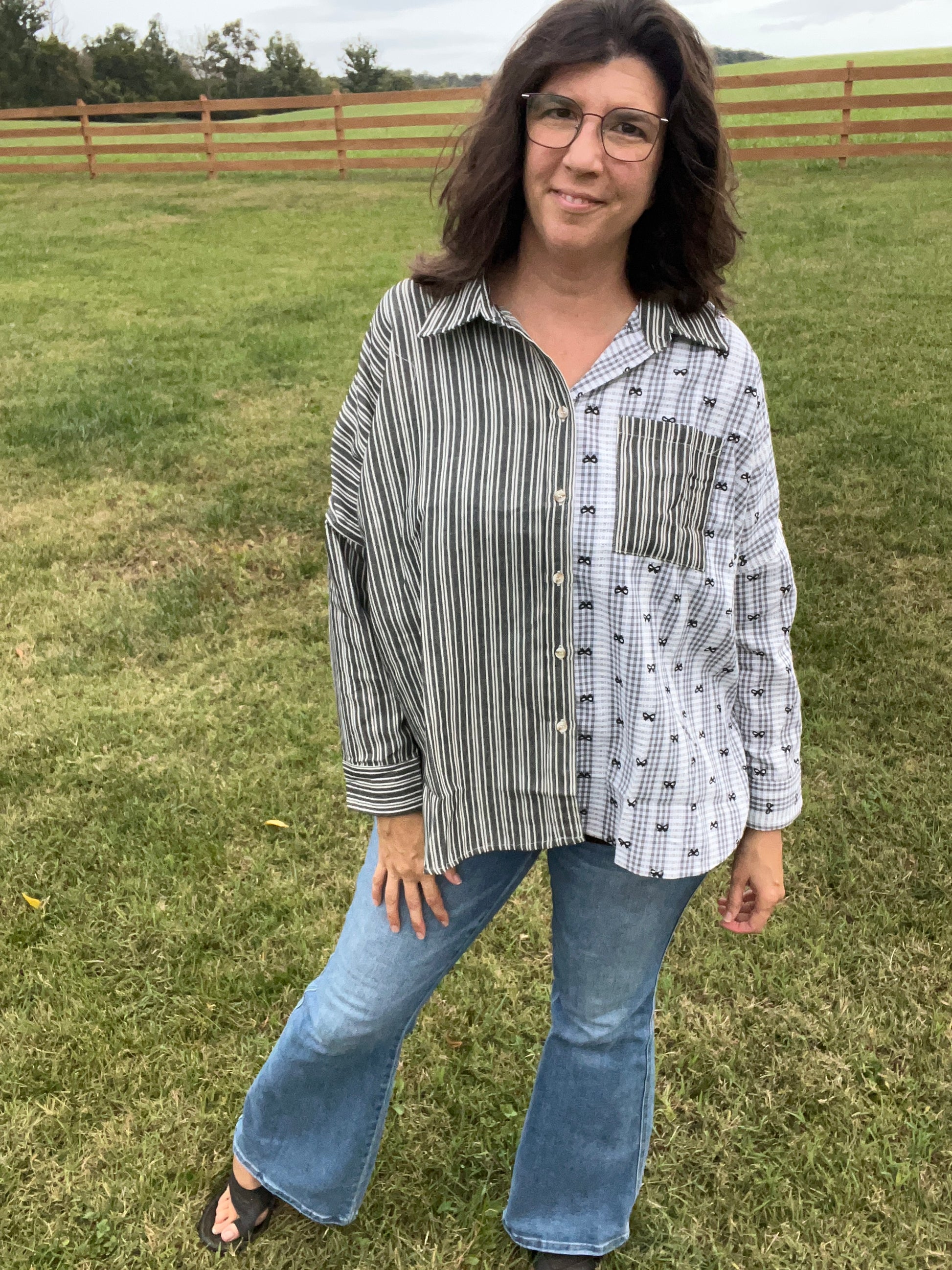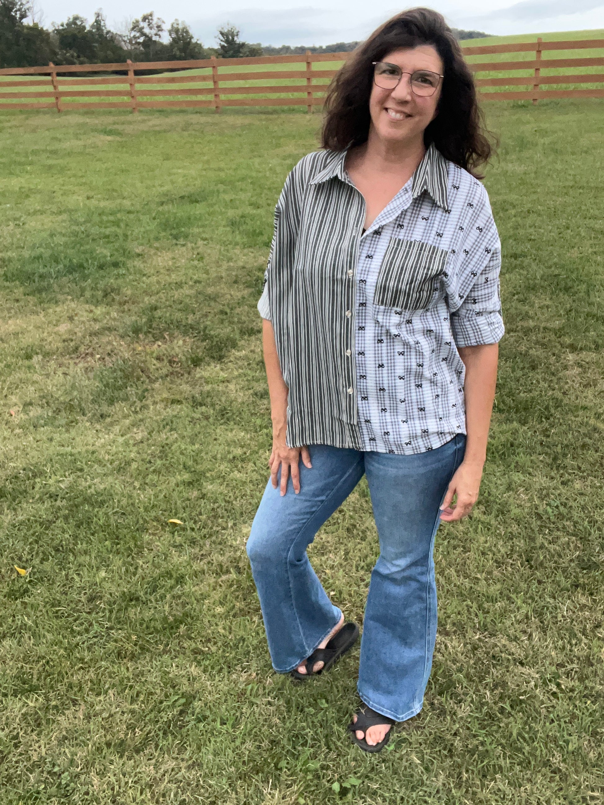 Cotton Blend Button Front Top - Mix of Bows, Lace, & Stripes