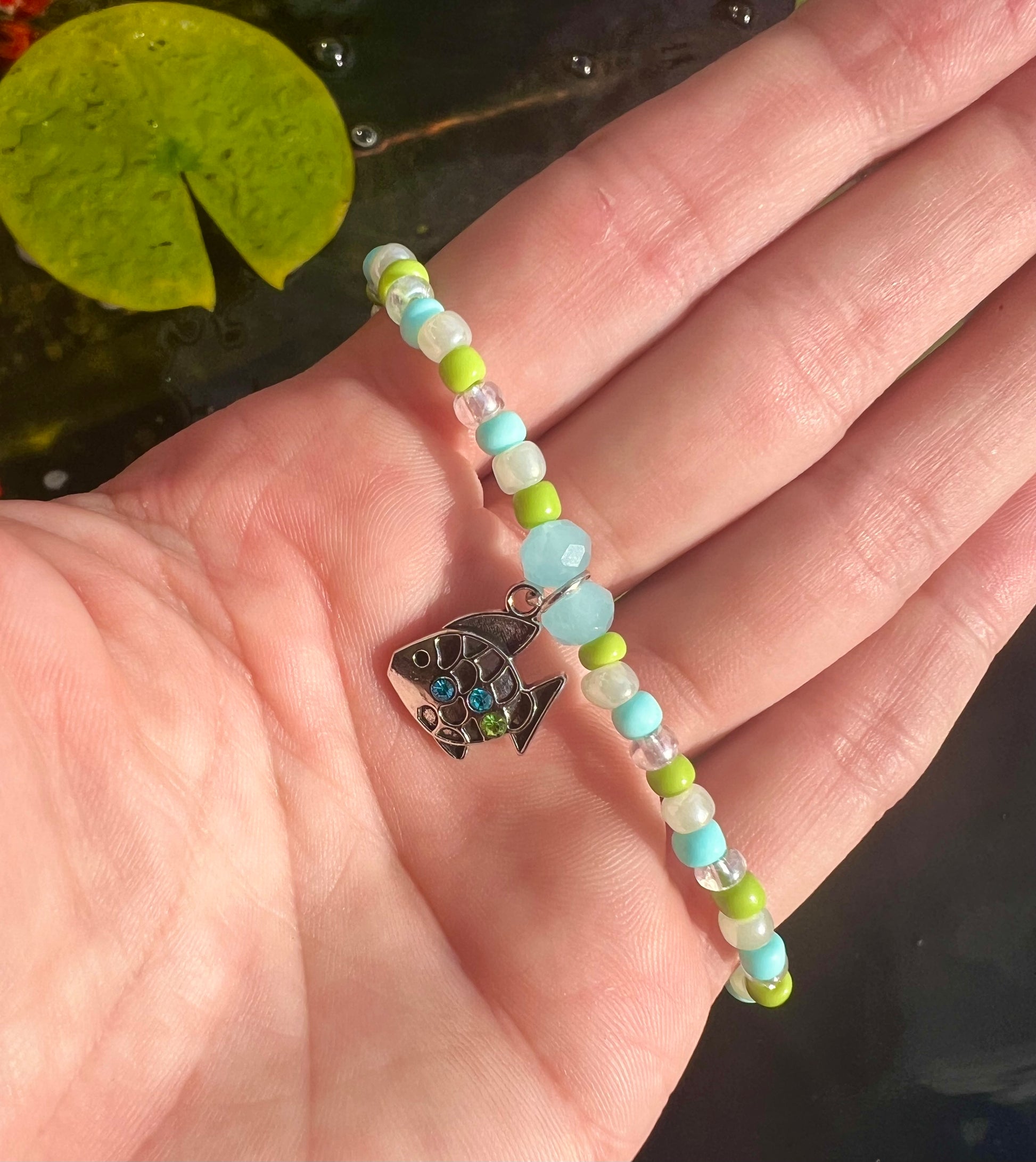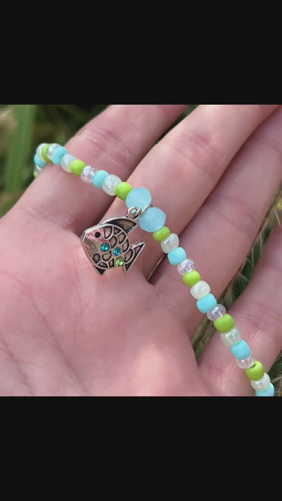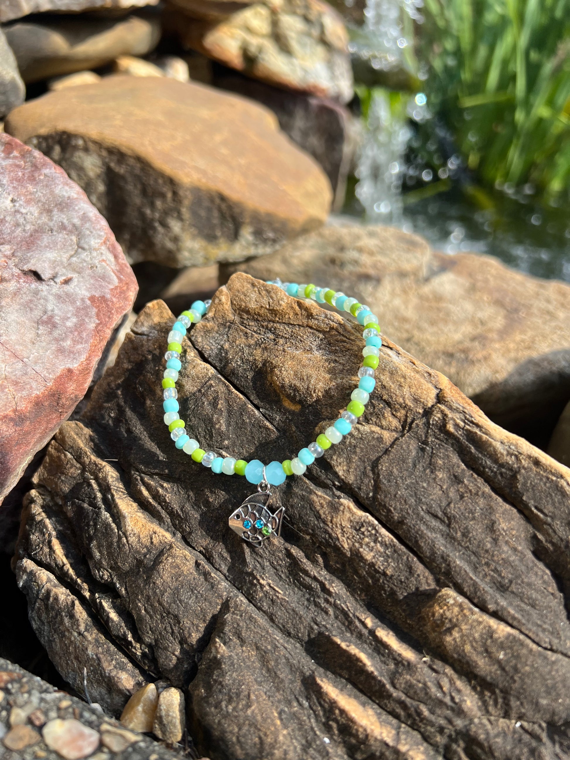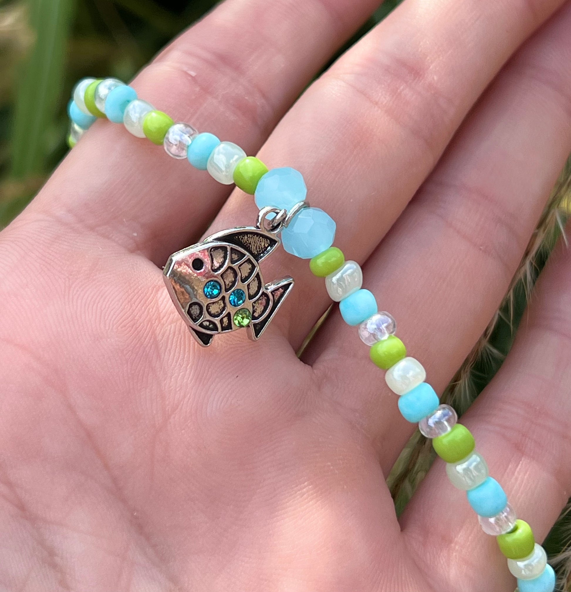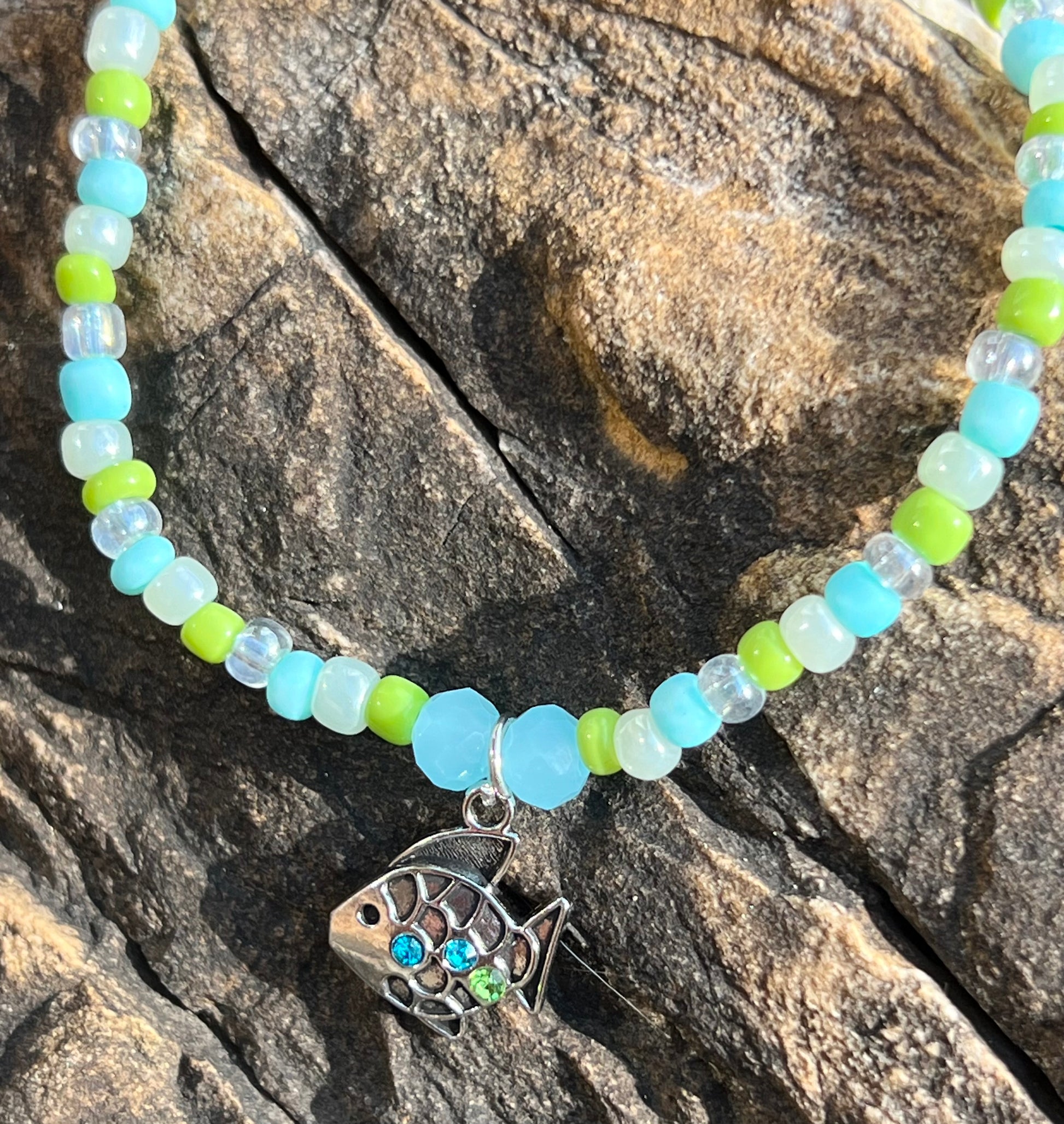 CUte little fish charm with green & blue rhinestones imbedded. Surrounded by an array of glass seed beads.