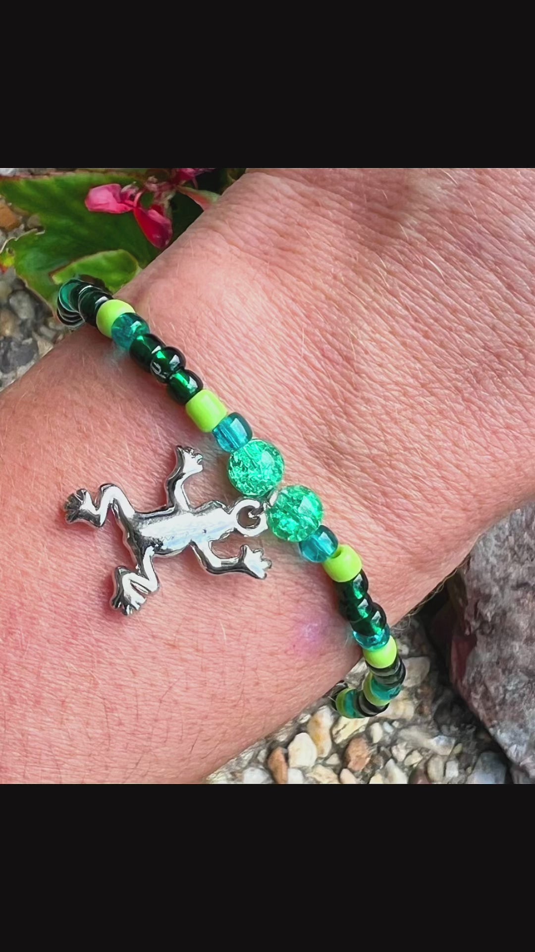 Silver frog charm surrounded by varying shades of green glass seed beads & crackle glass accent beads.