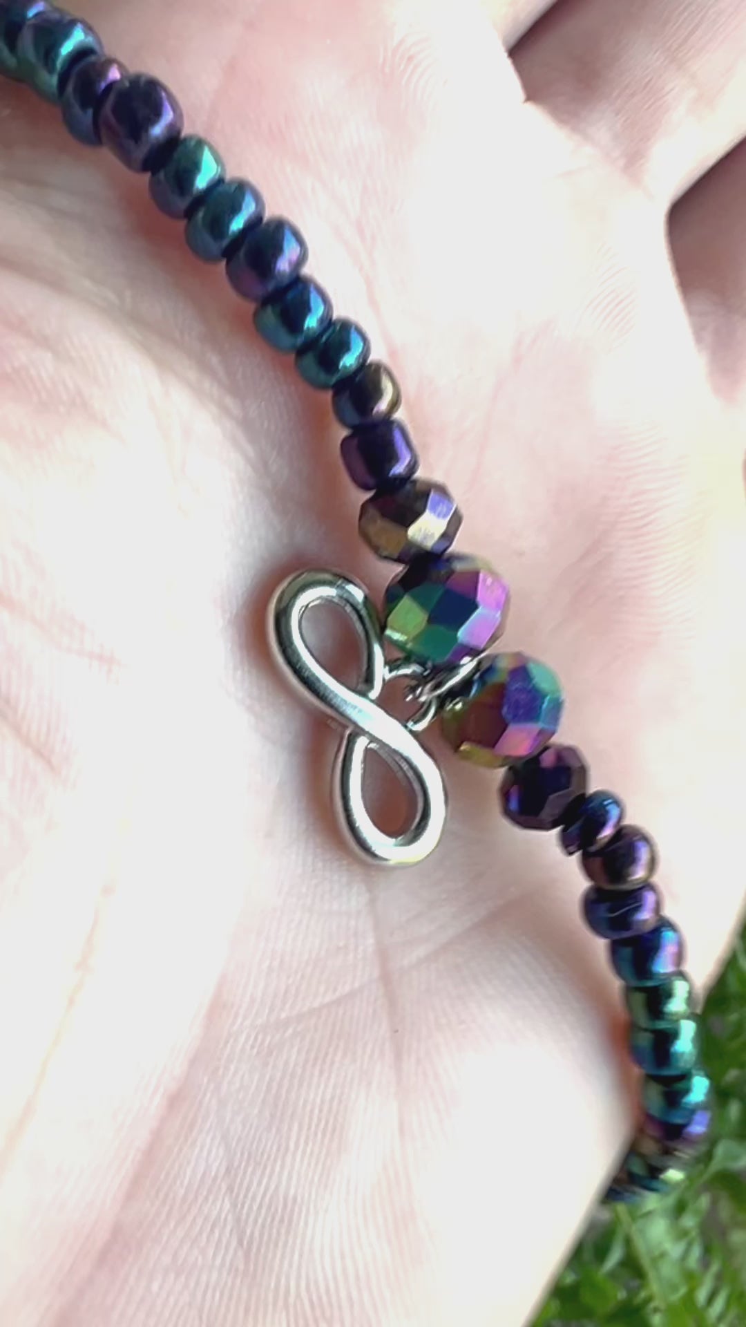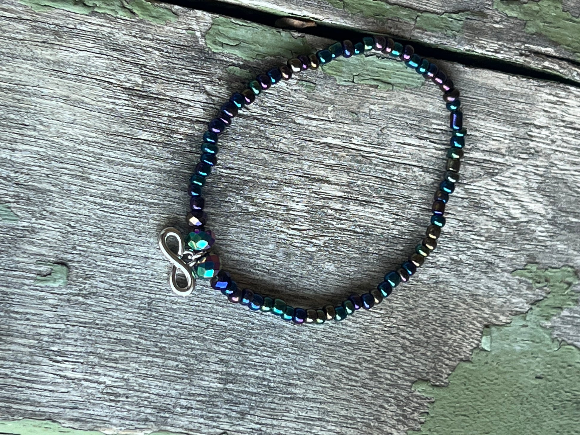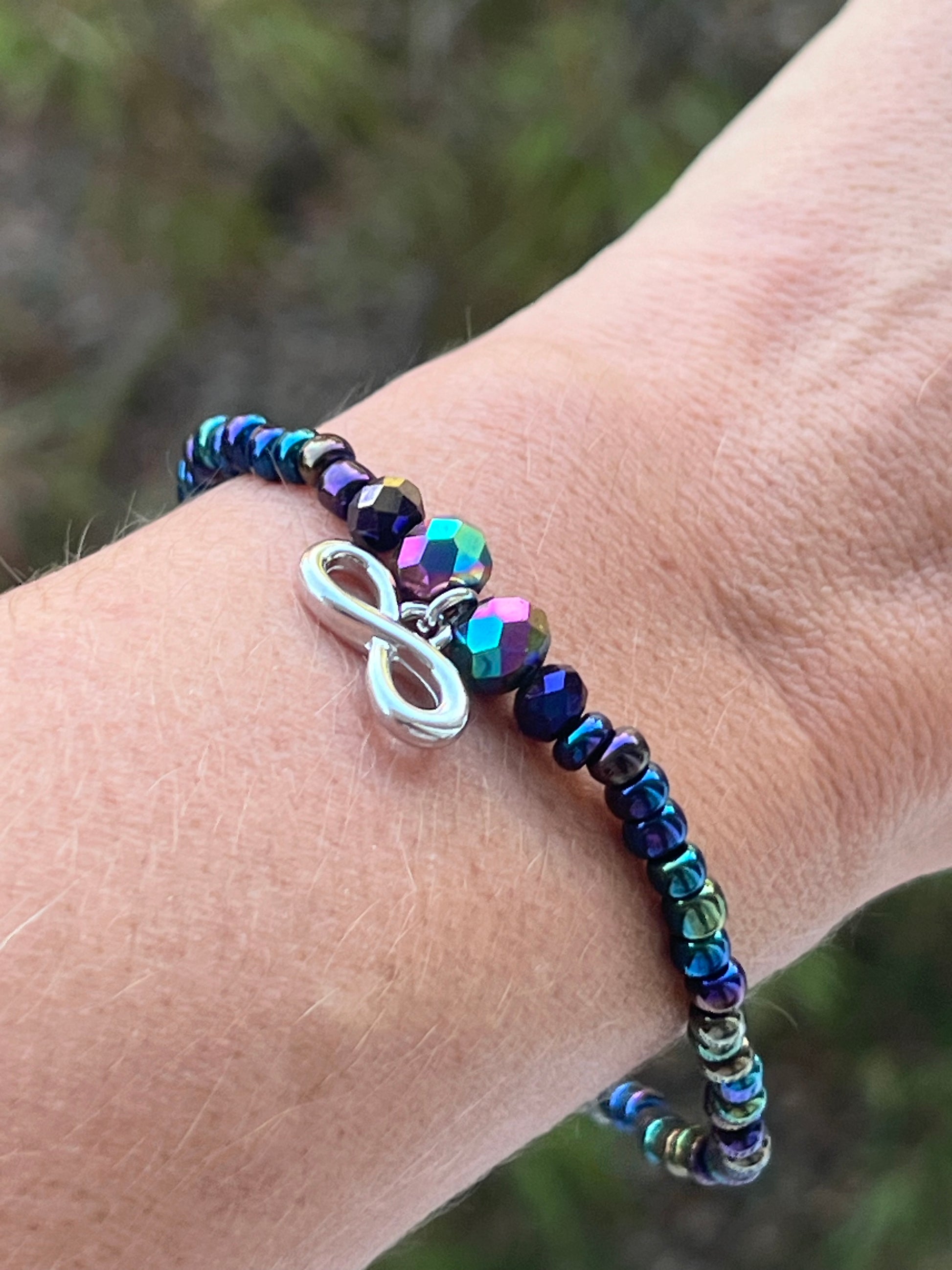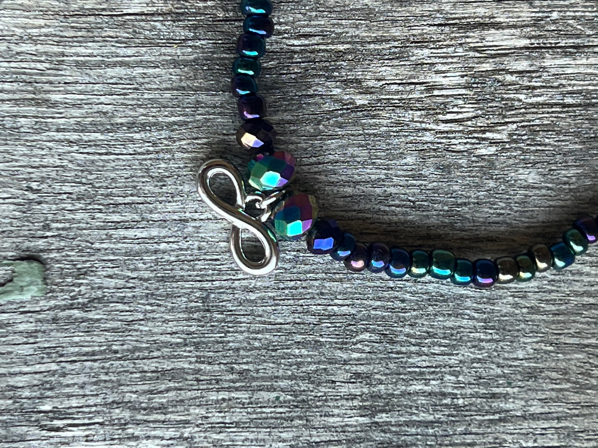 Infinity symbol dangling charm hangs from a strand of oil spill glass seed beads. Charm has faceted focal beads on either side.