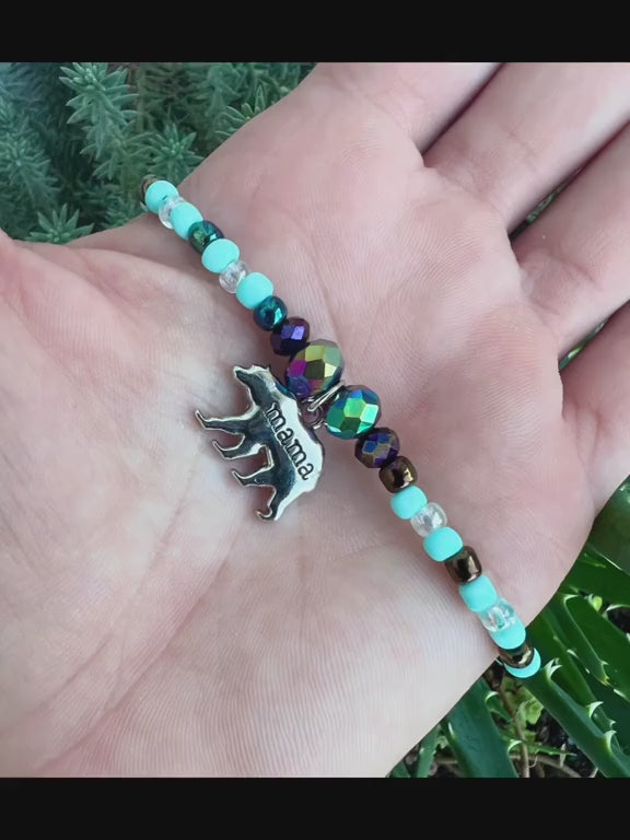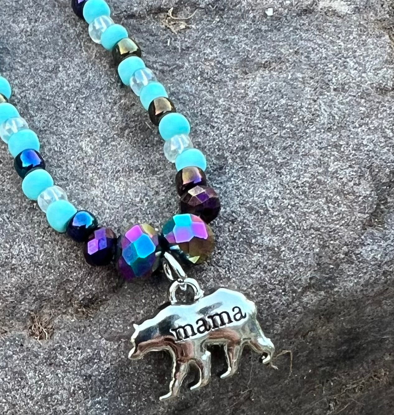 Sweet little bear charm with Mama on it. Turquoise & oil spill accent beads surround this cute dangling charm.