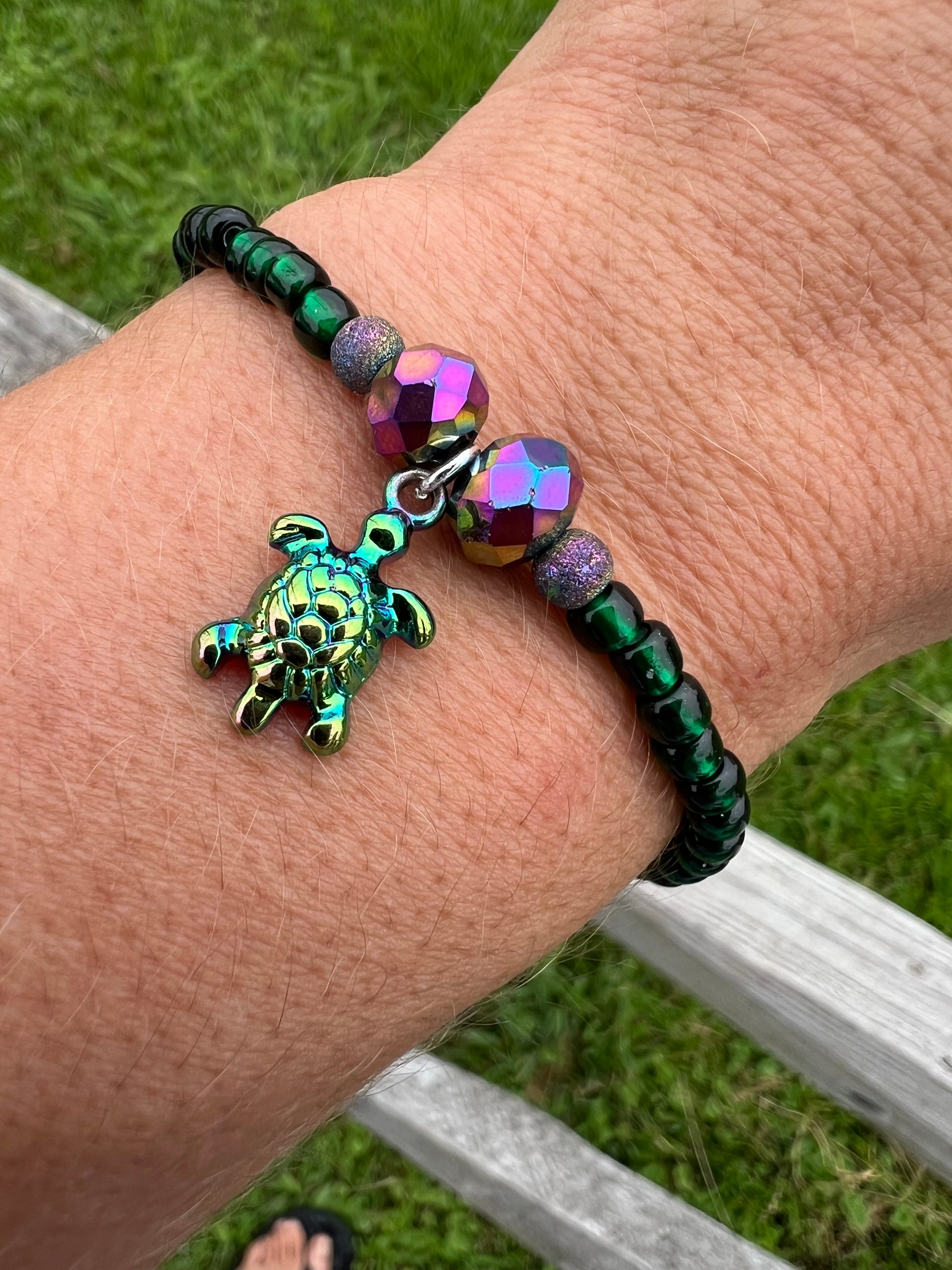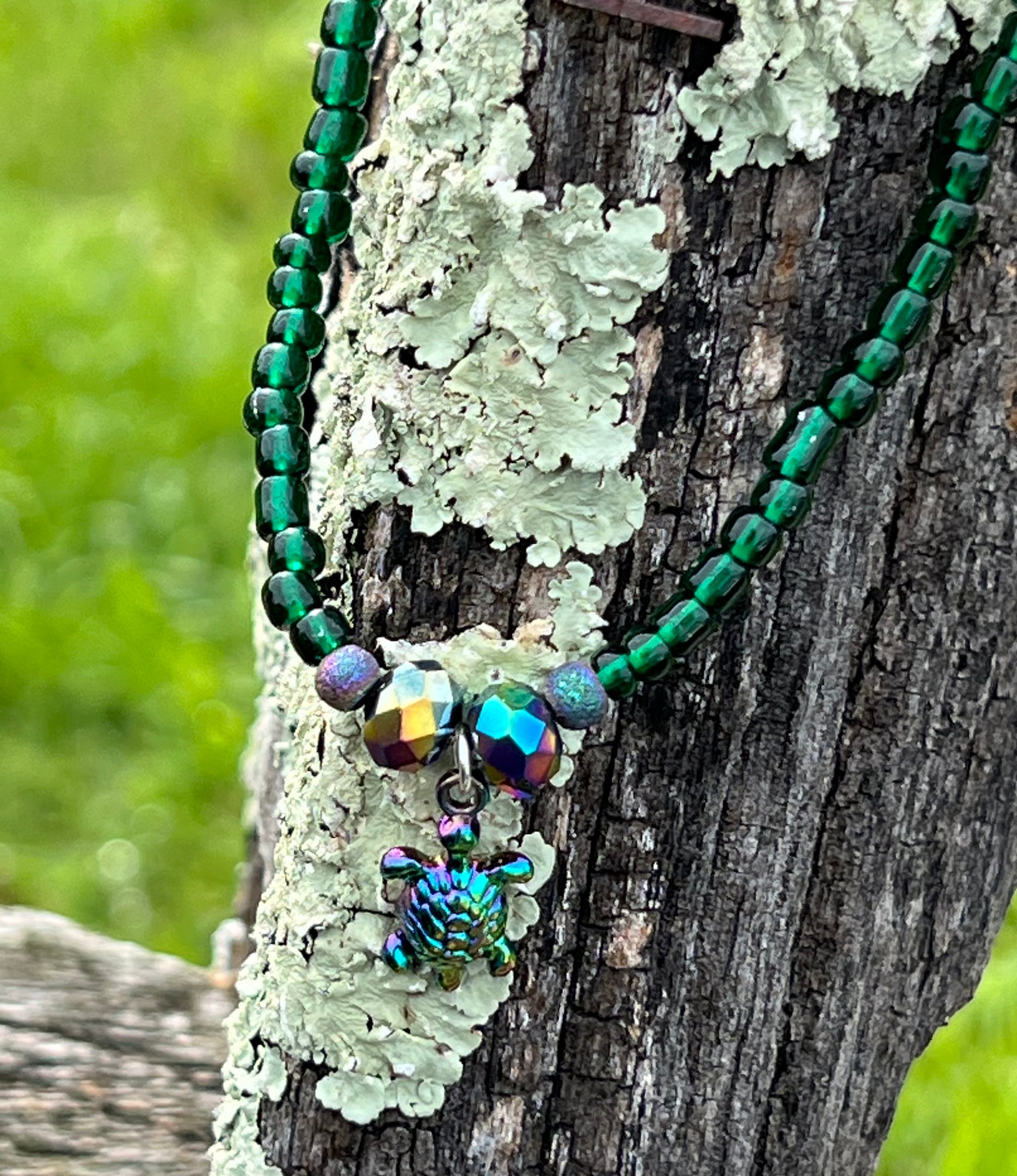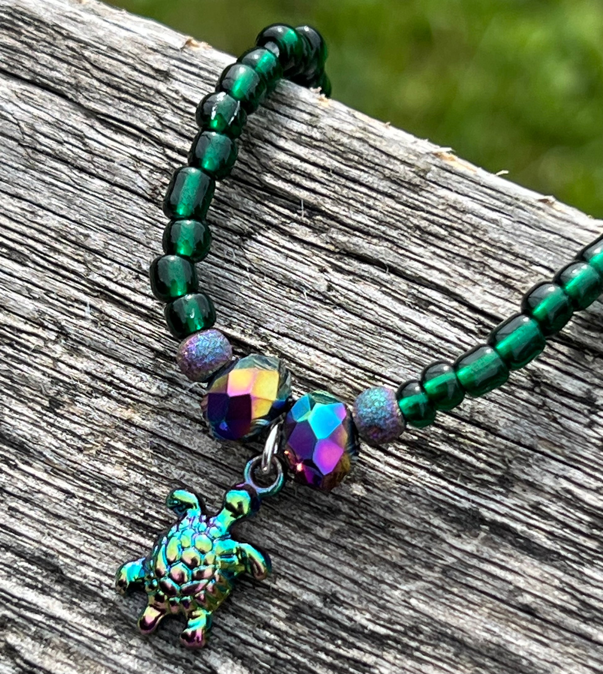 Oil spill sea turtle charm surrounded by green see through glass seed beads & facetted oil spill beads.