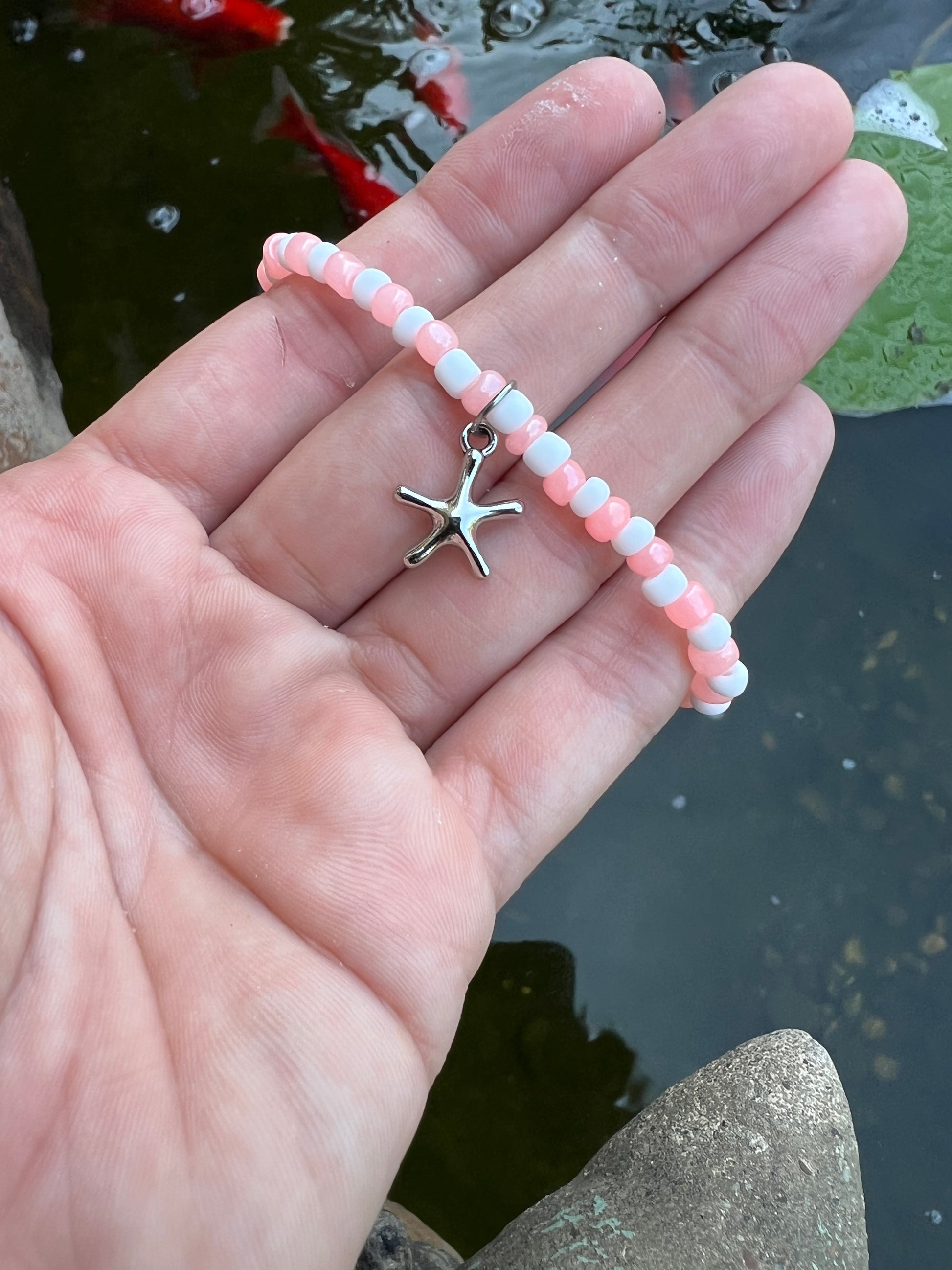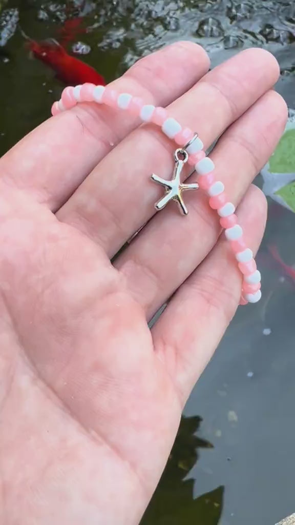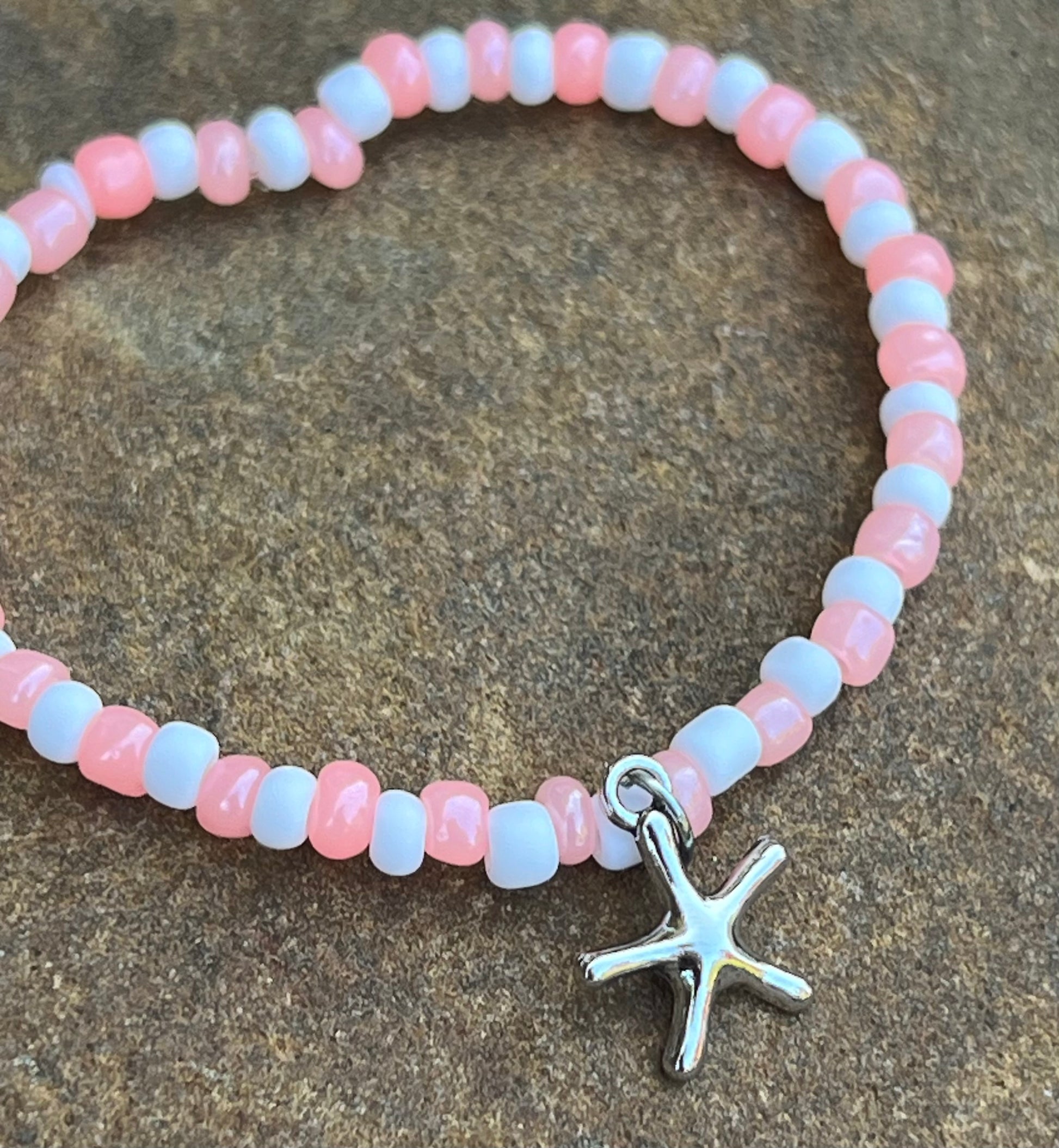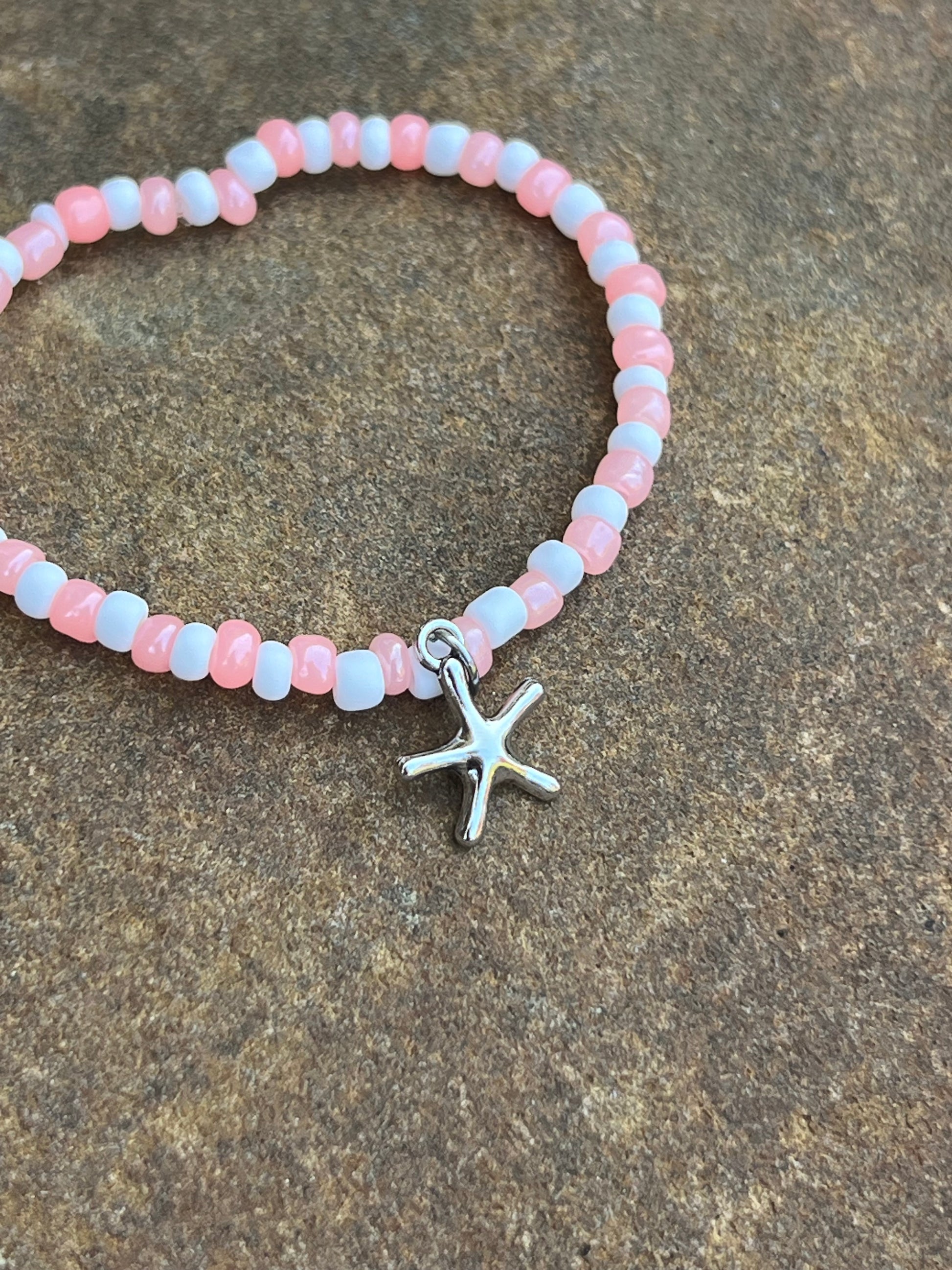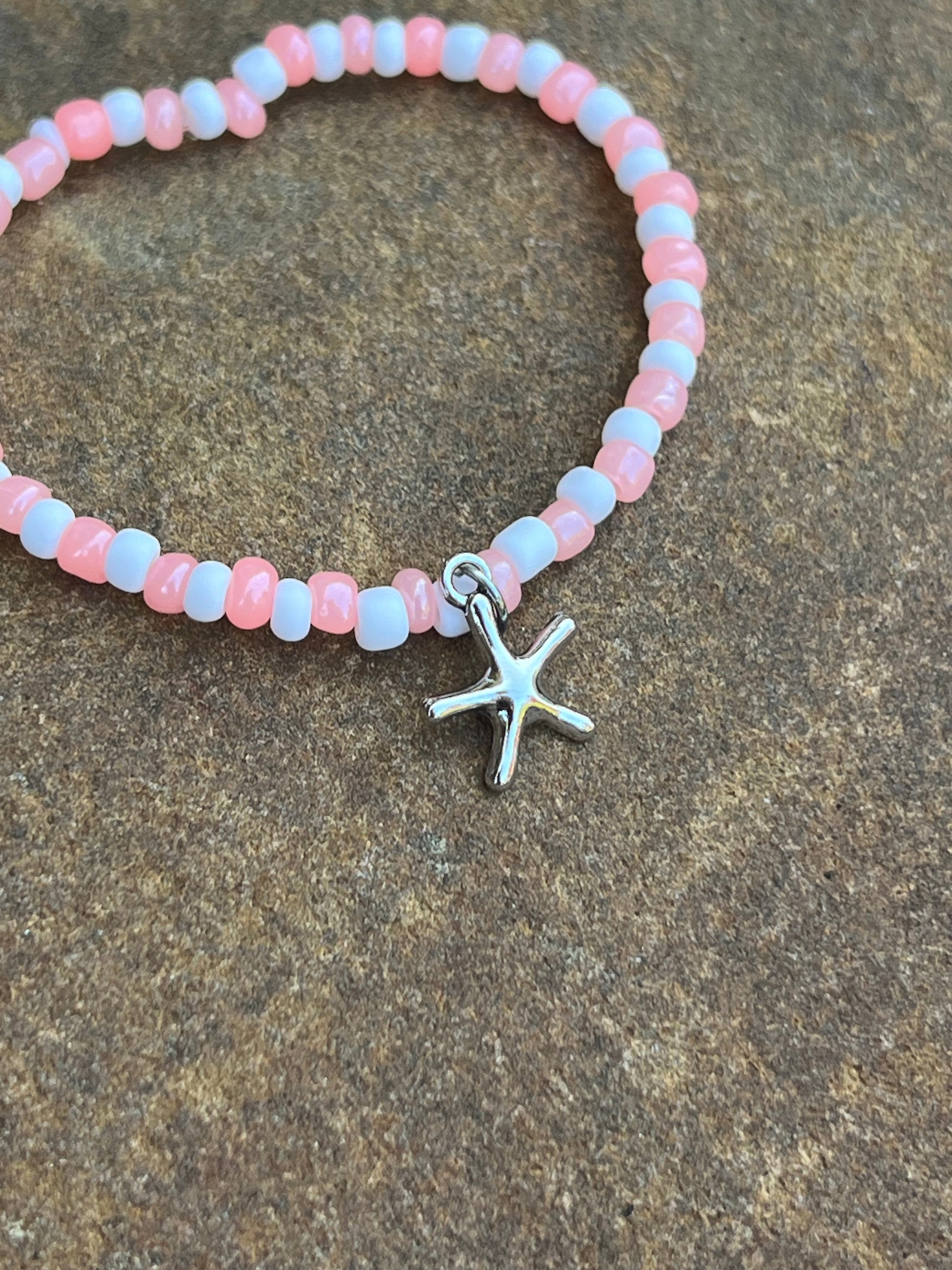 Cute little pink & white glass seed beads surrounded a silver starfish charm.