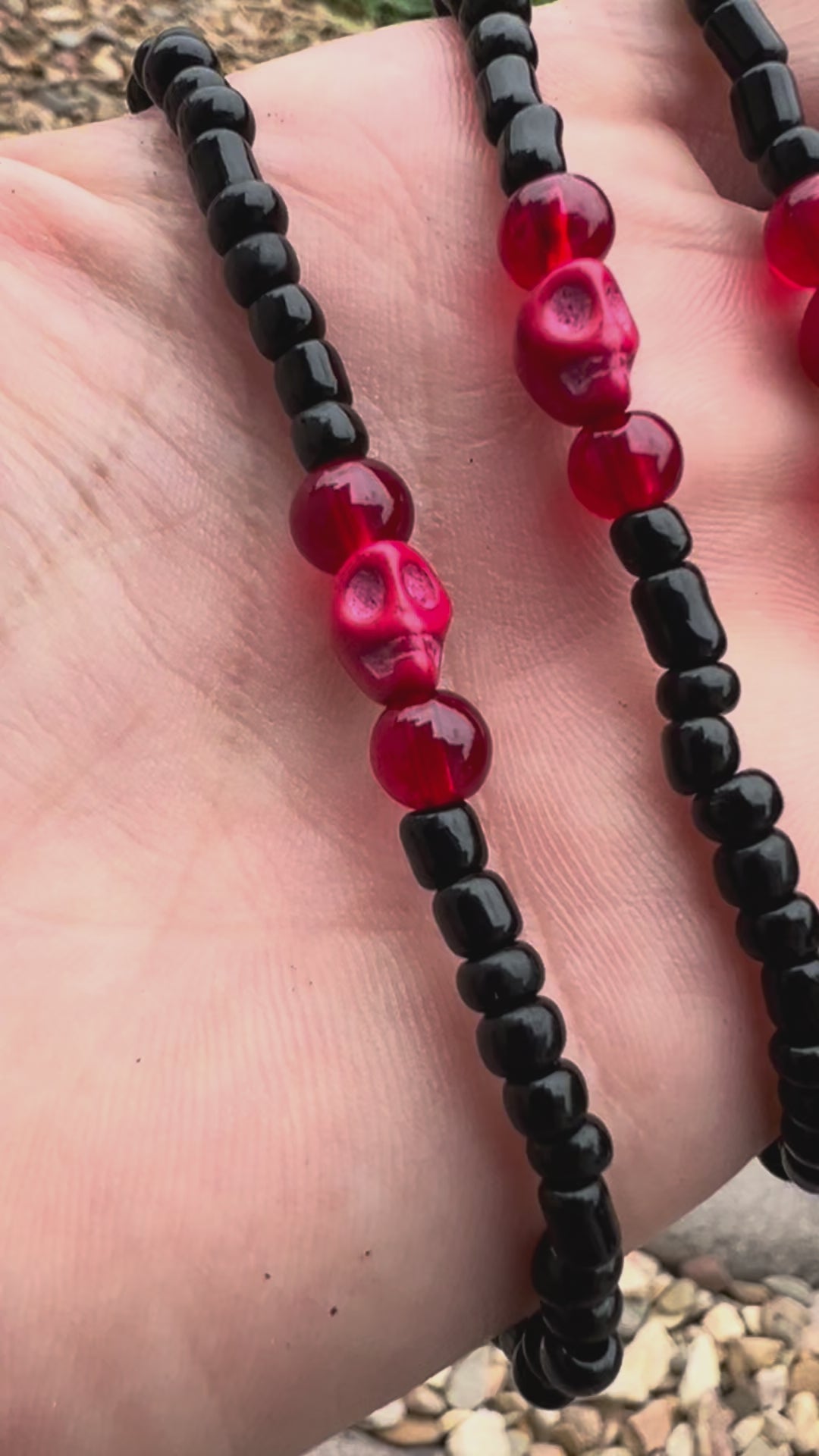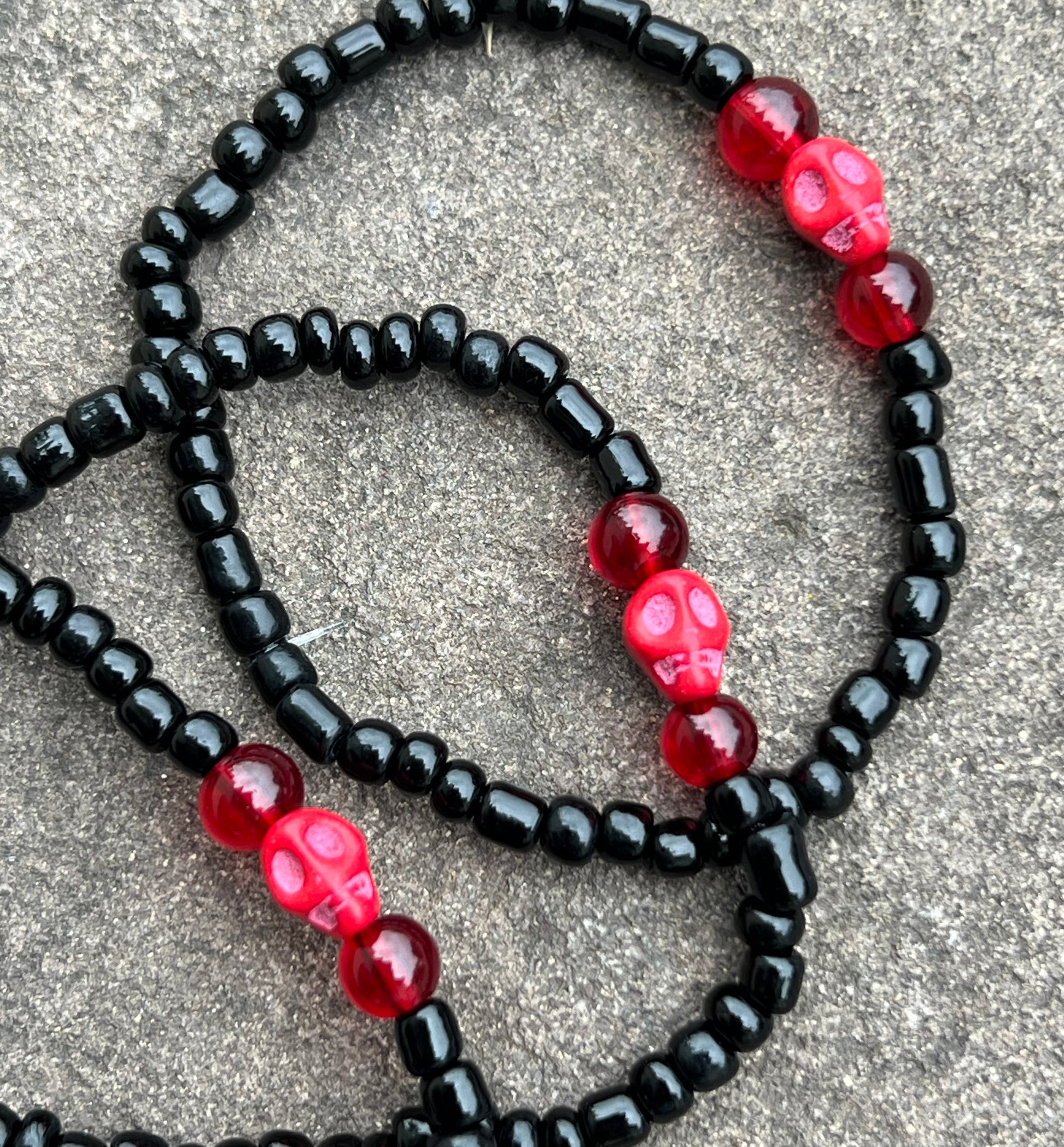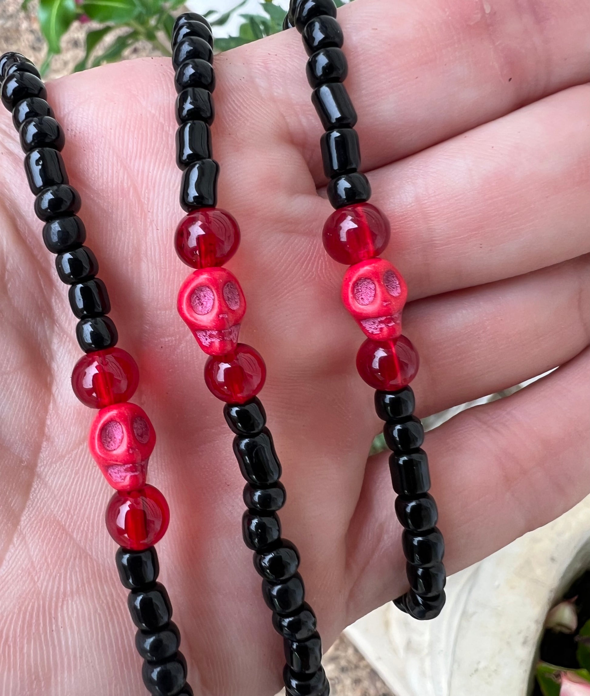 Red skull accent beads surrounded by black beads & iridescent red beads. So fun for Halloween!