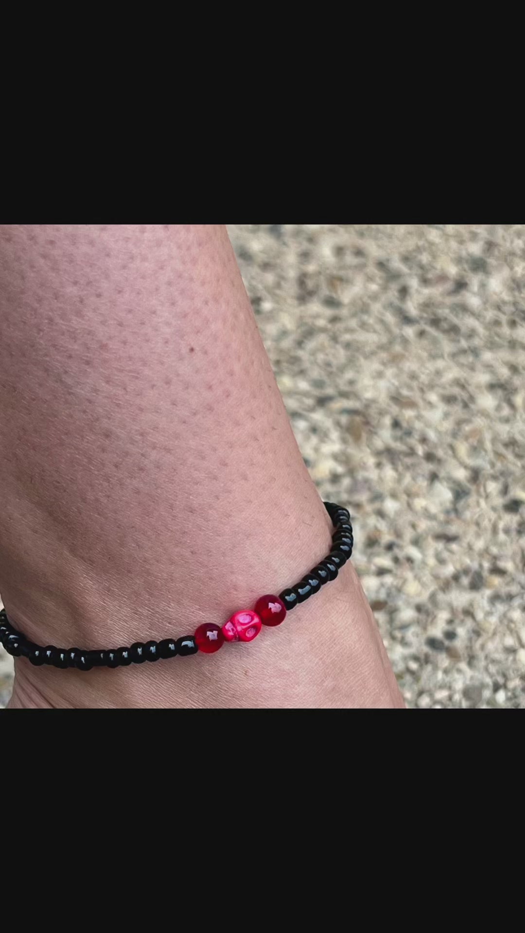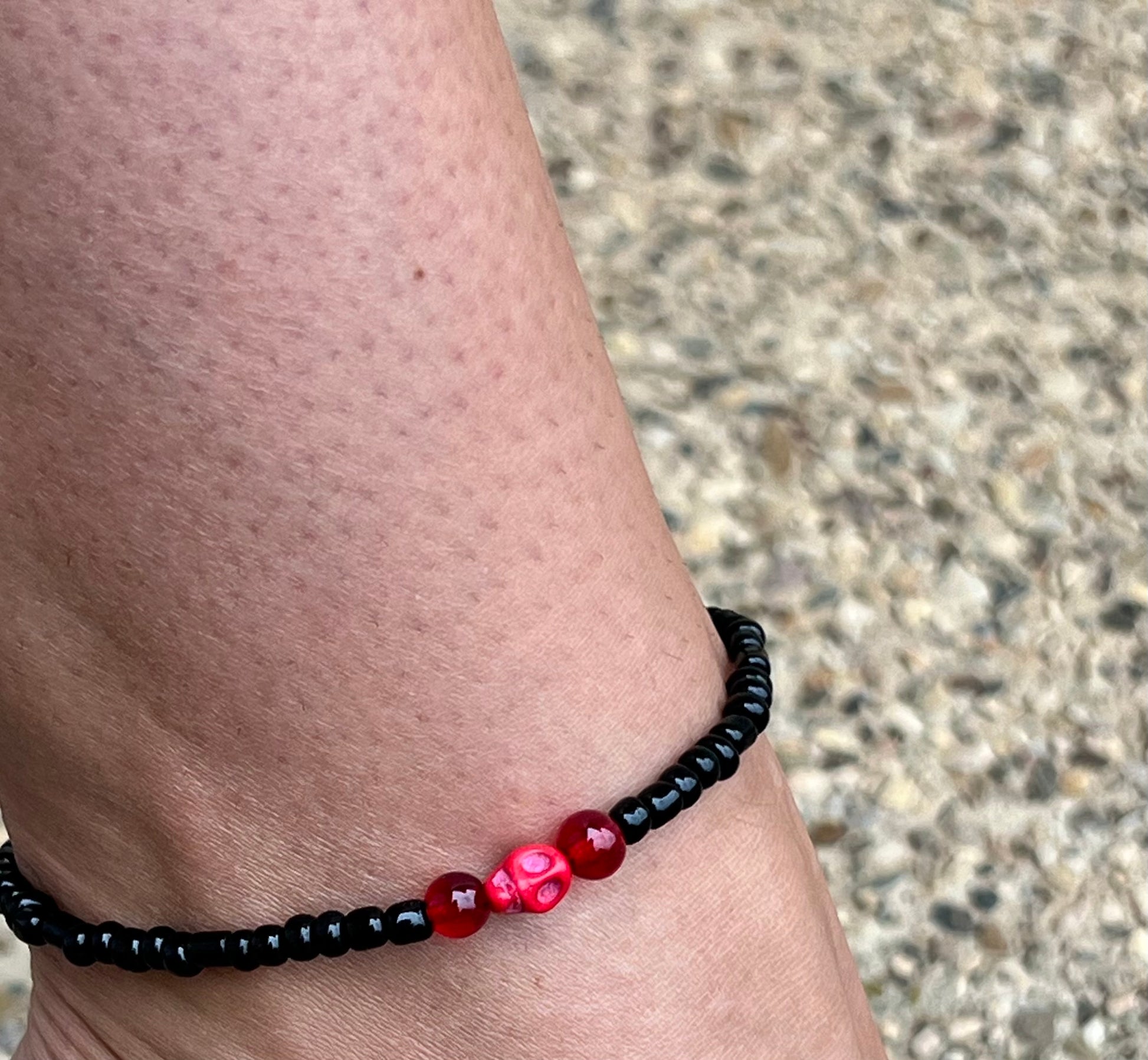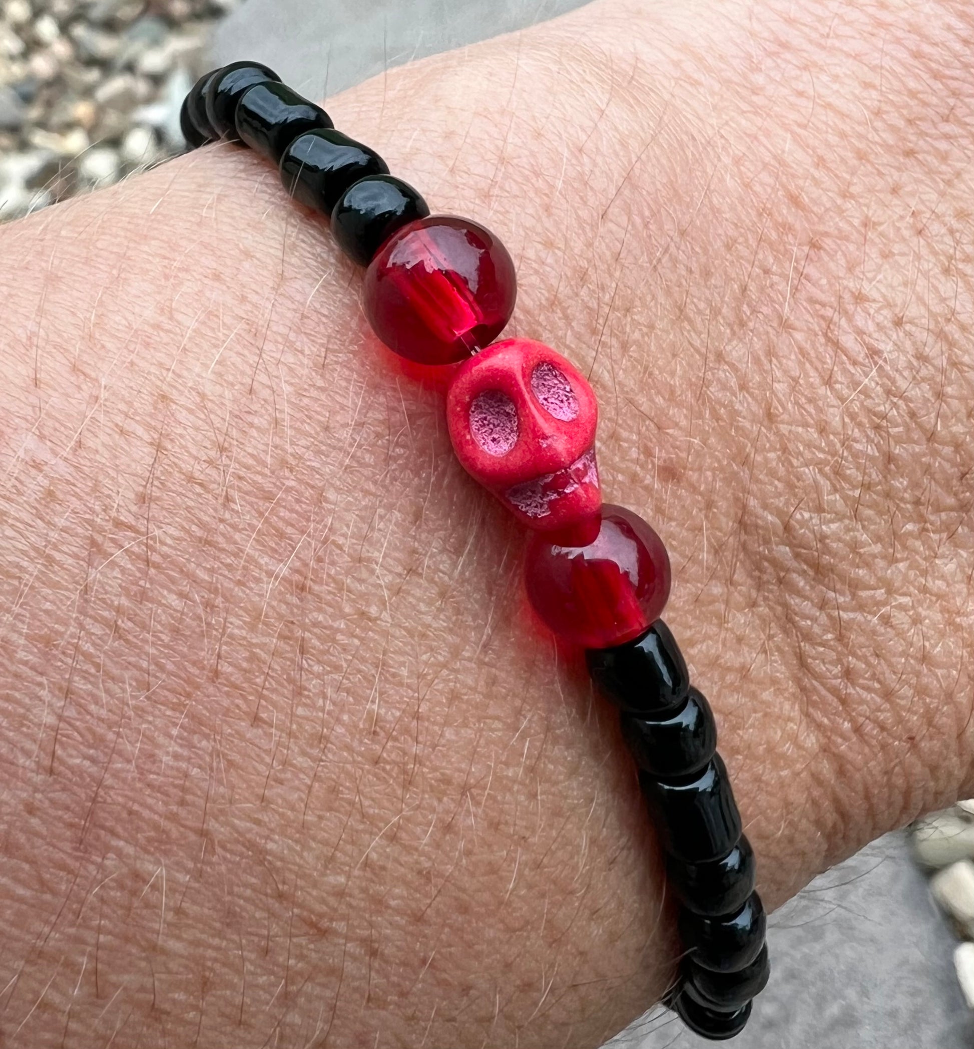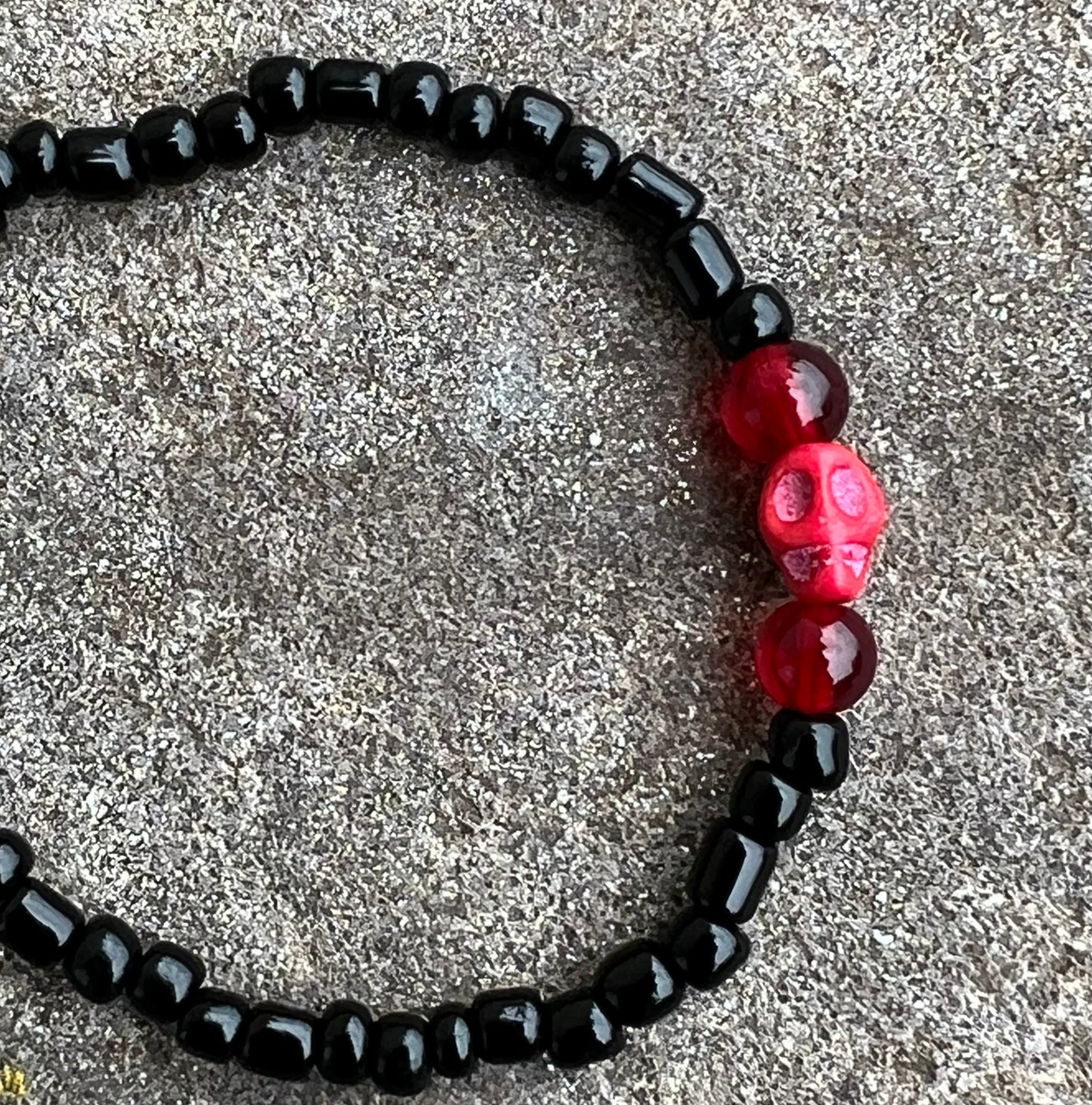 Red skull accent beads surrounded by black beads & iridescent red beads. So fun for Halloween!