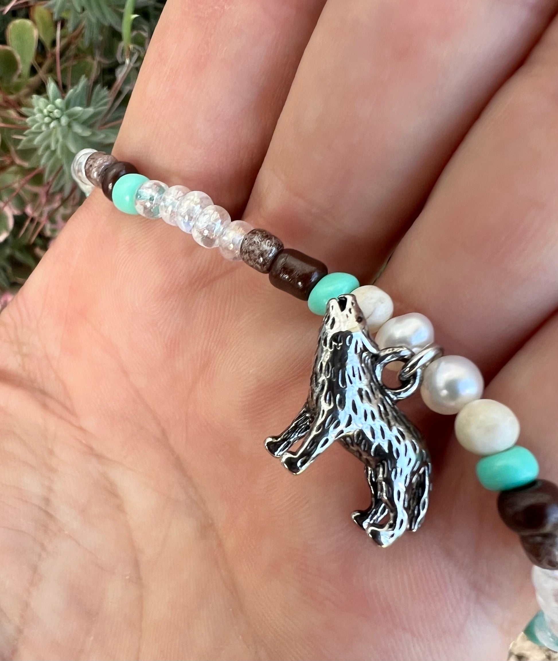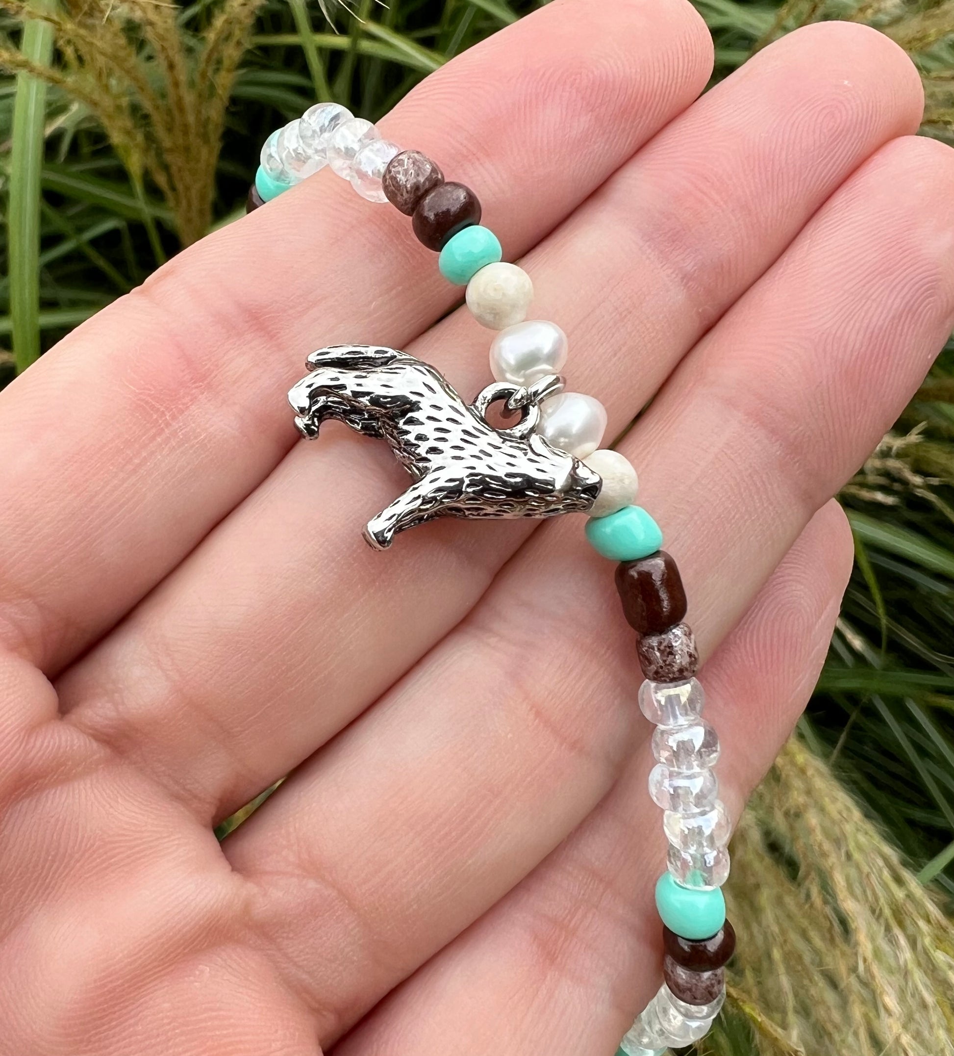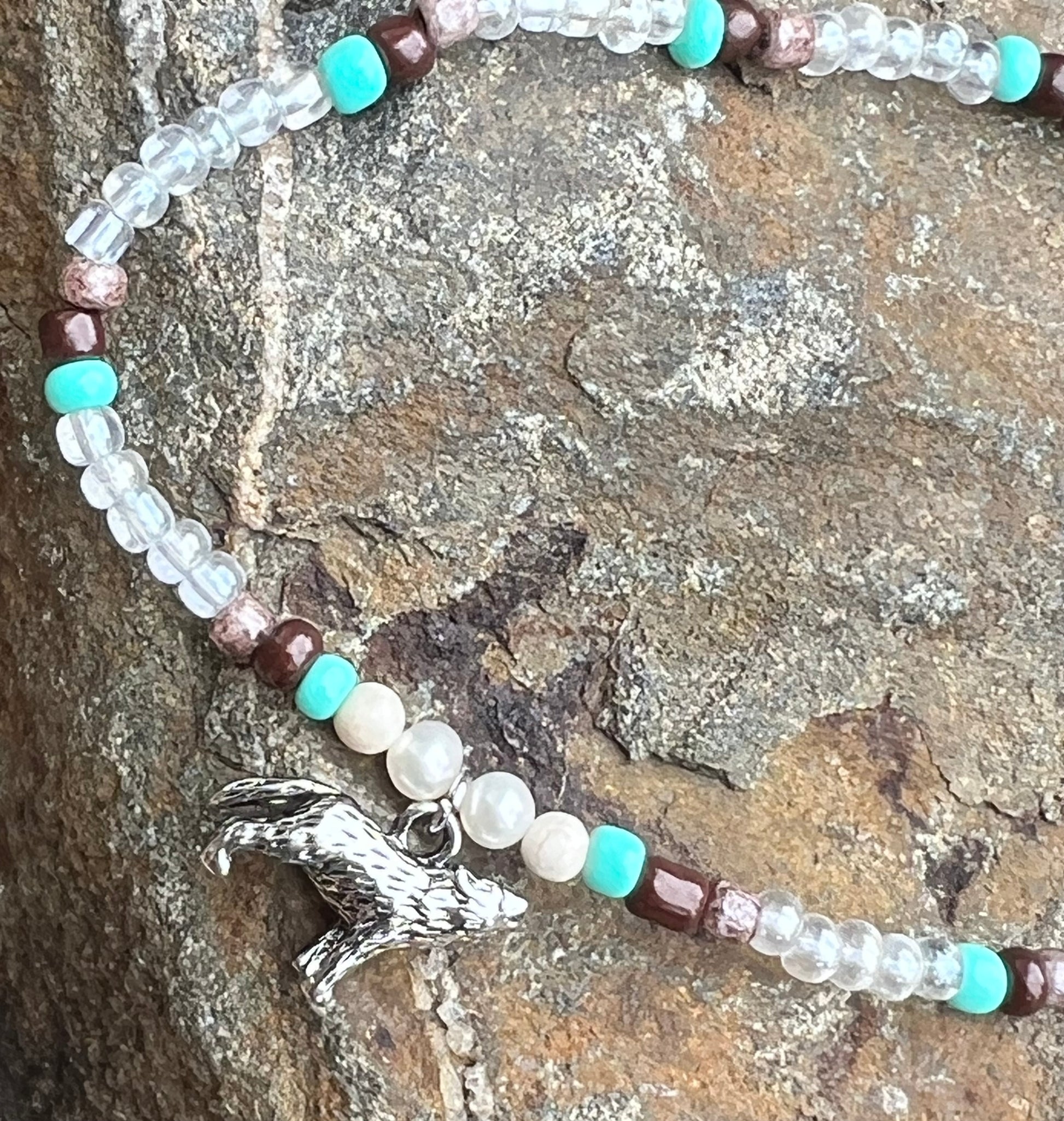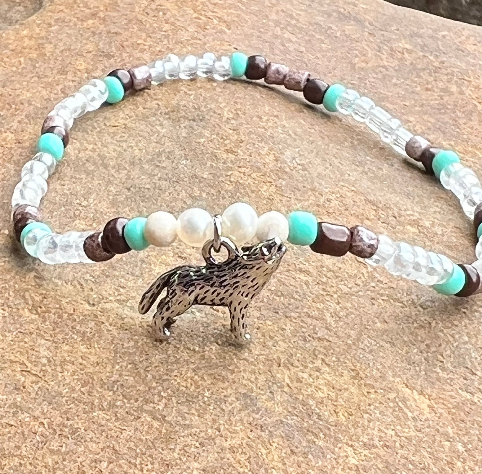 Silver howling wolf charm with an array of glass seed beads.