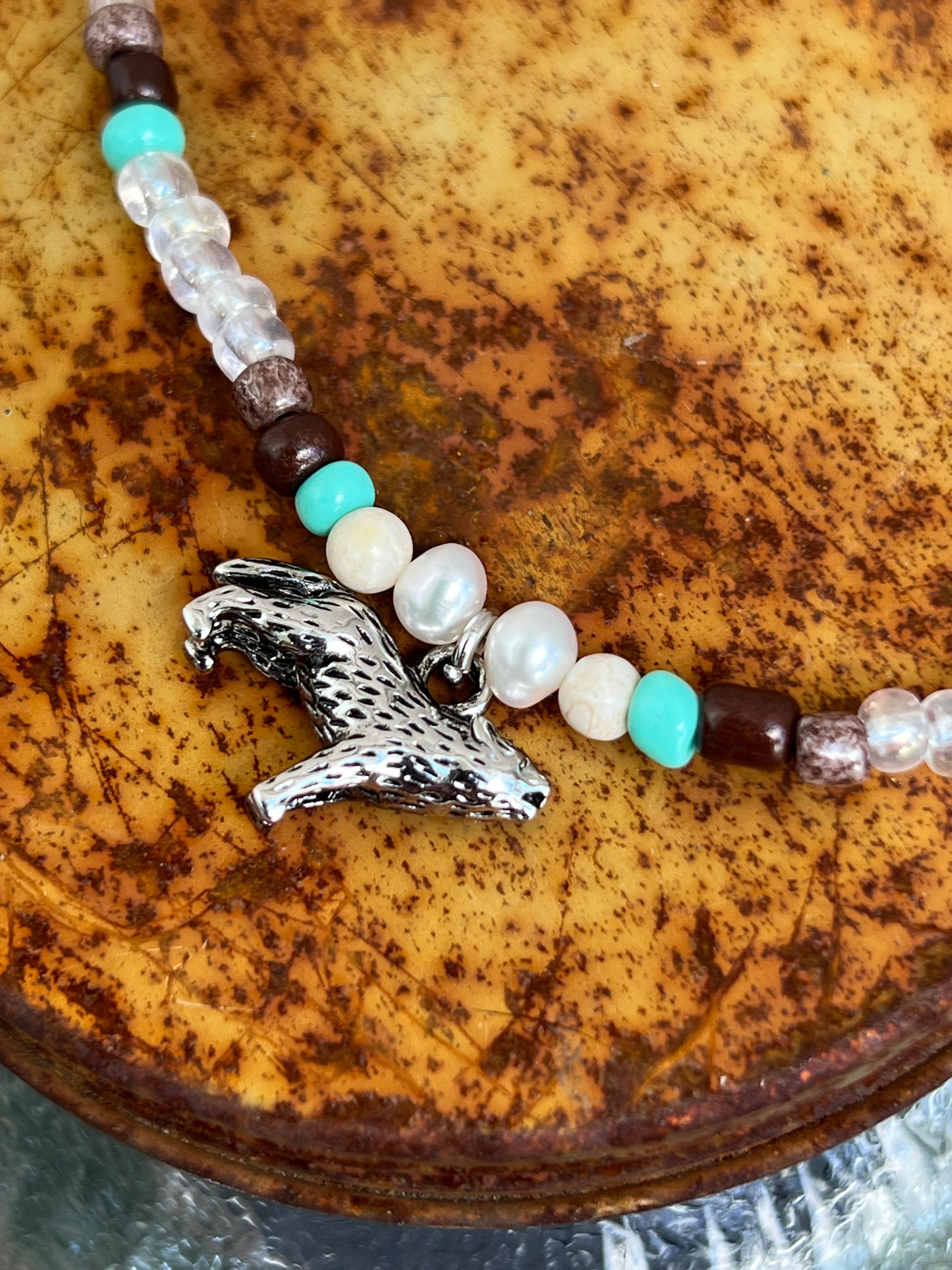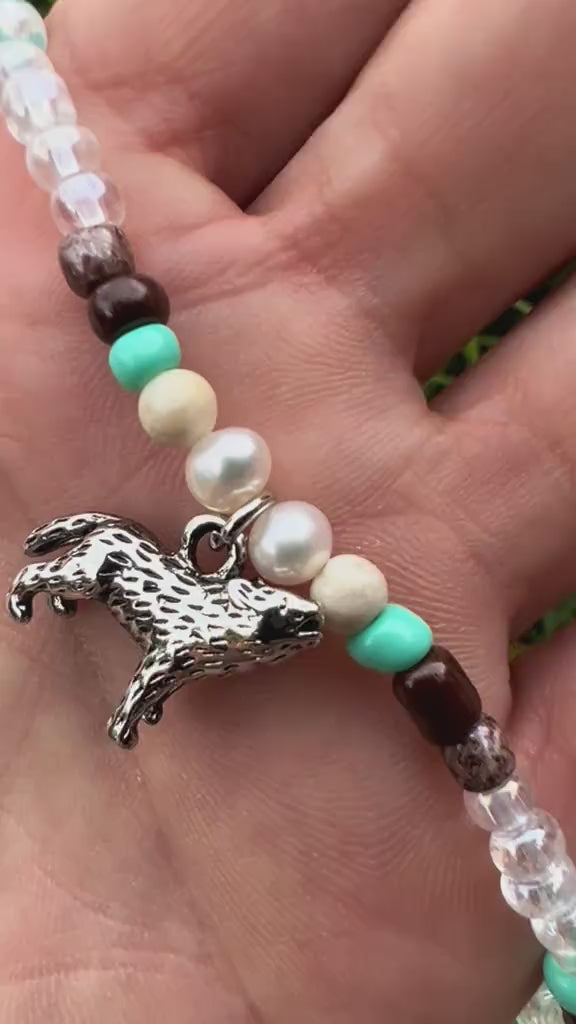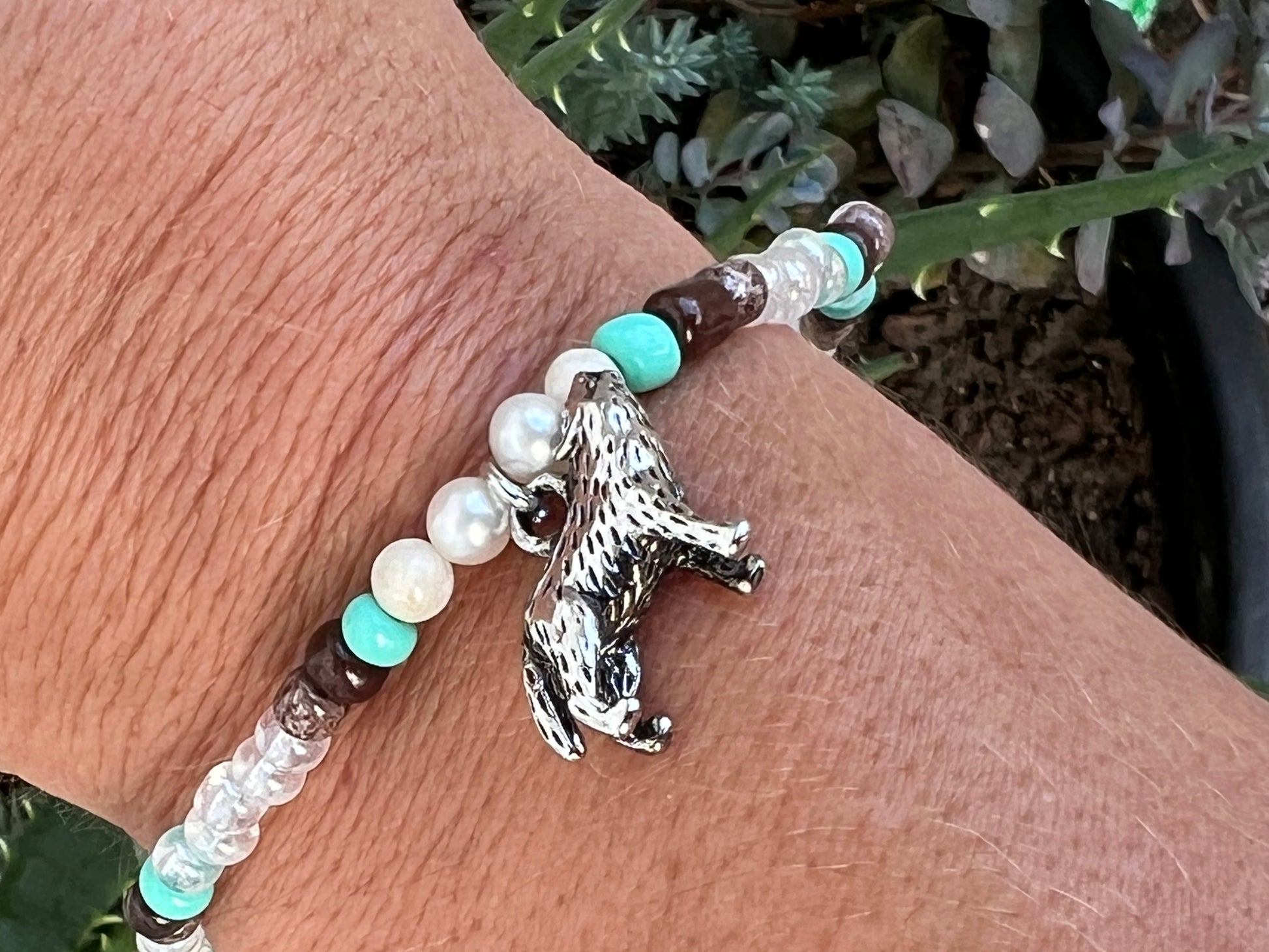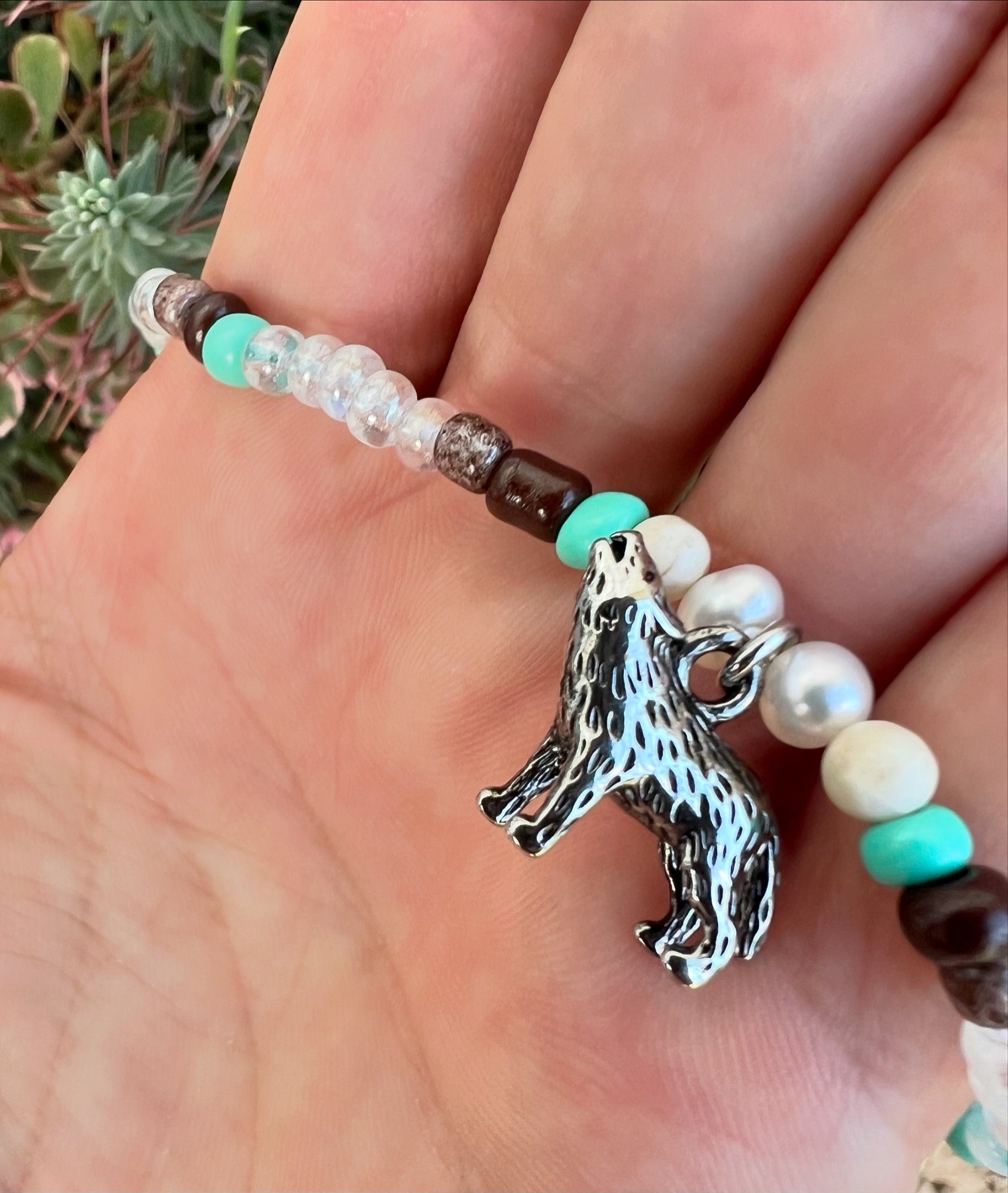 Silver howling wolf charm with an array of glass seed beads.