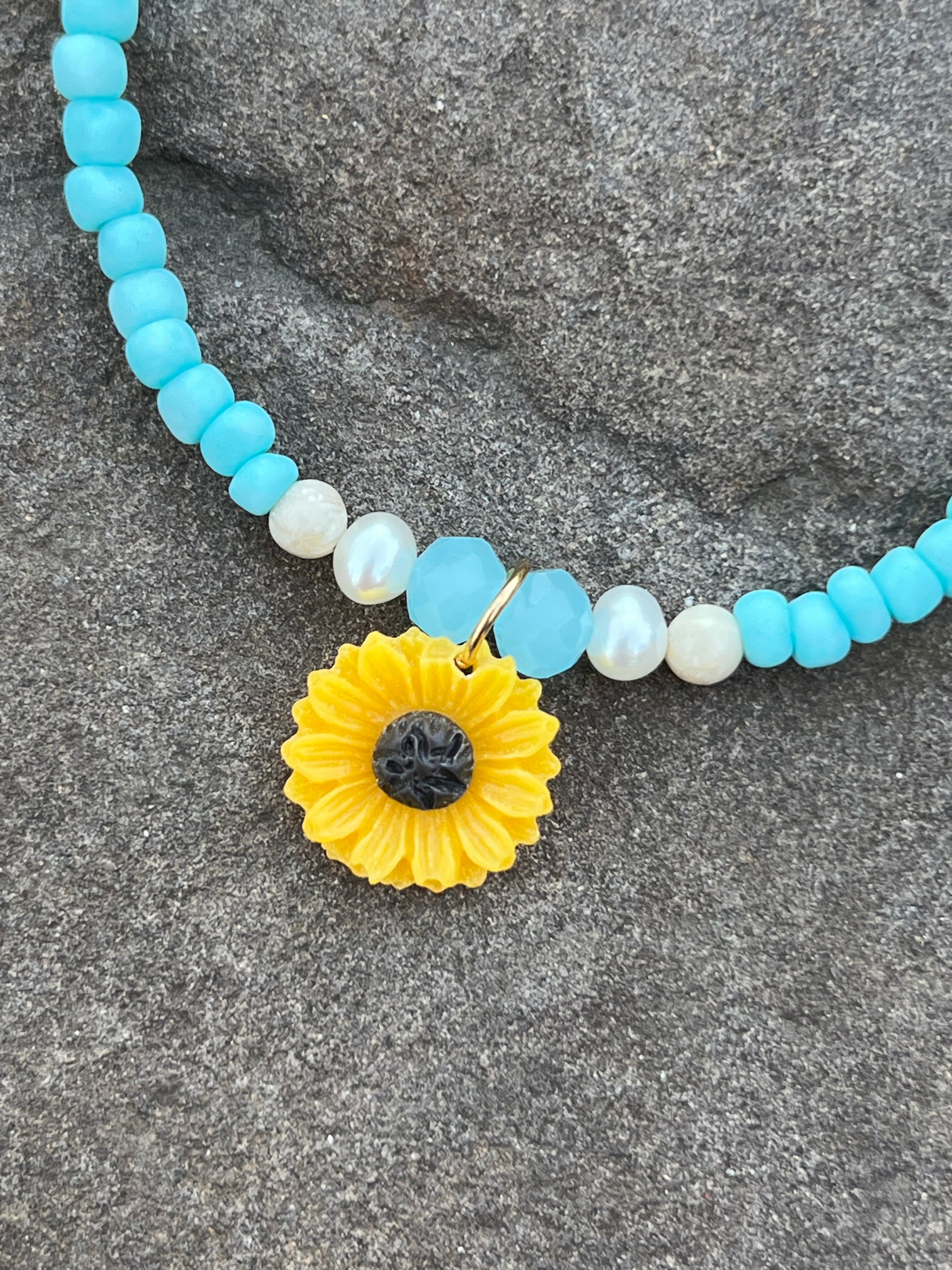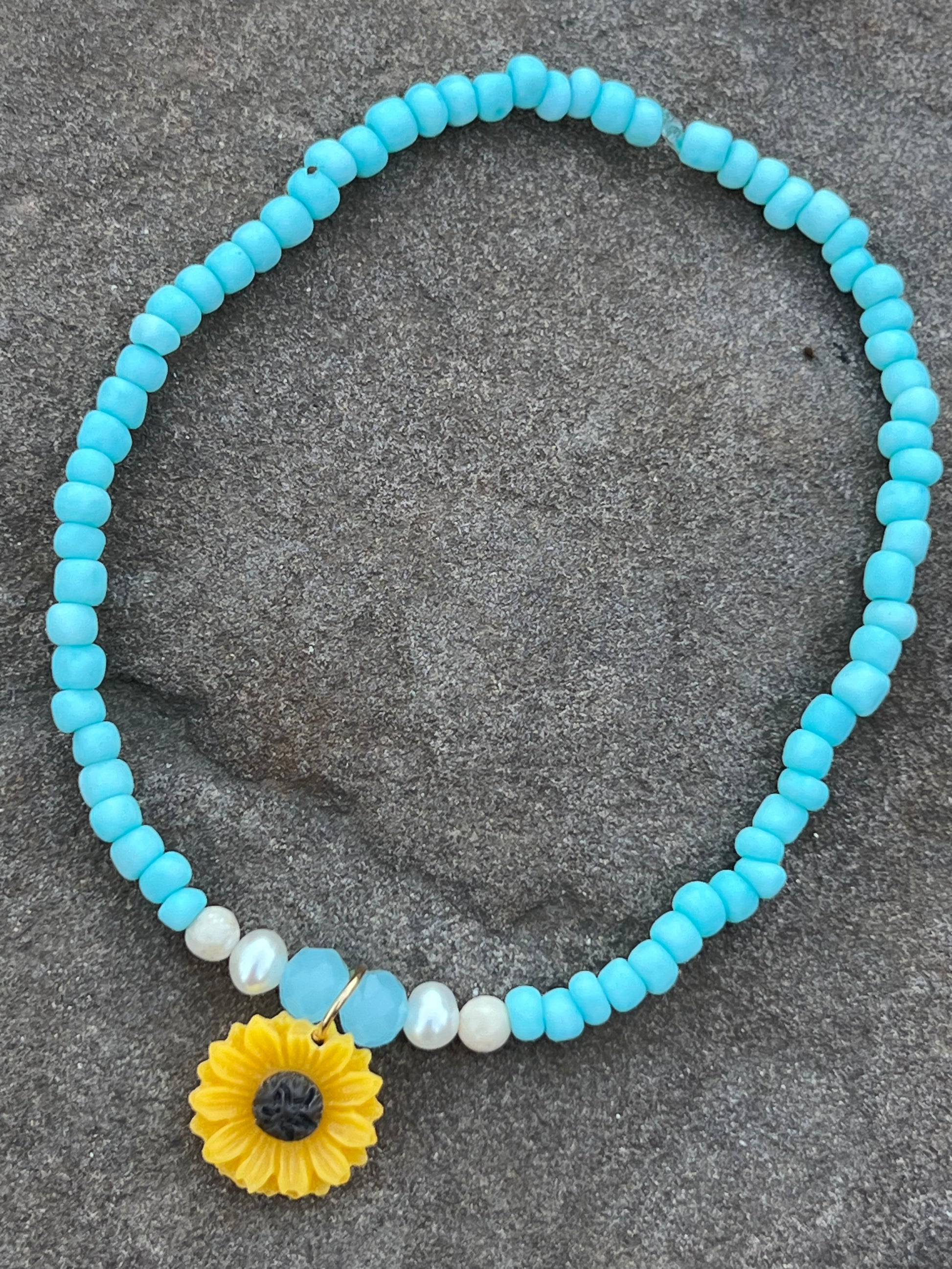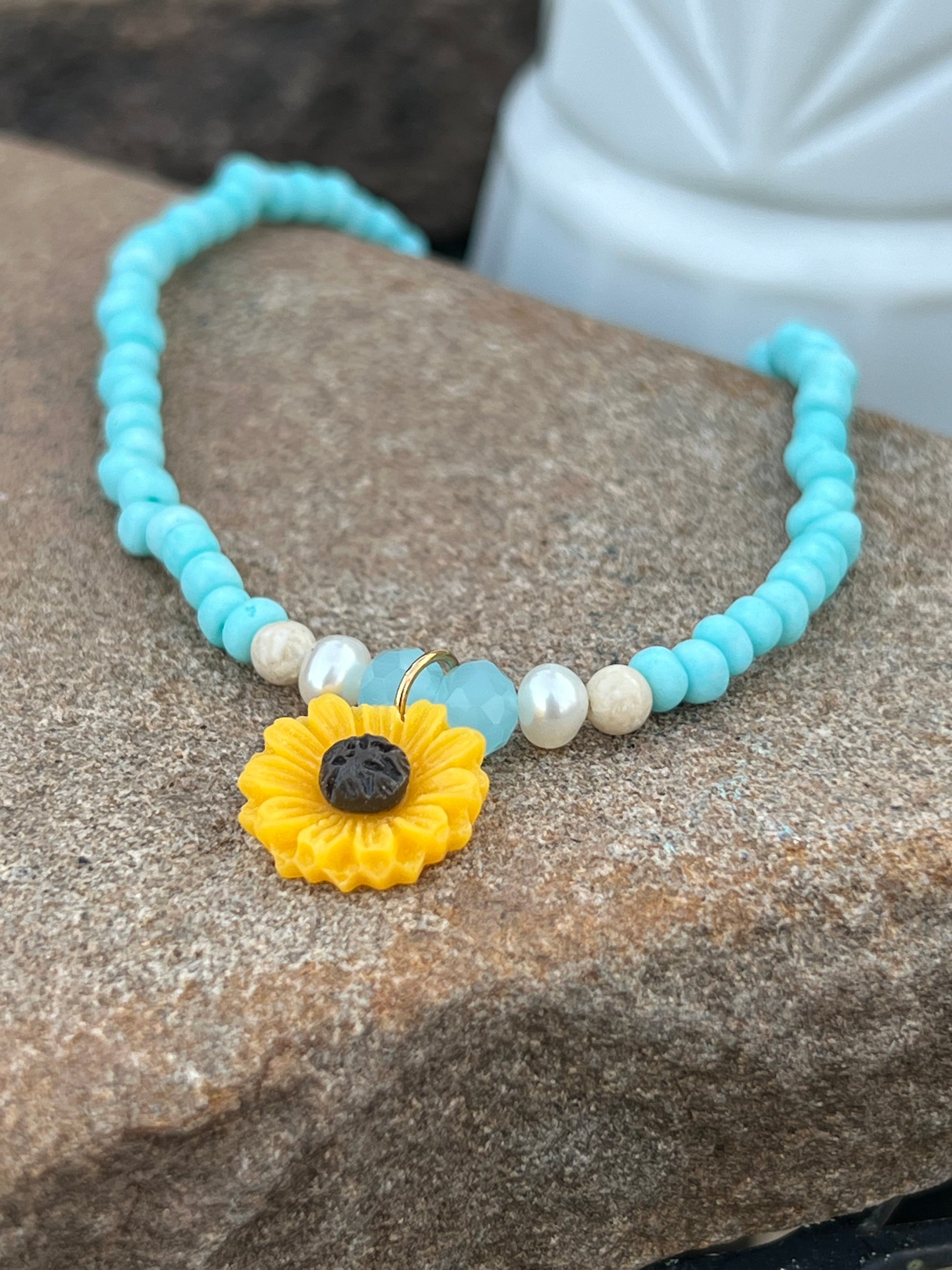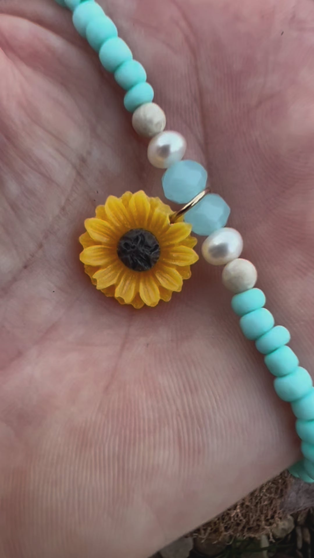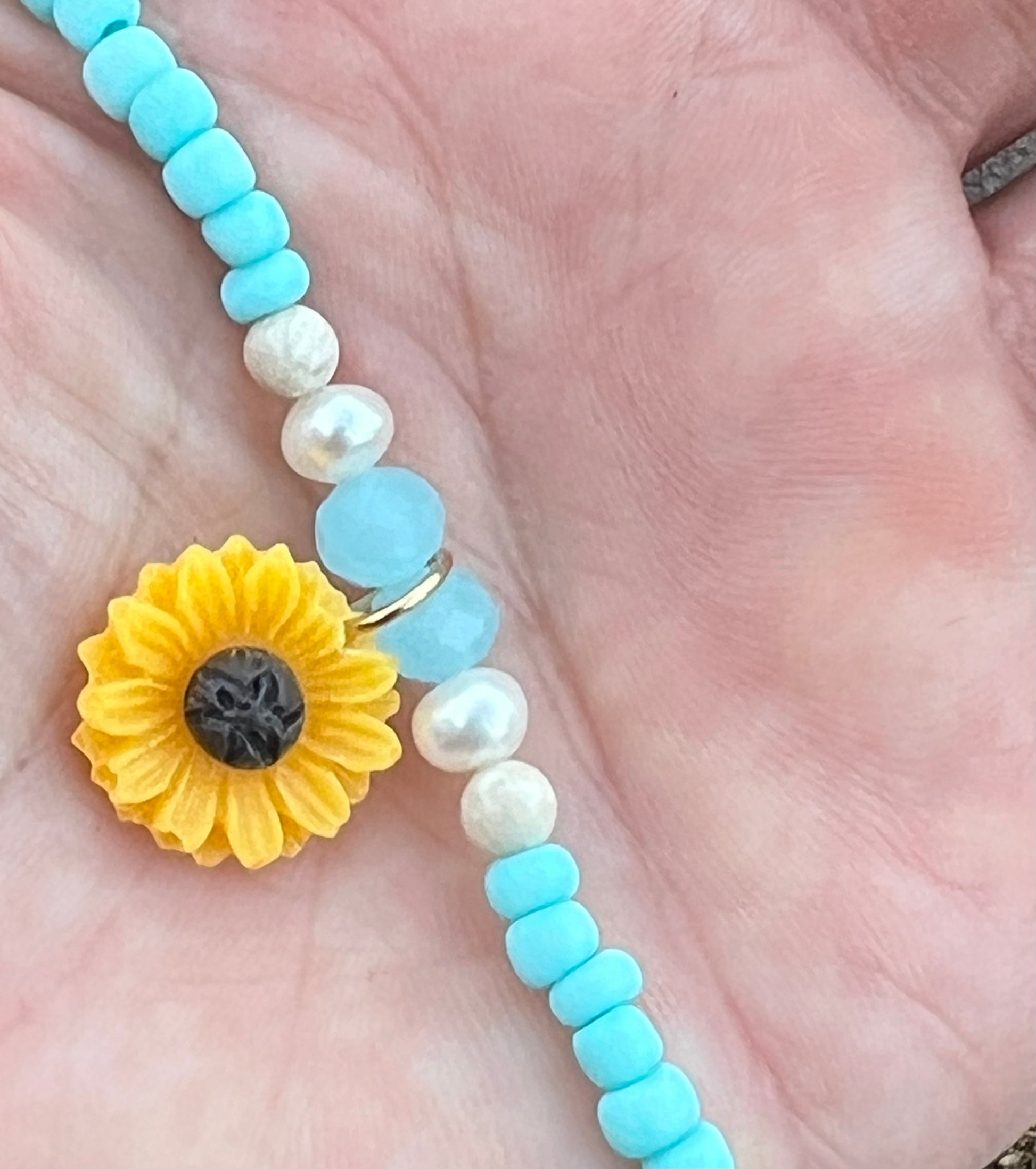Resin blooming sunflower charm surrounded by faceted, pearlized, & seed beads. You’ll be a walking ray of sunshine ☀️.