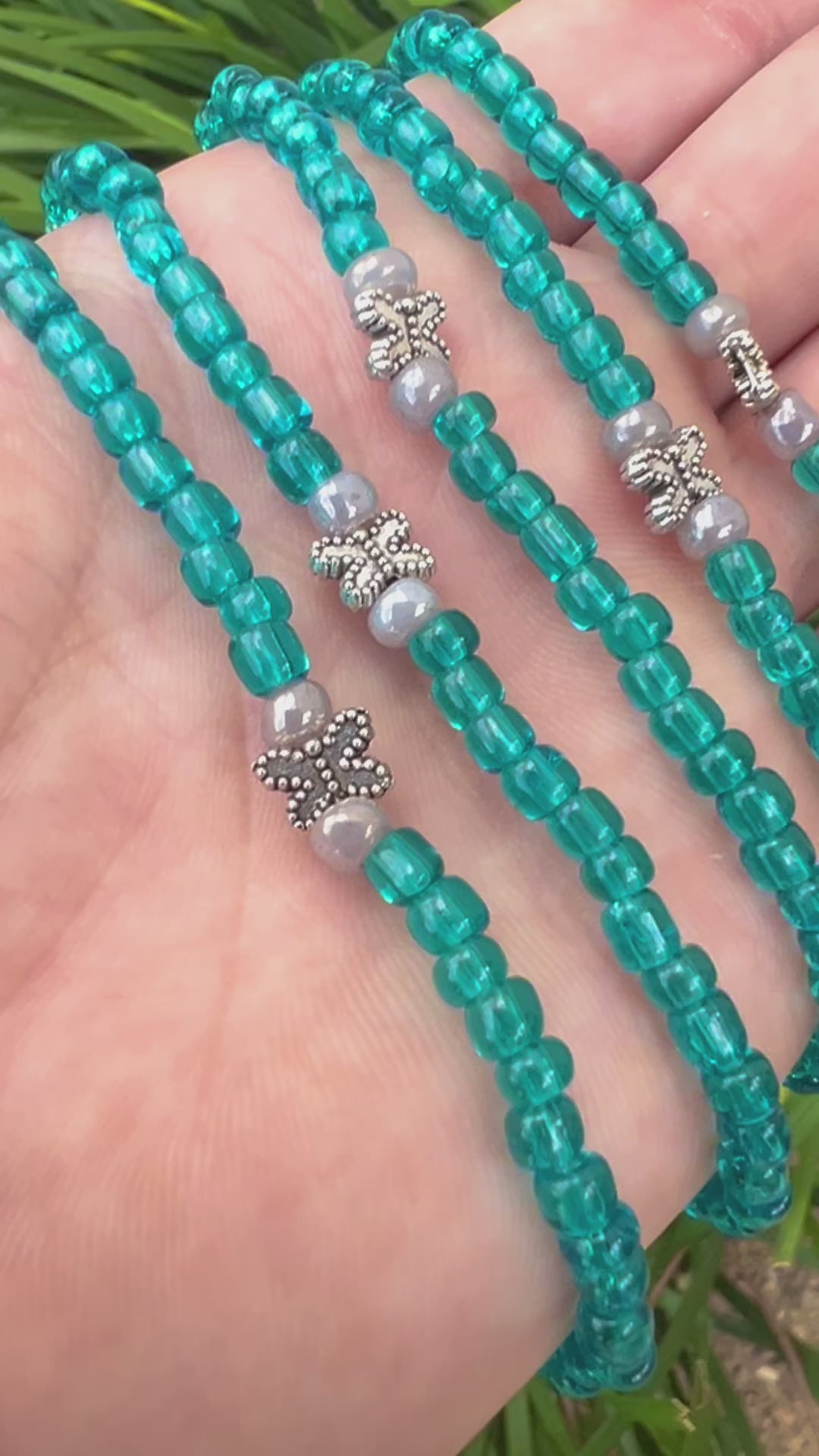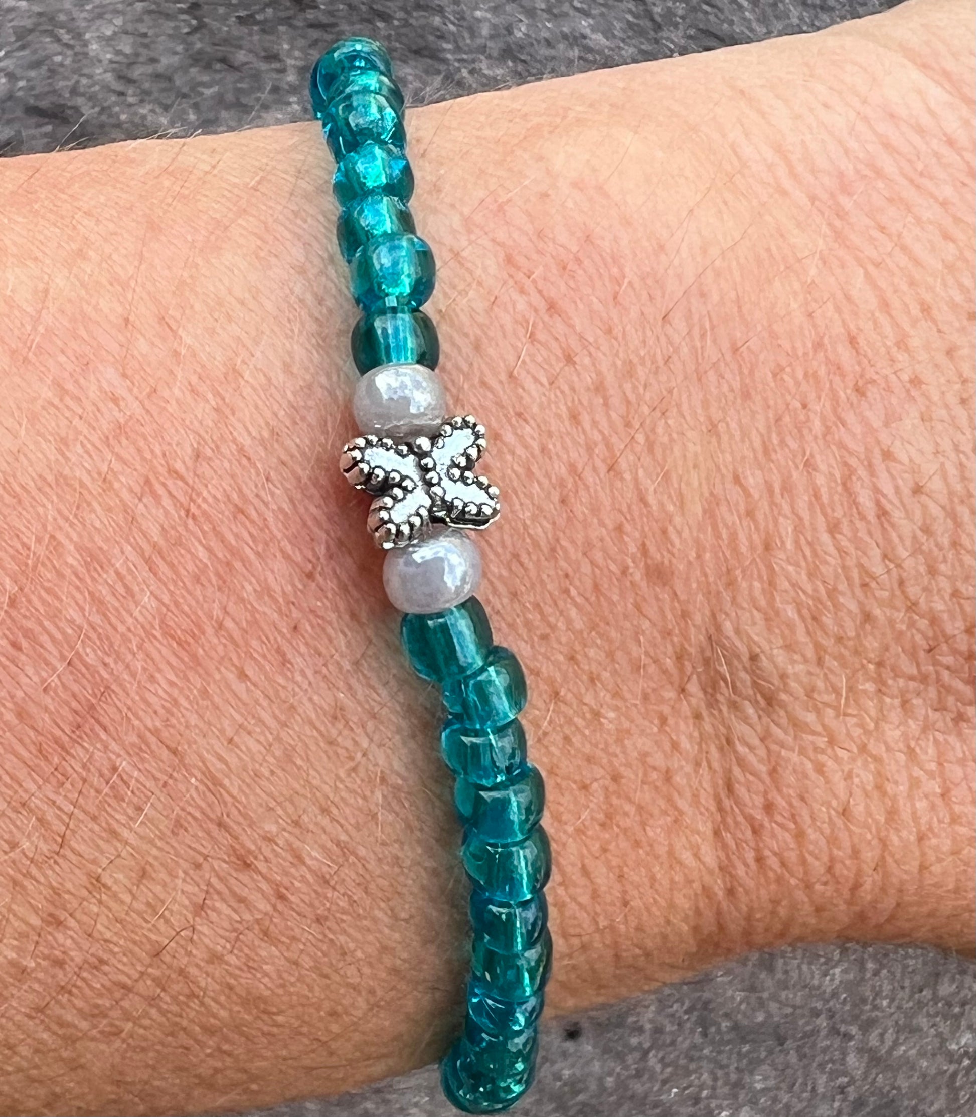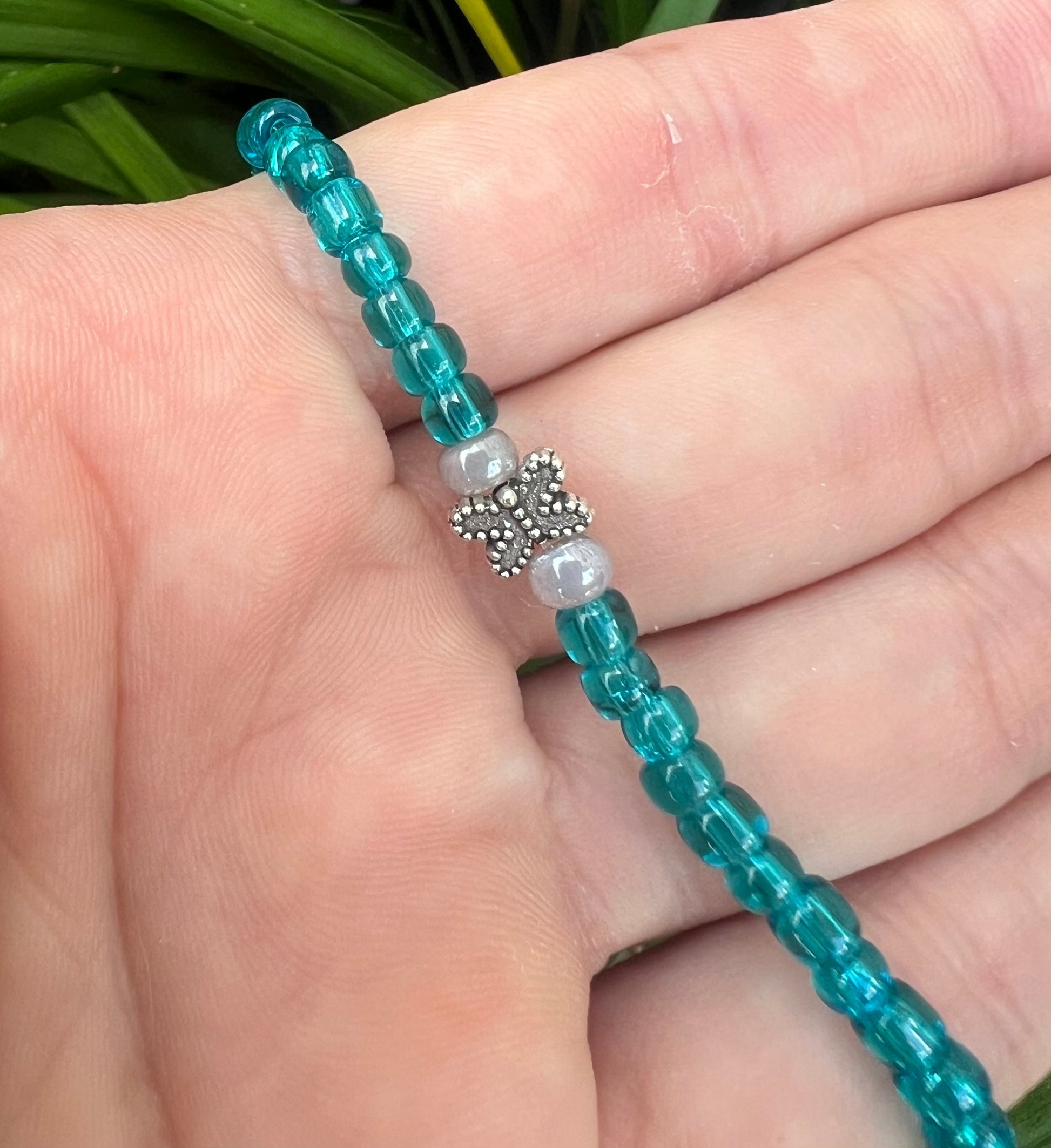 Pretty intricate butterflies surrounded by teal glass seed beads & silver accent beads.