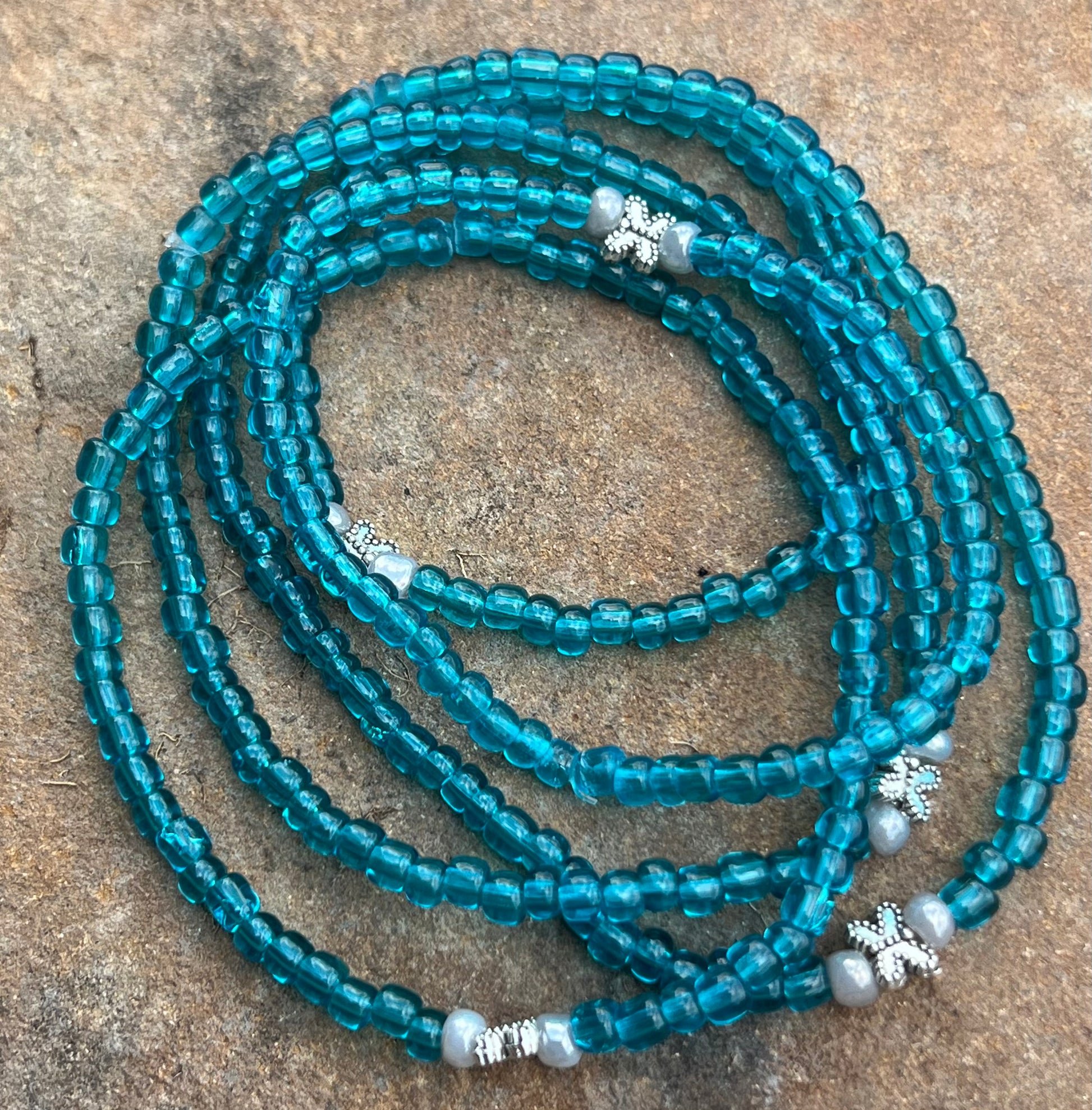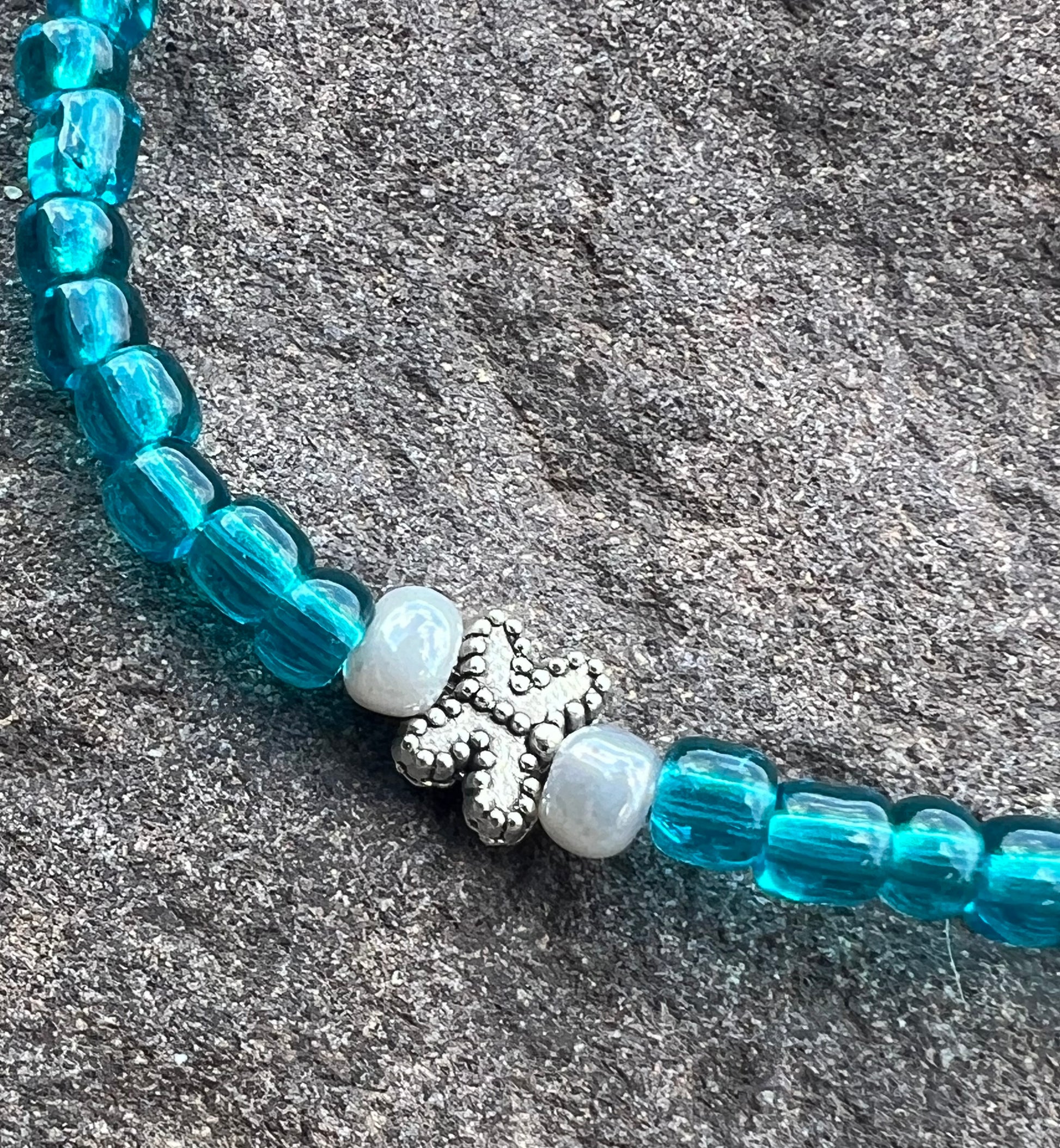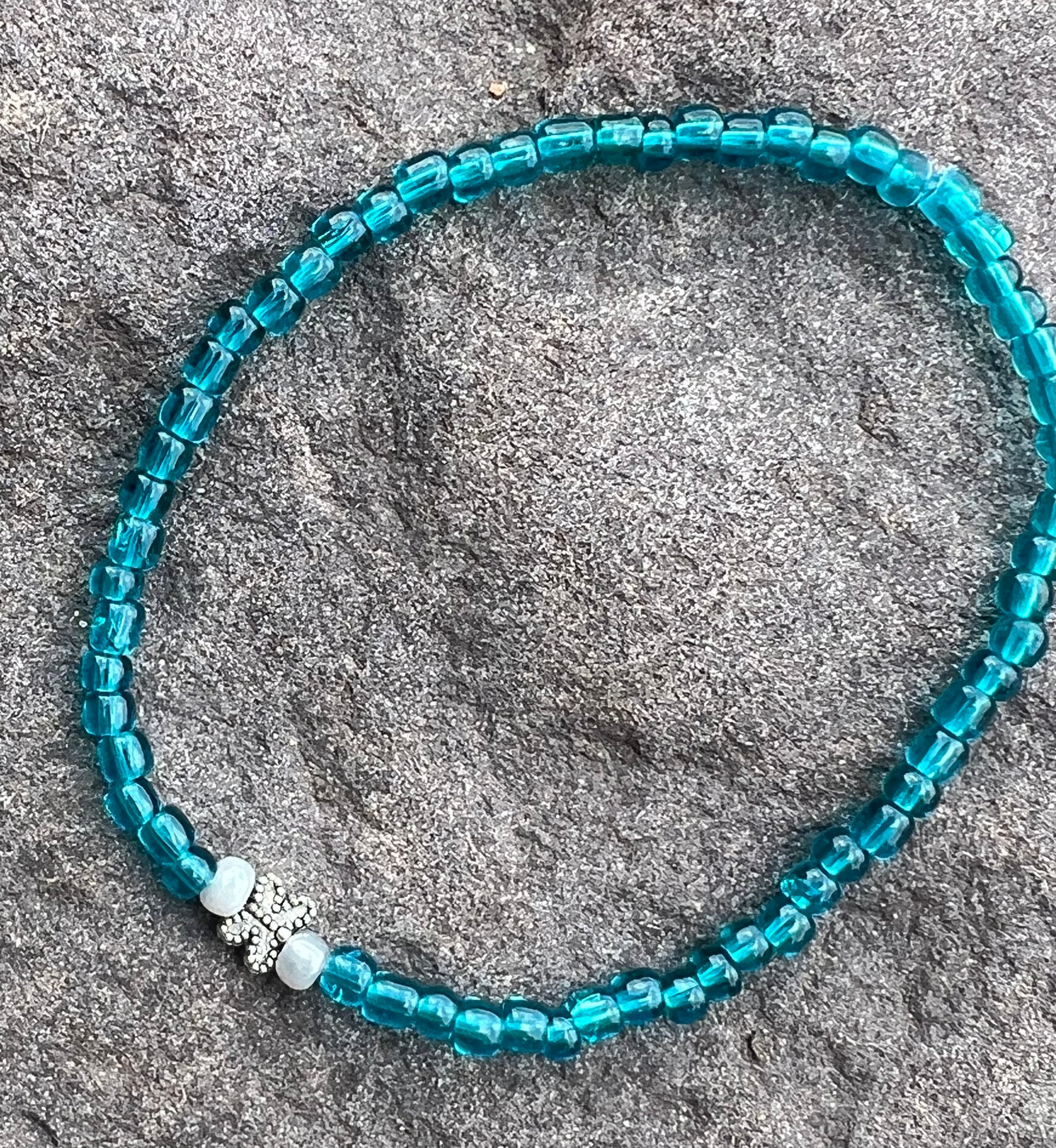 Pretty intricate butterflies surrounded by teal glass seed beads & silver accent beads.