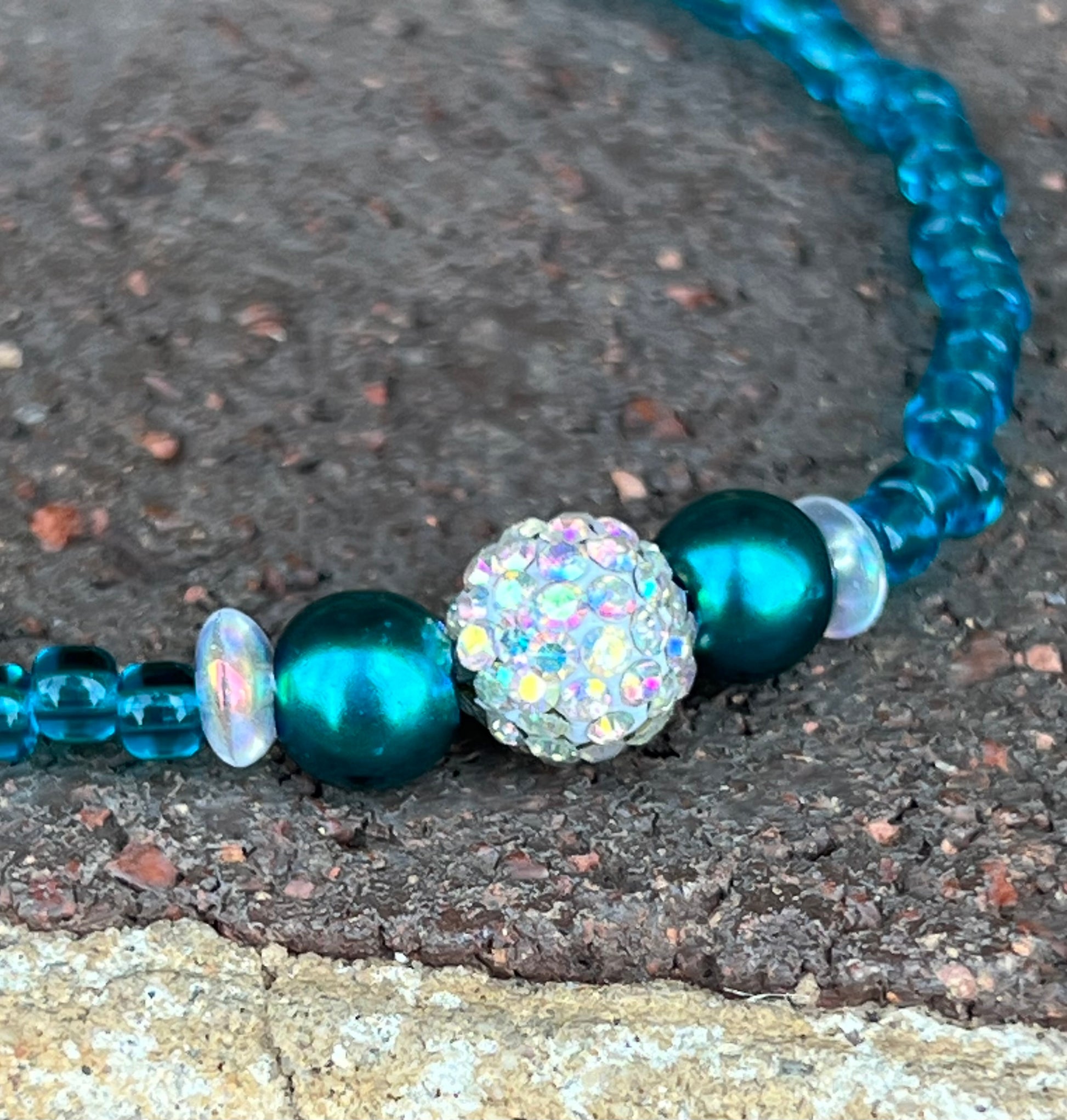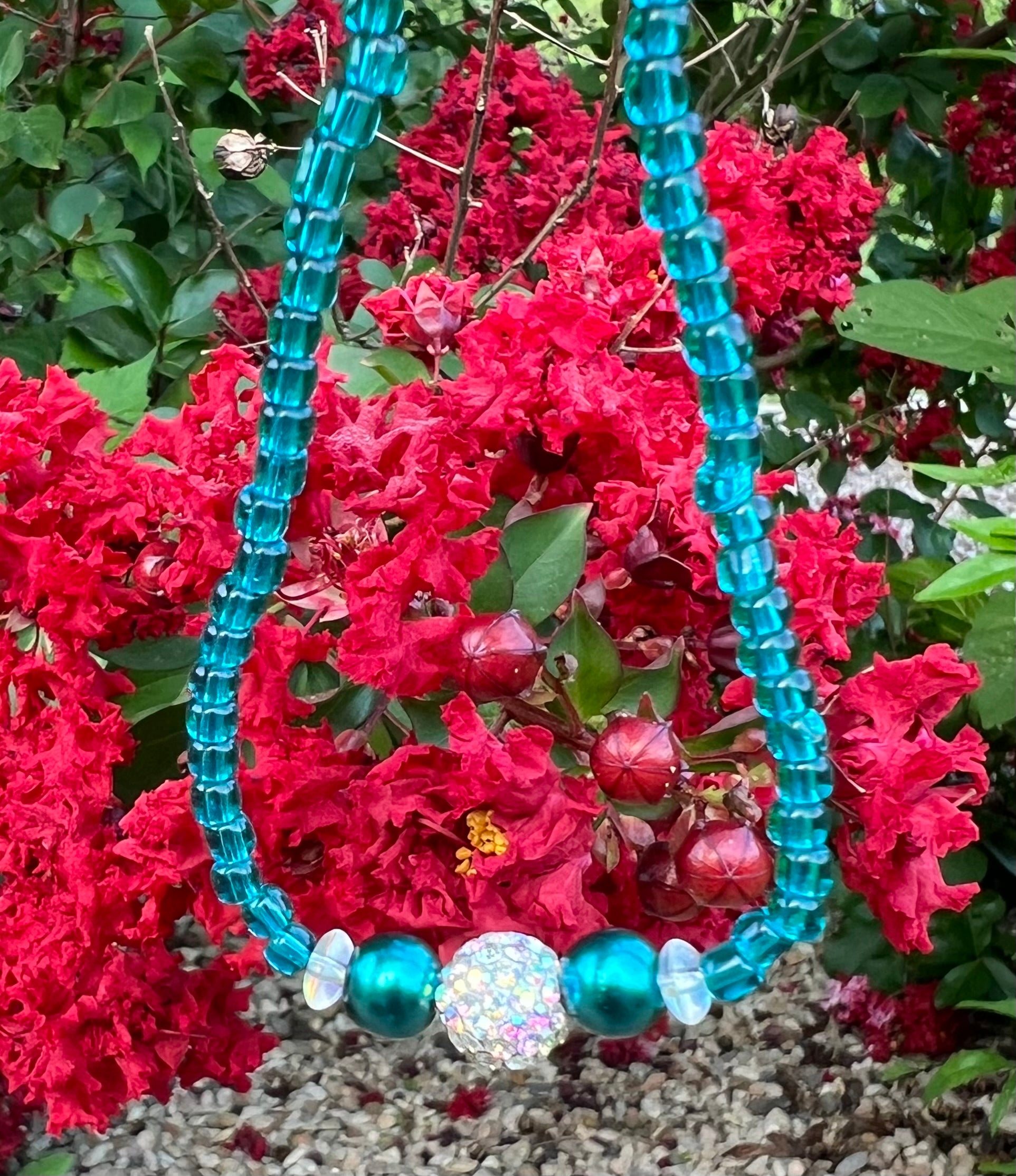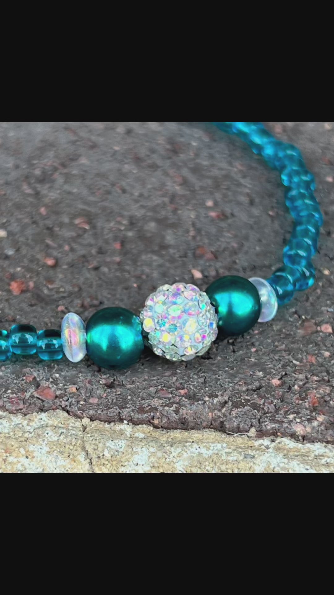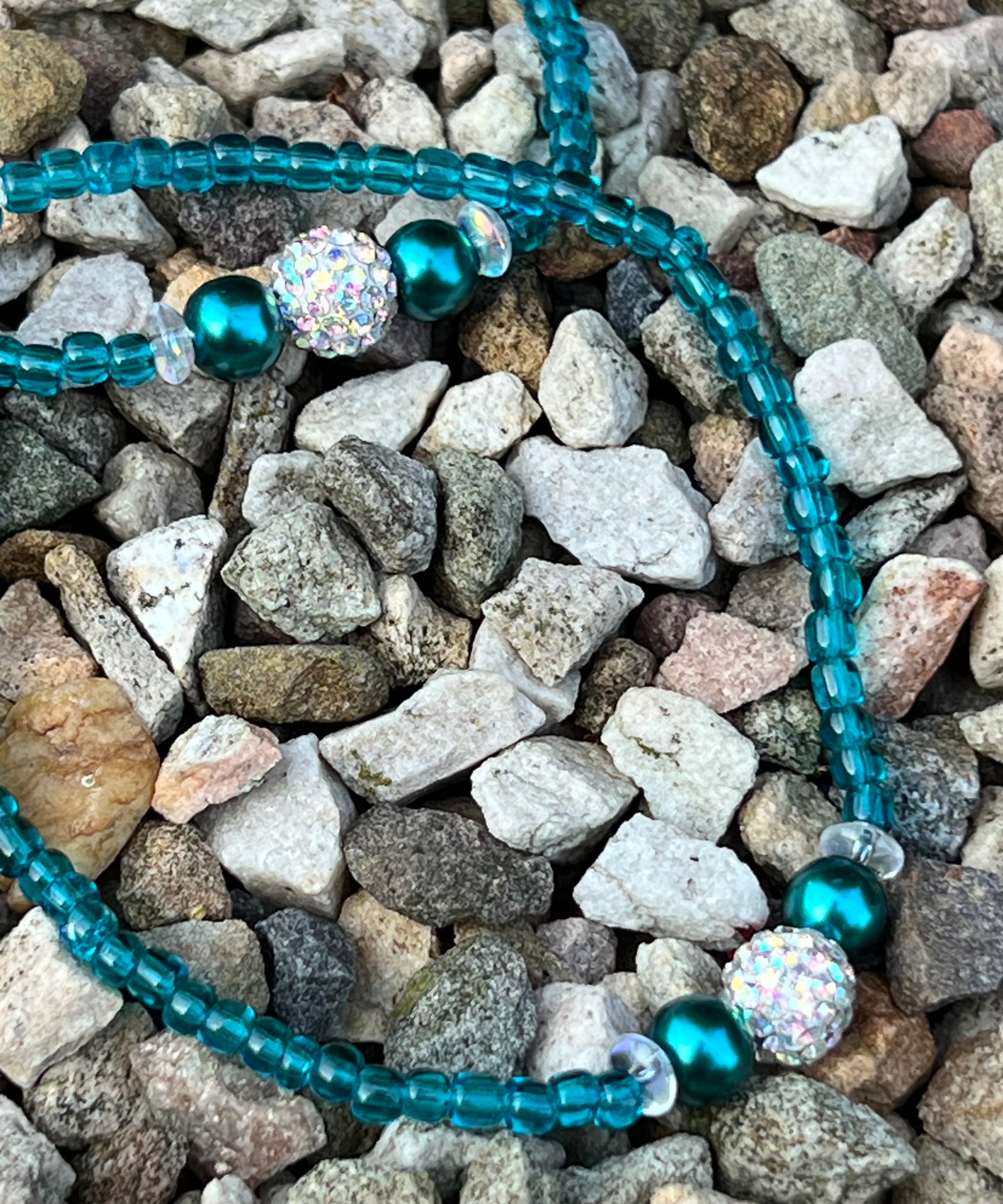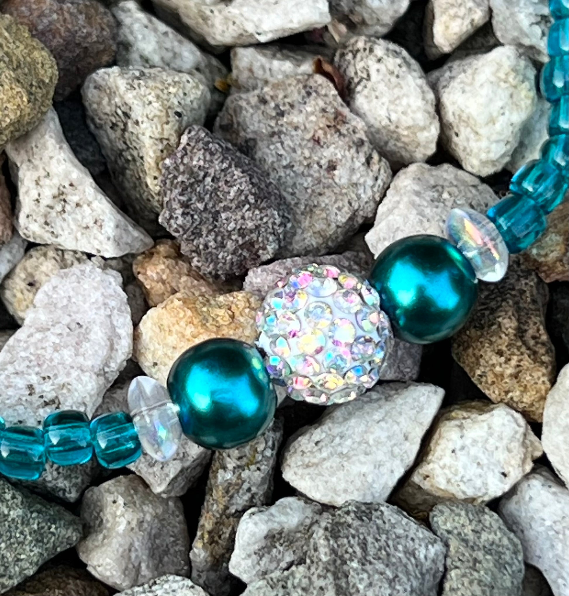 Glass see through teal seed beads with metallic teal round beads, disc beads, & a Blingy center beads.
