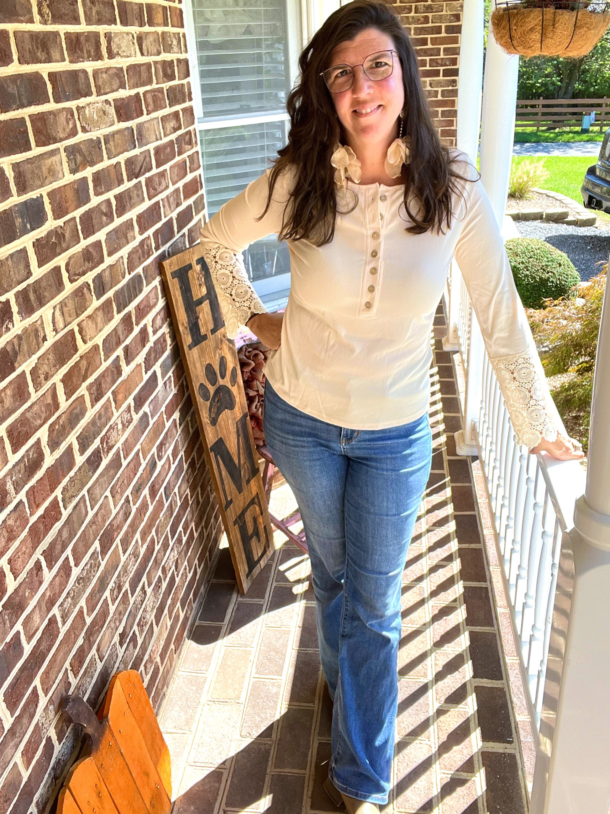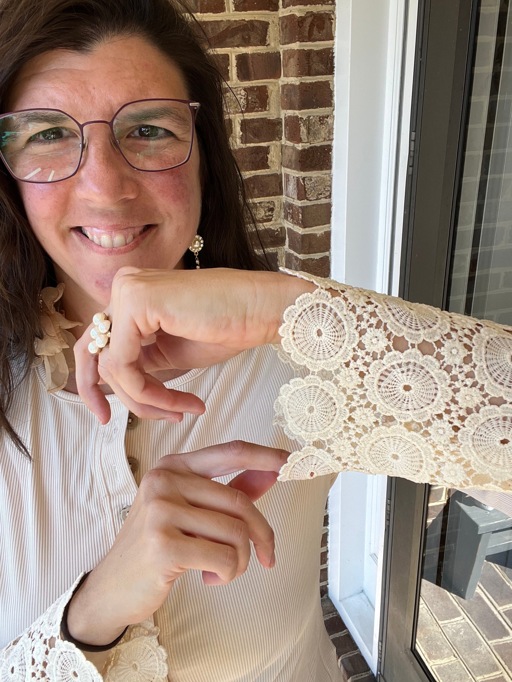 Scoop neck button front top with crocheted lace sleeves. Ribbed material. We recommend sizing up in this one as it is fitted.