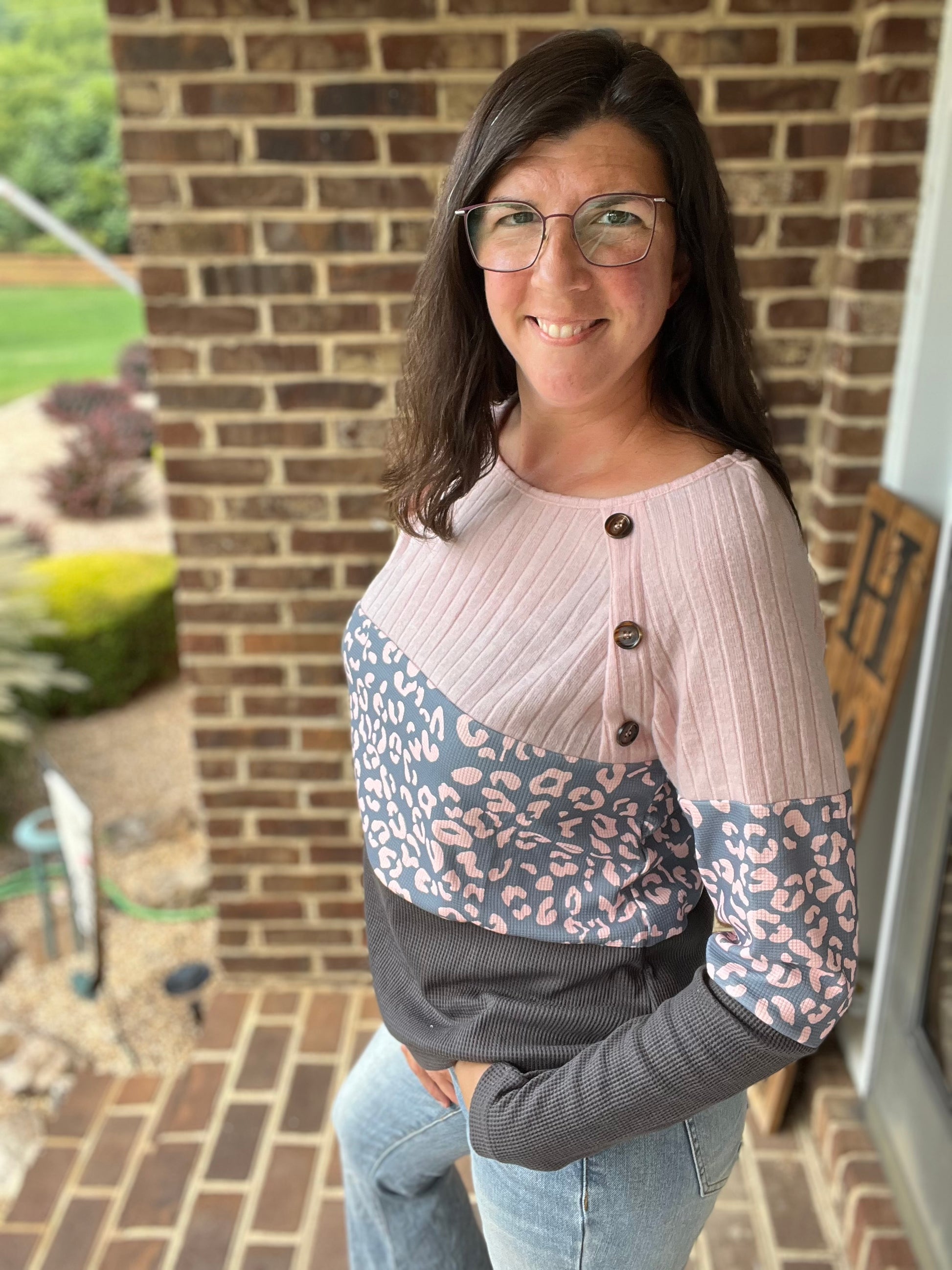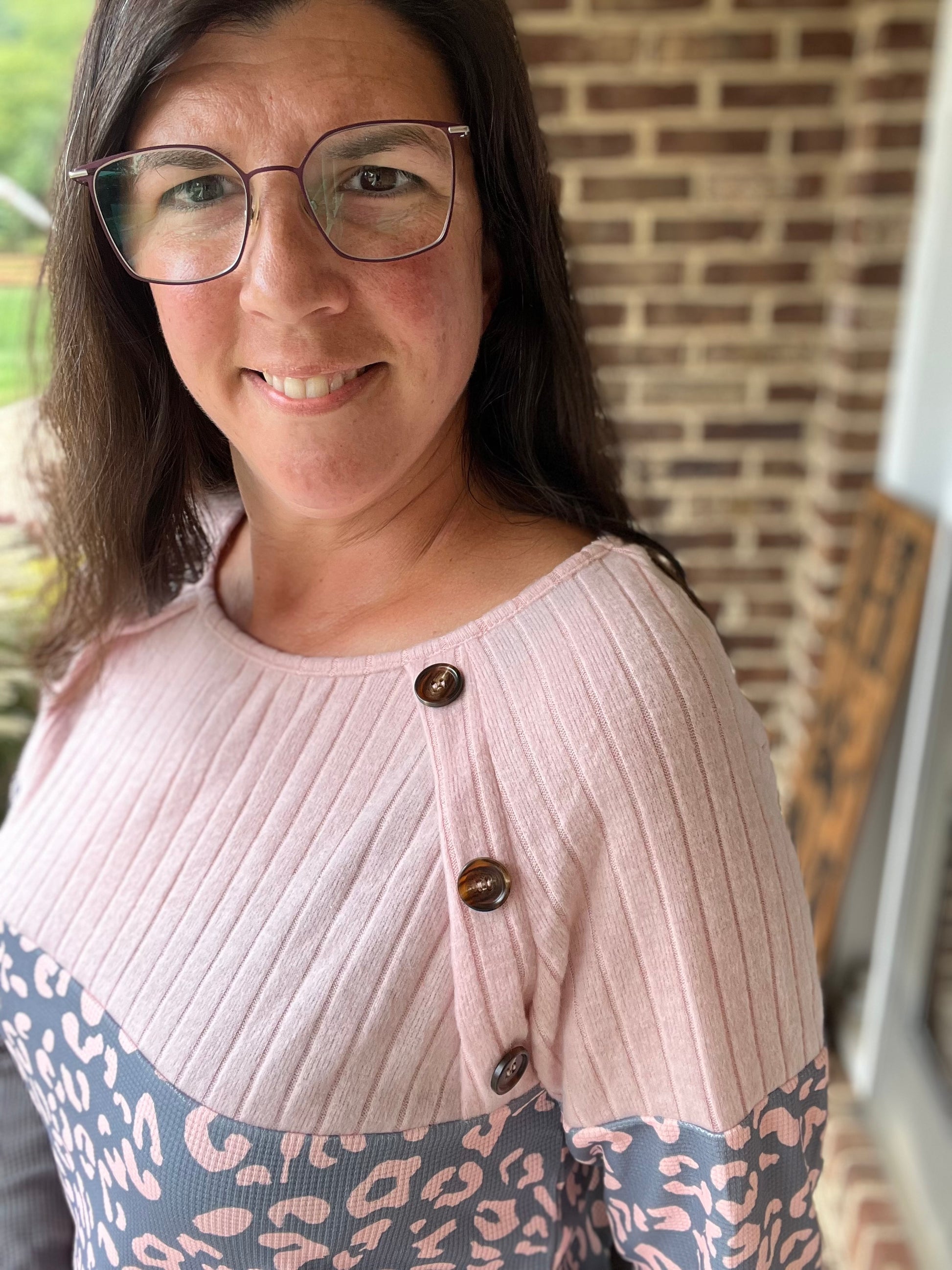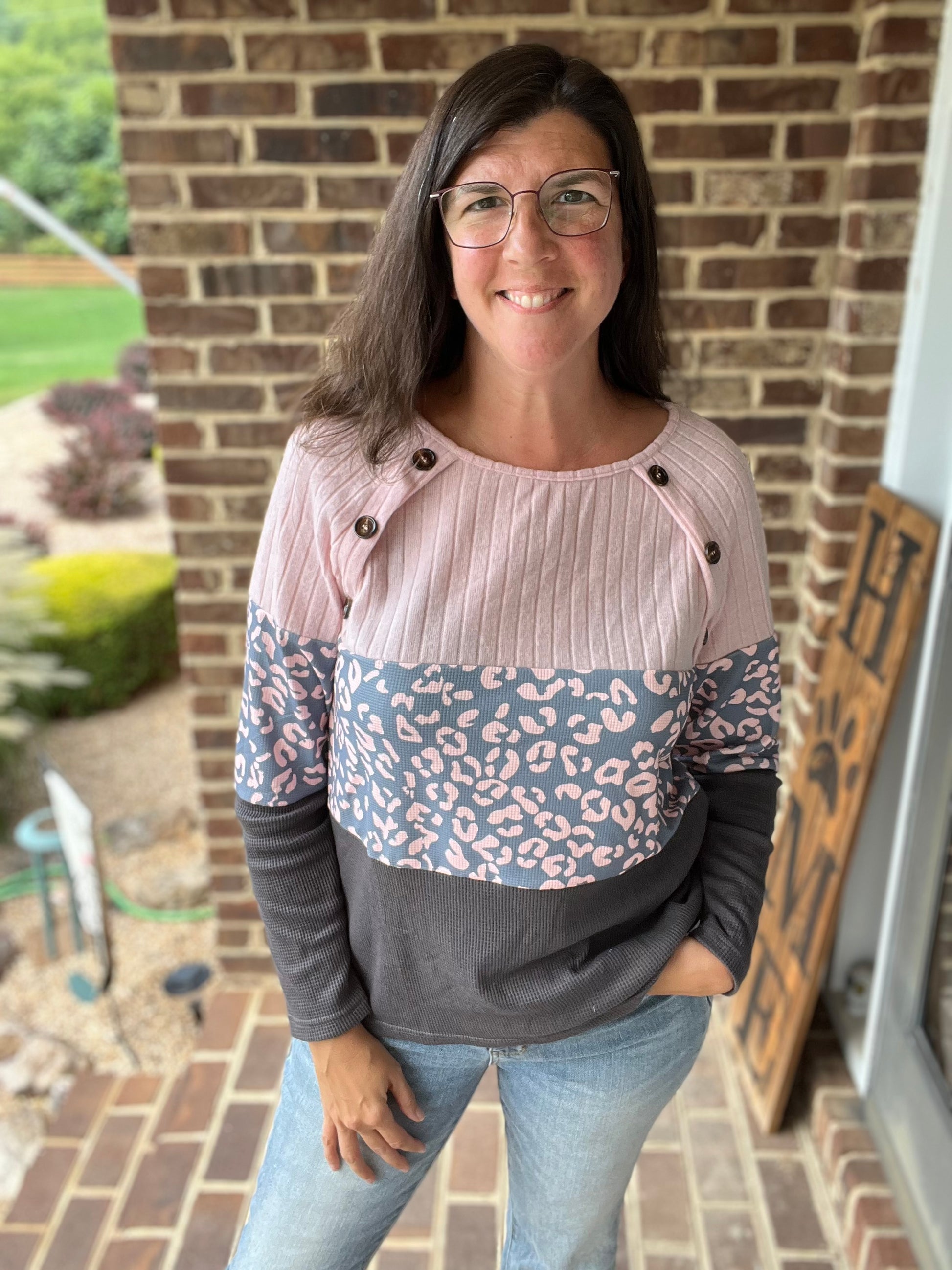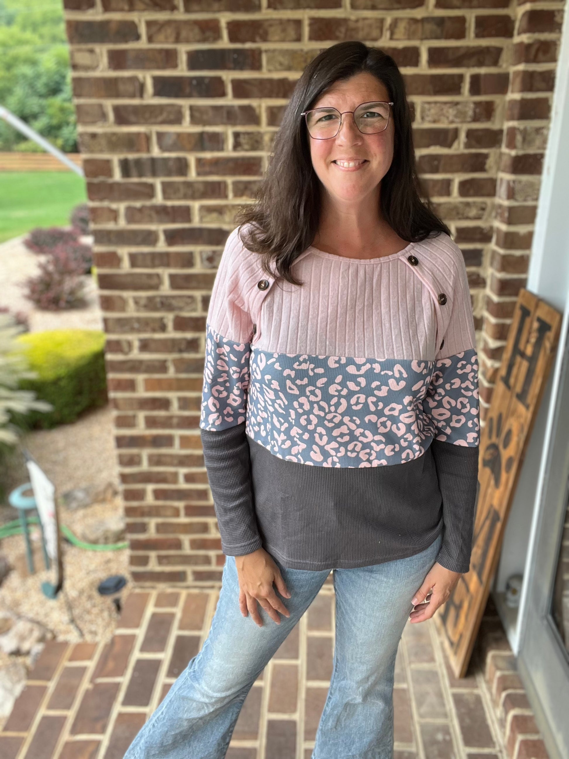 Leopard Grey & Pink Button Sweater