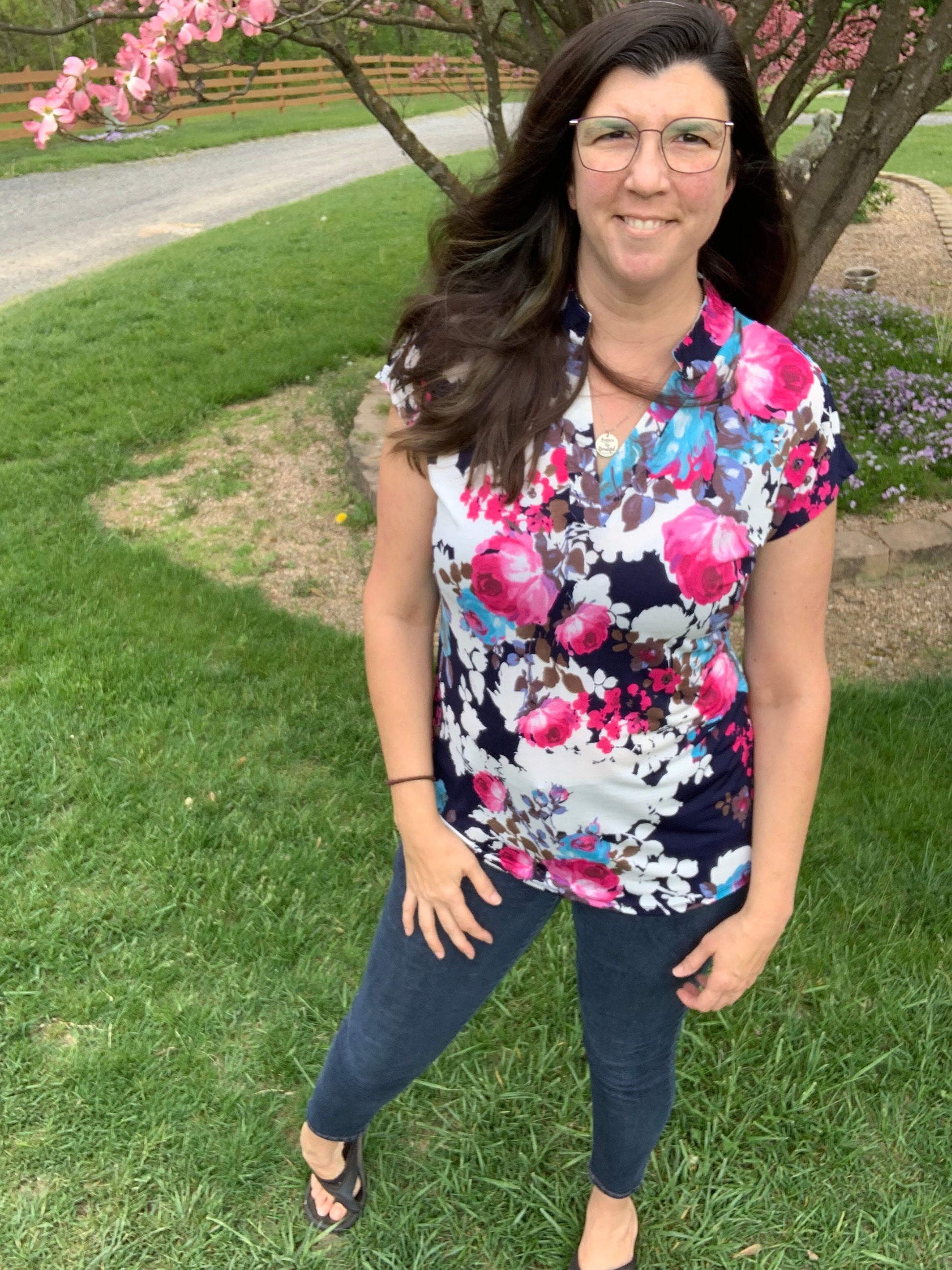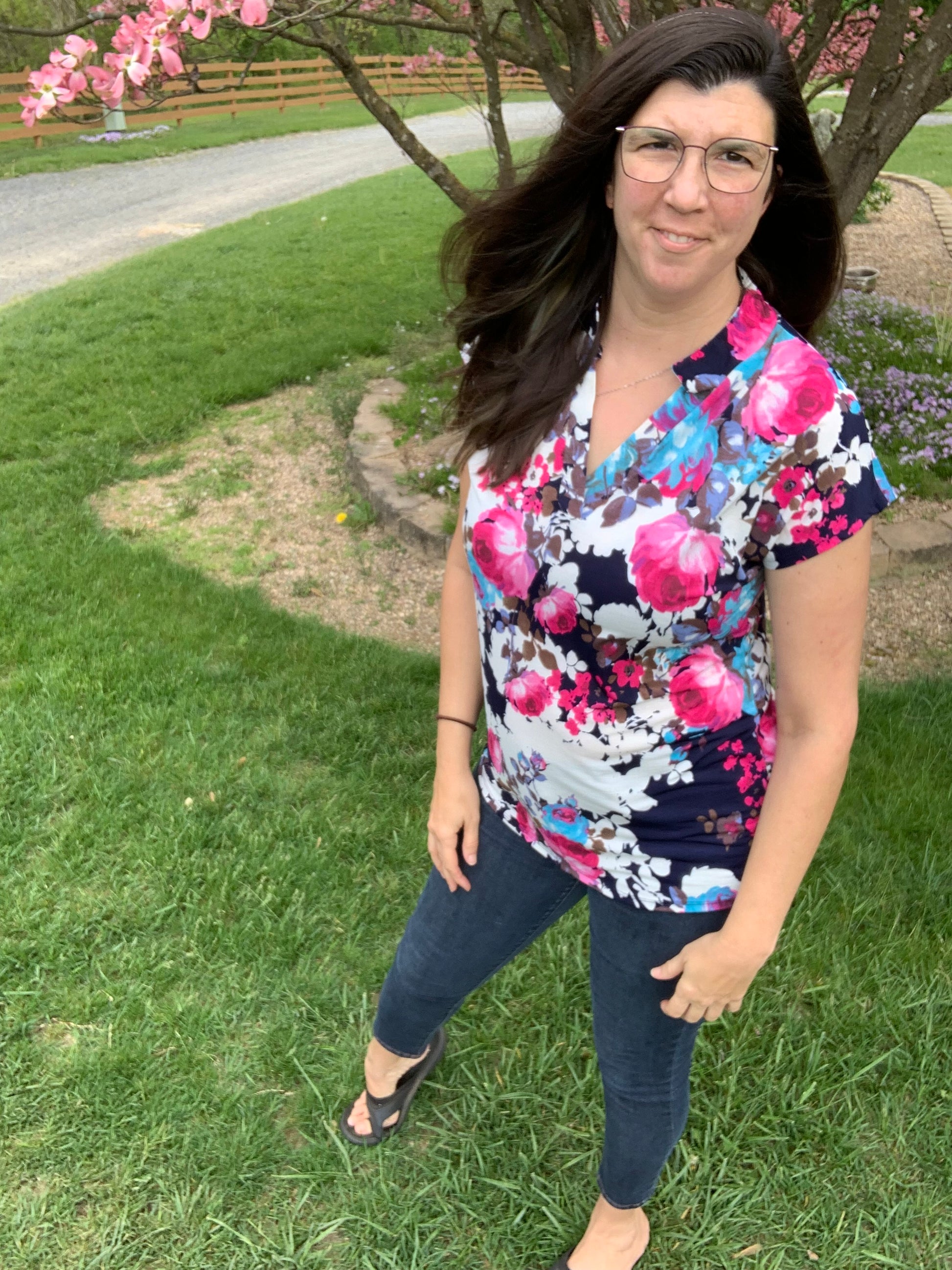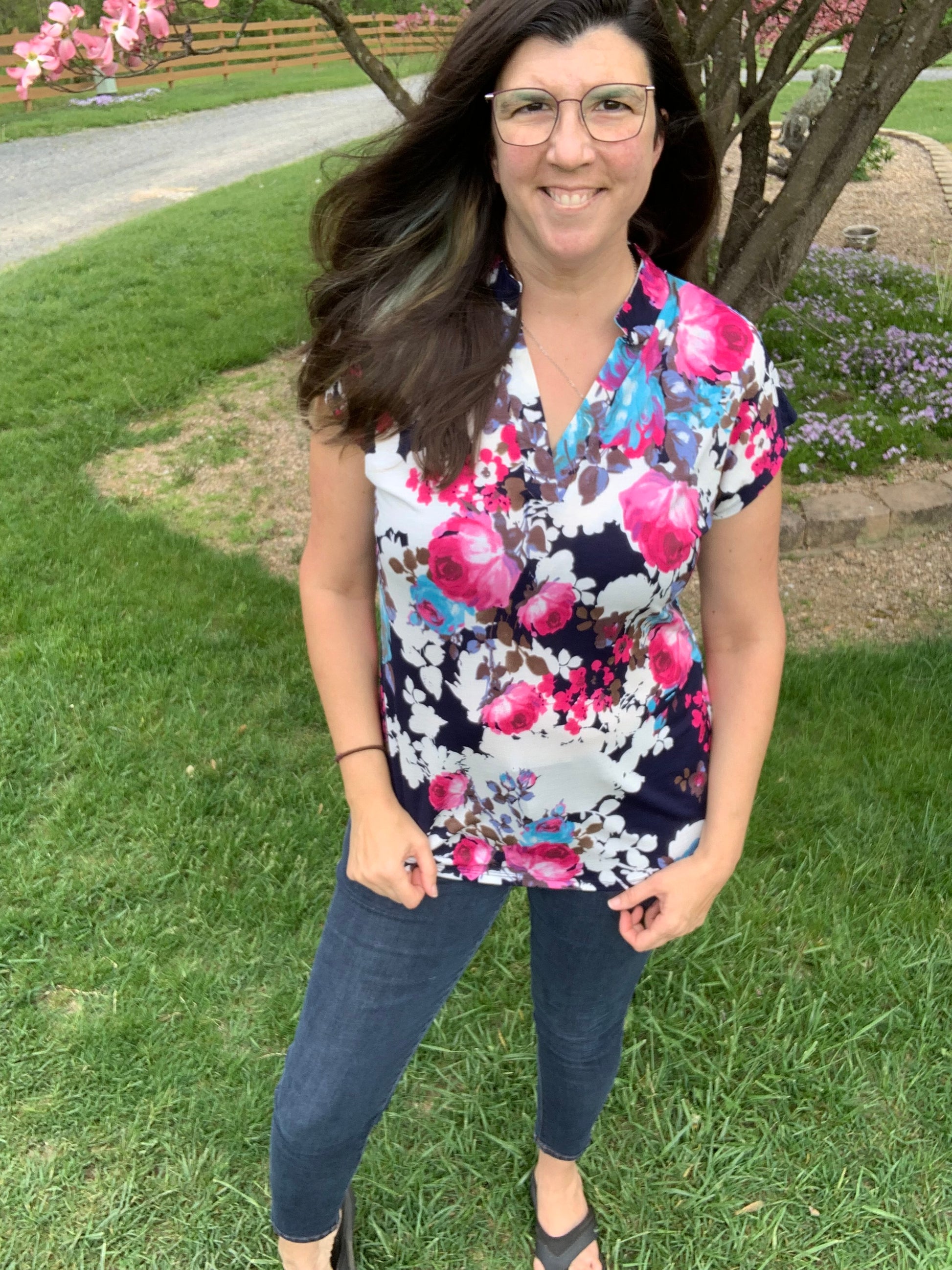 Beautiful floral top with navy, pink, purple, white, & olive.