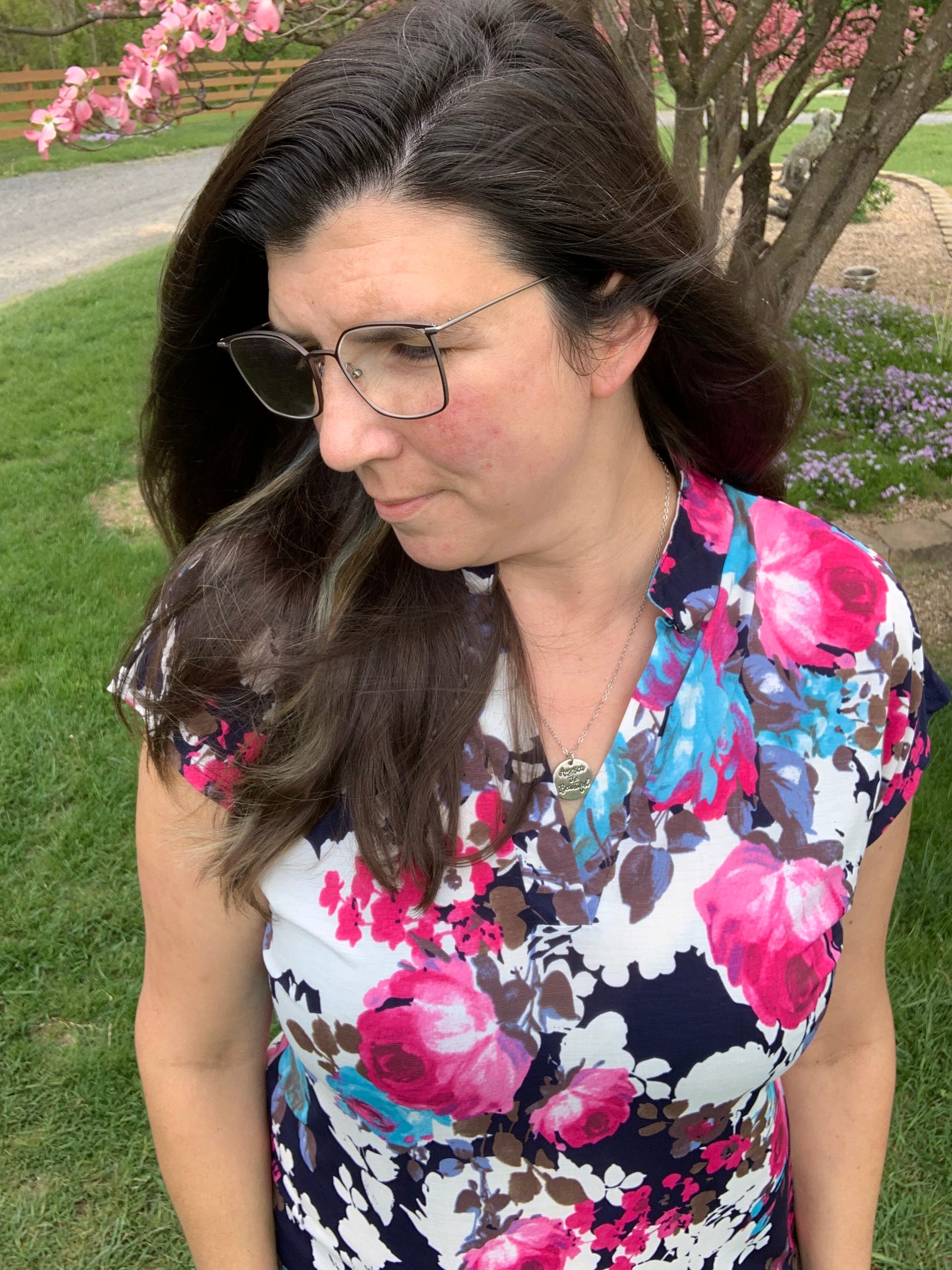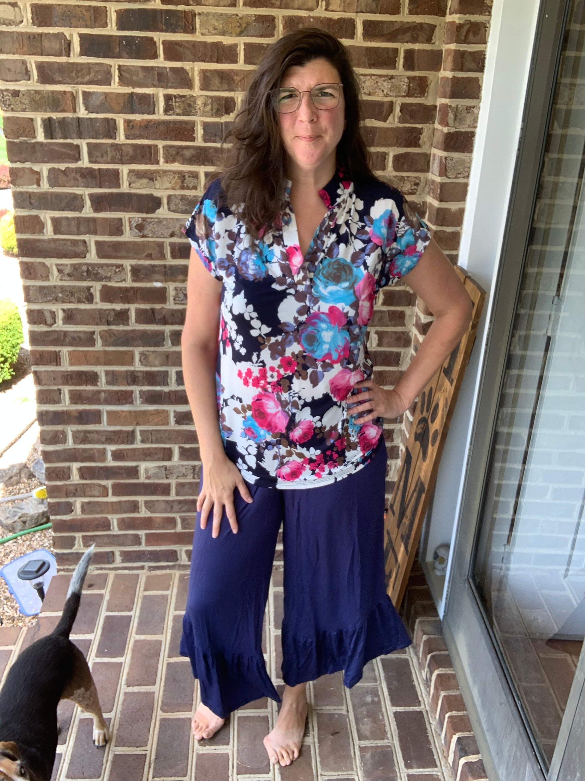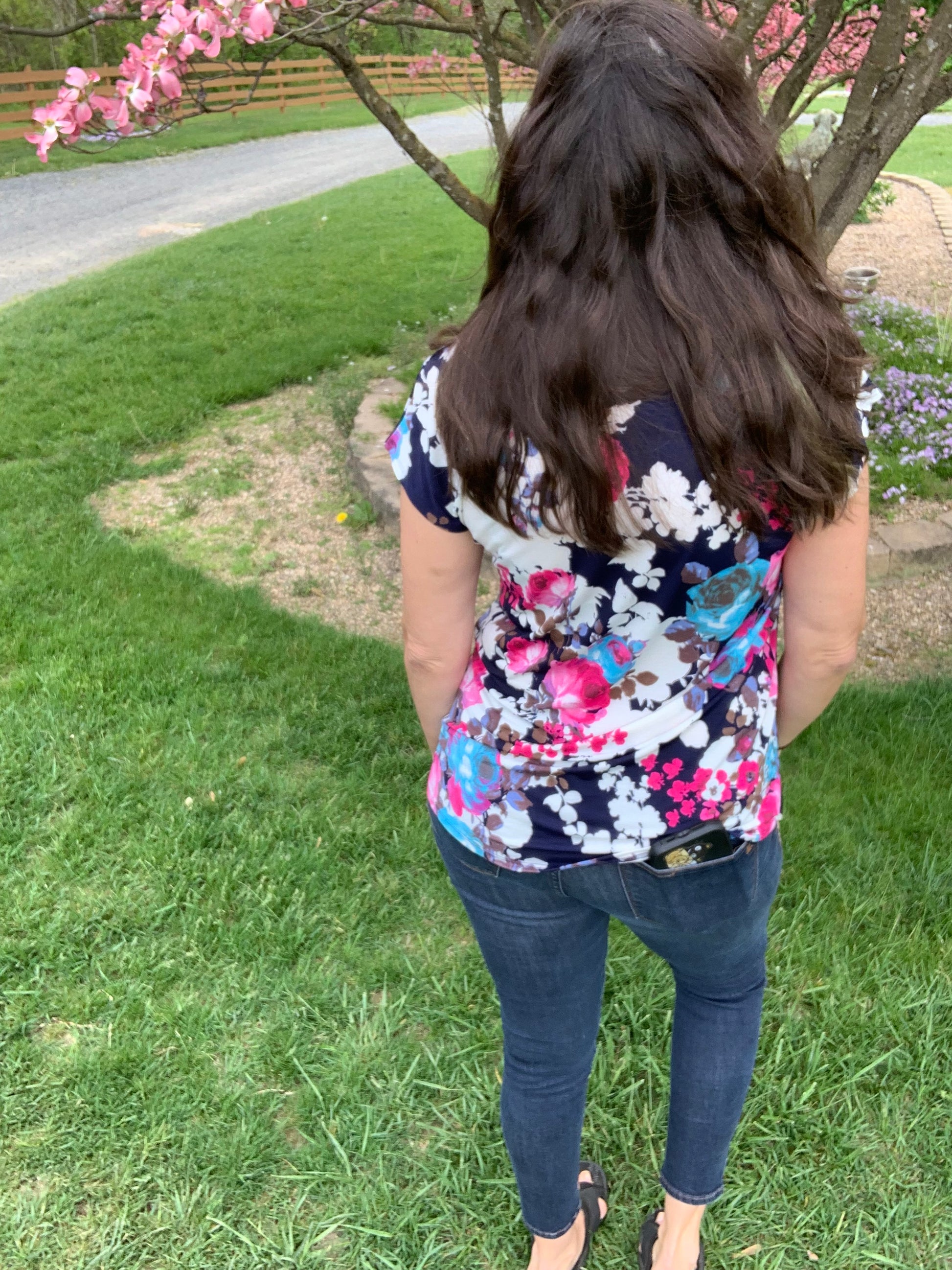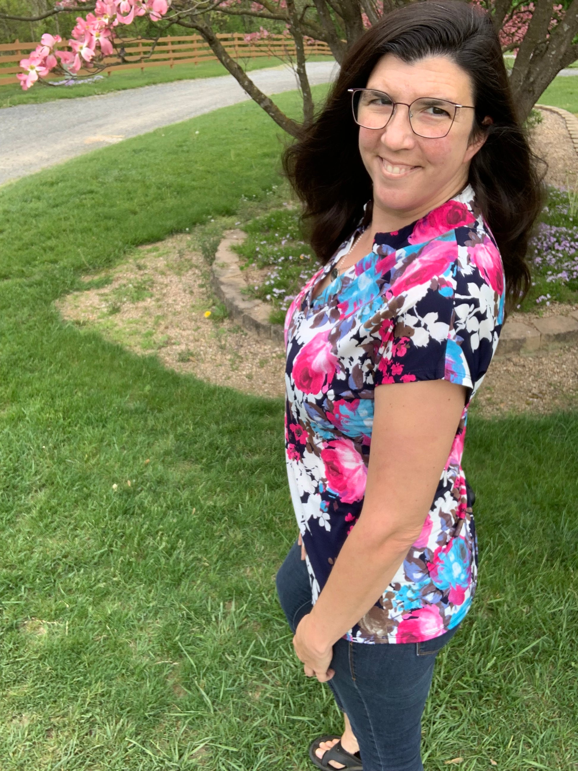 Beautiful floral top with navy, pink, purple, white, & olive.