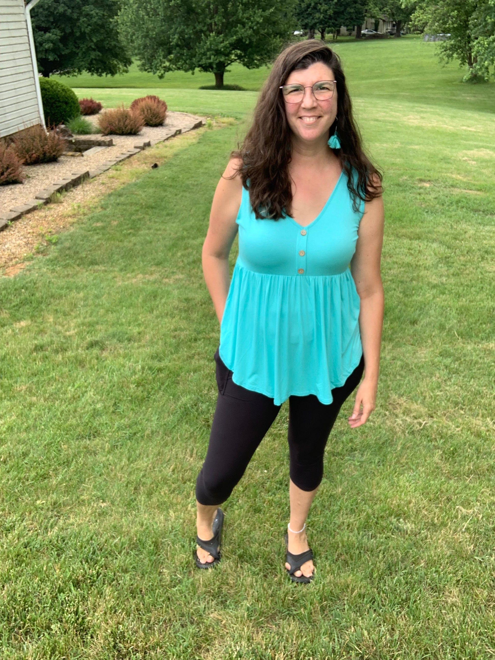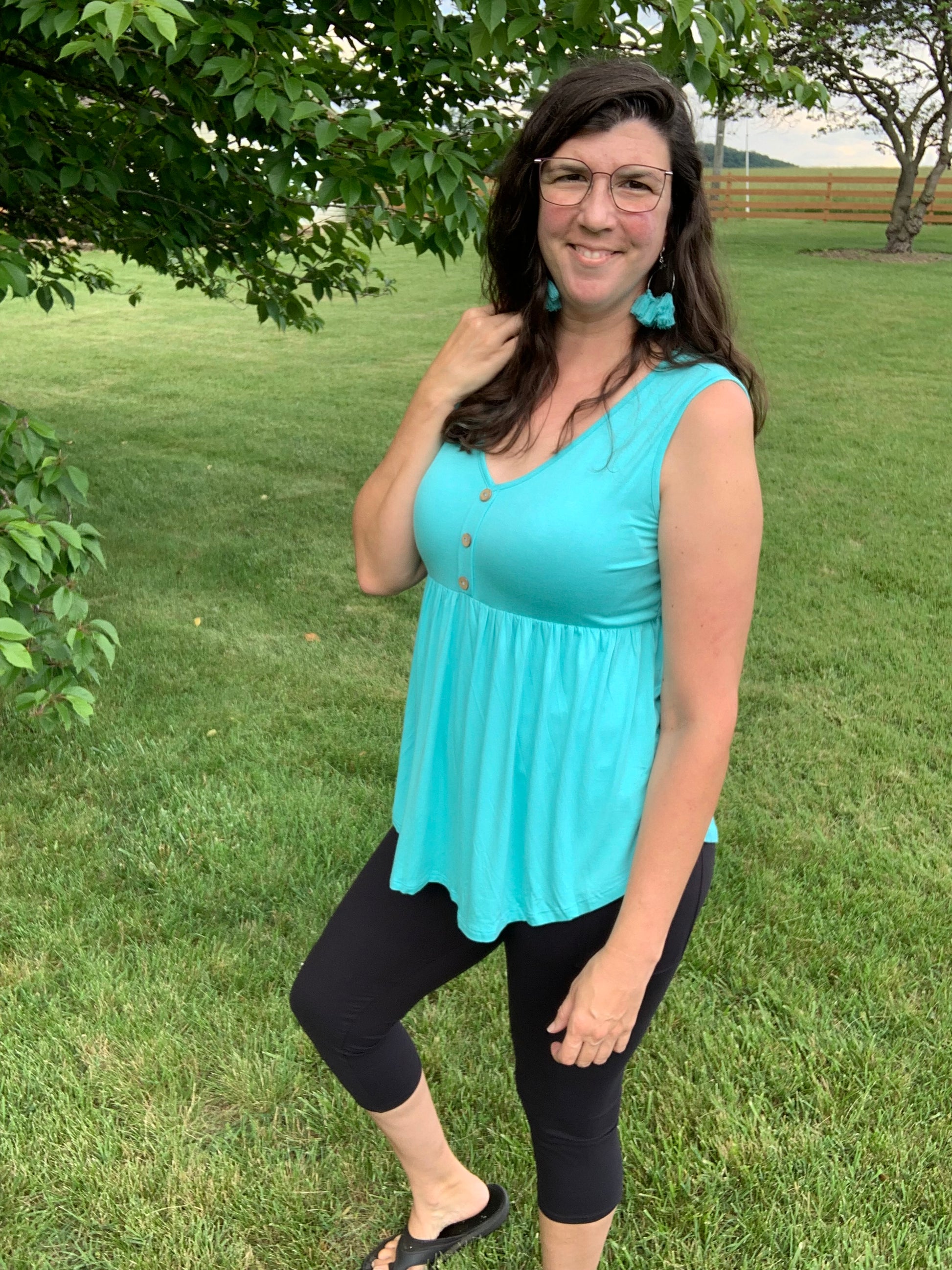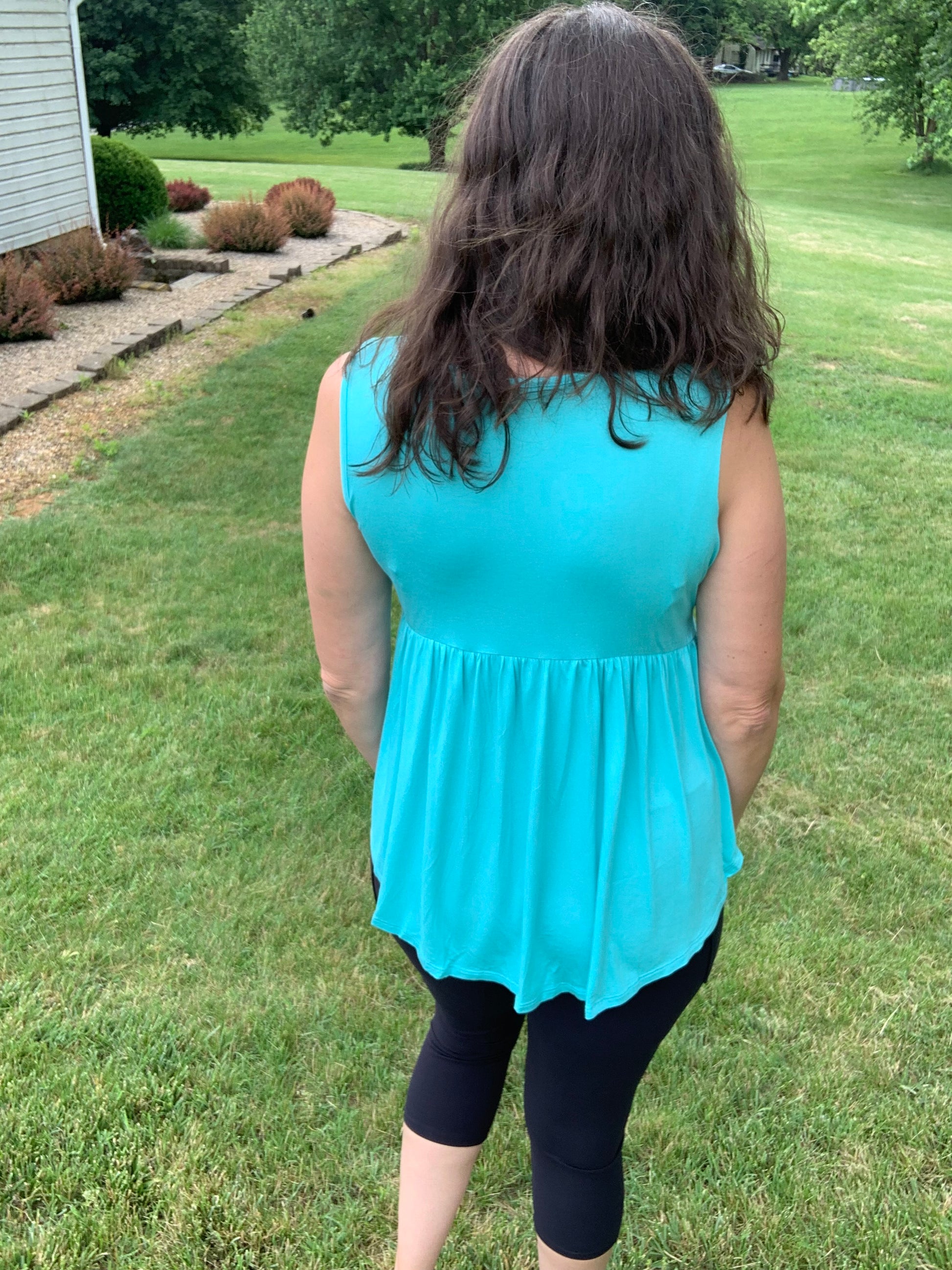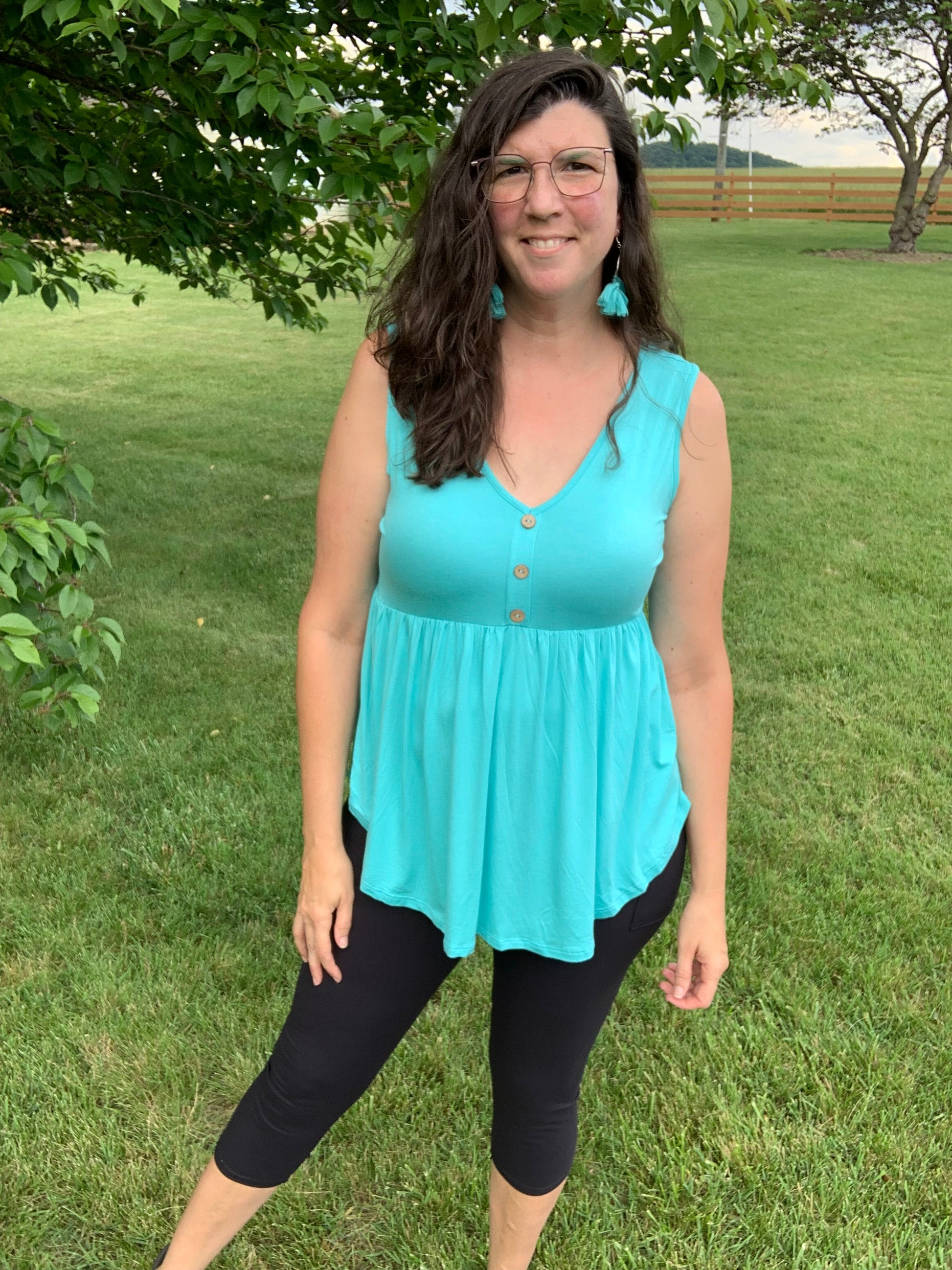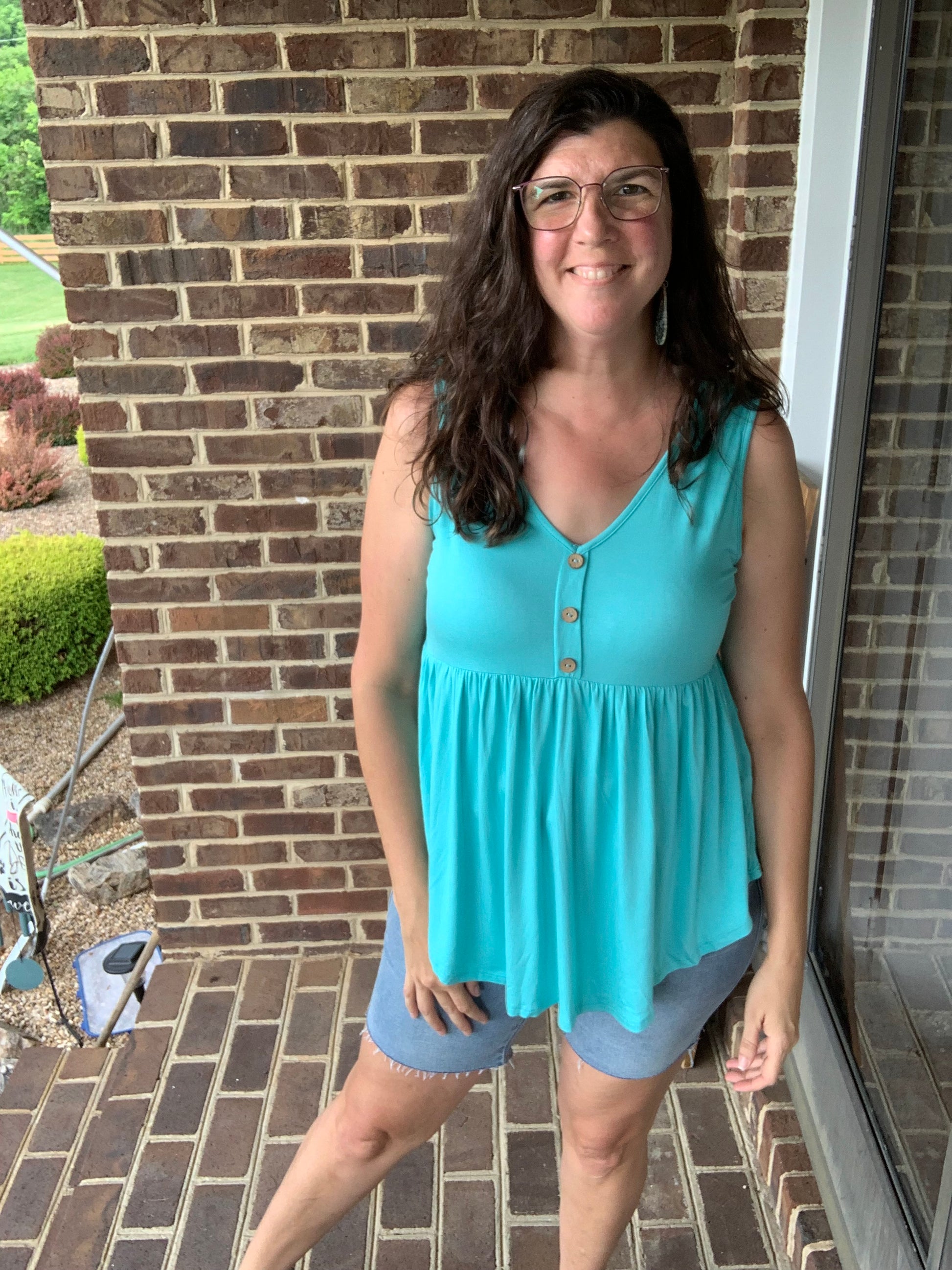 🩵 Striking turquoise flowy babydoll tank top. Super soft & stretchy. Features a v-neck, curved hemline, & faux buttons.