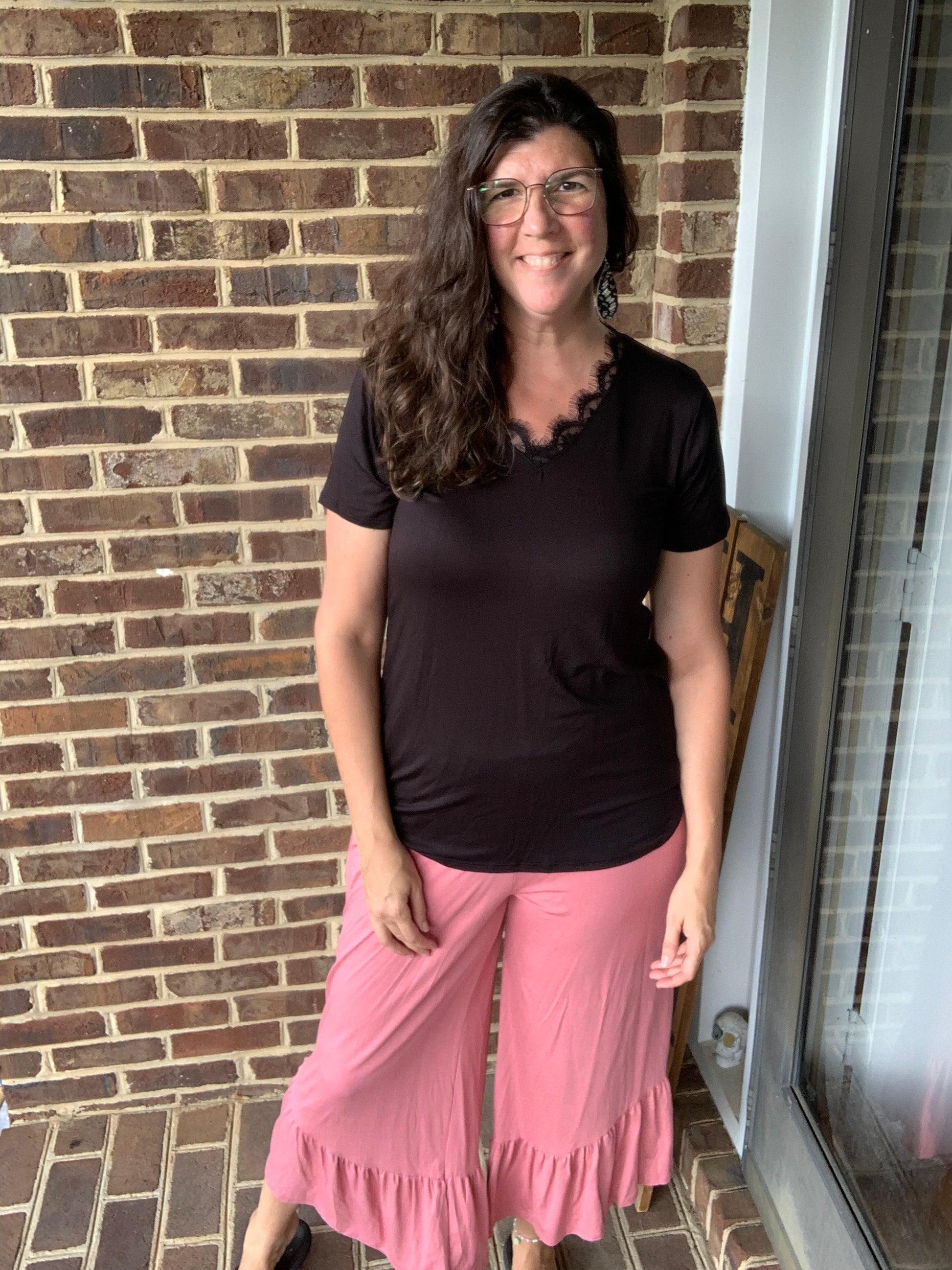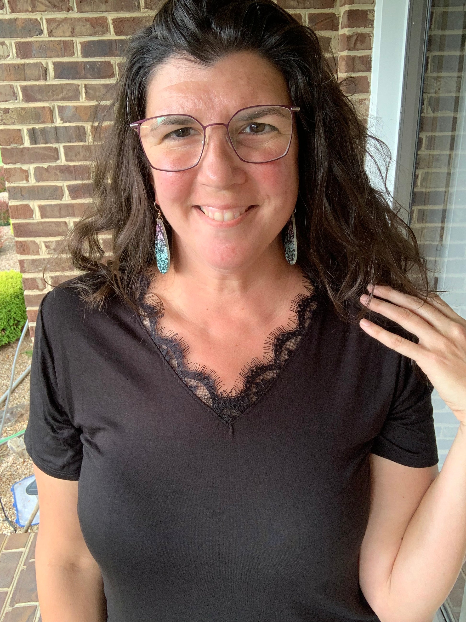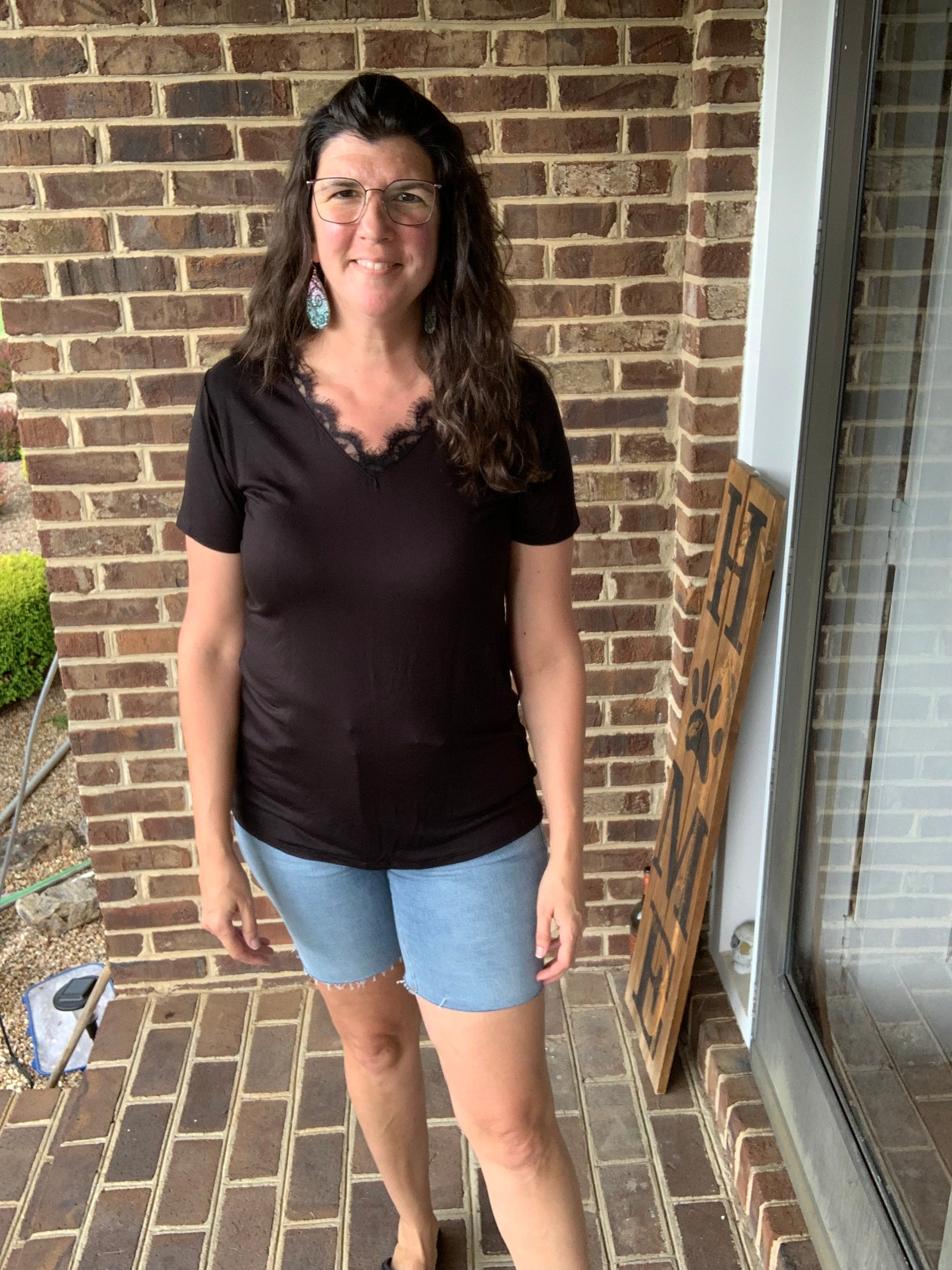 Solid black beautiful lace accented v-neck top. Very soft & stretchy. Perfect to dress up or down.