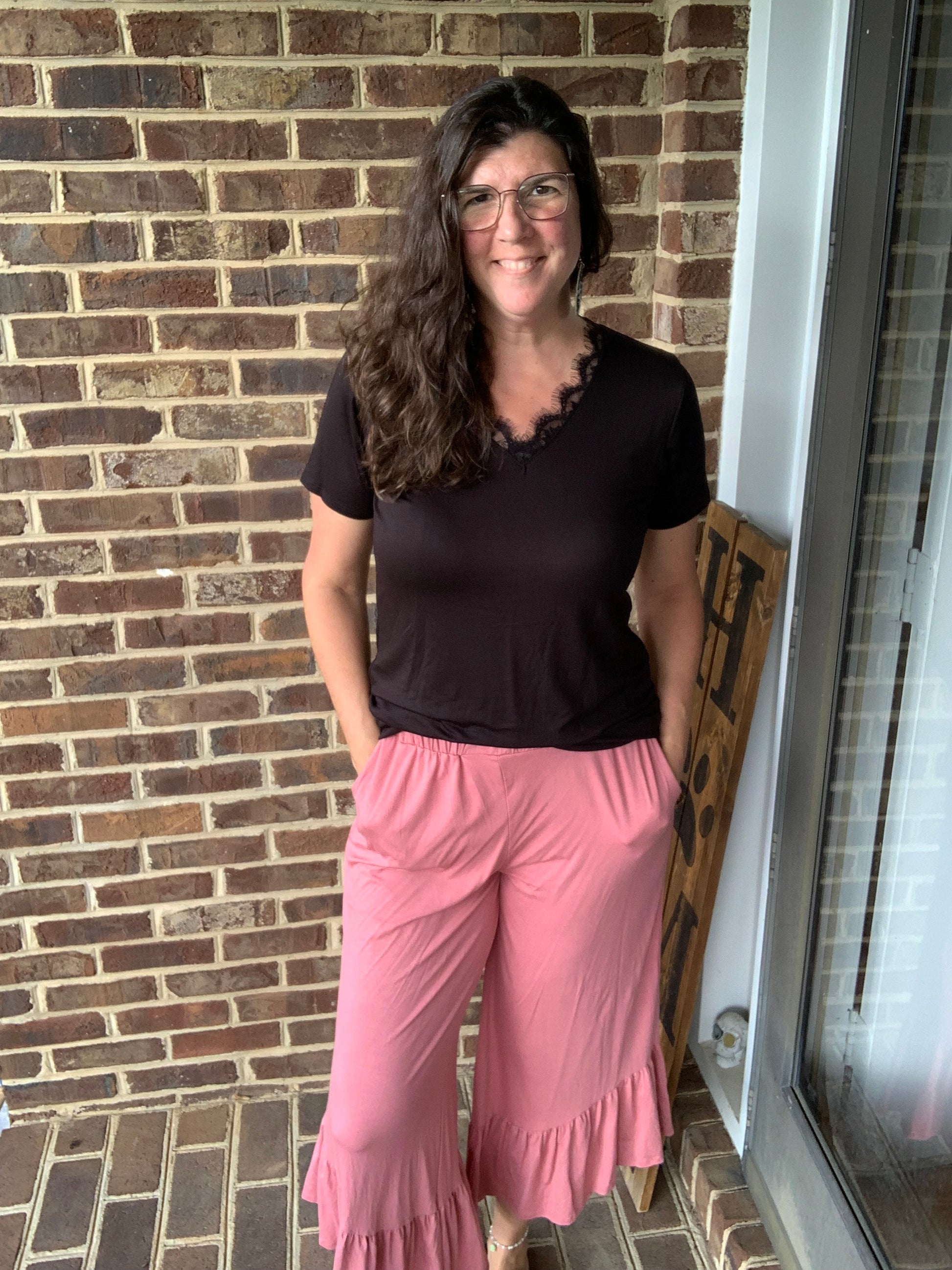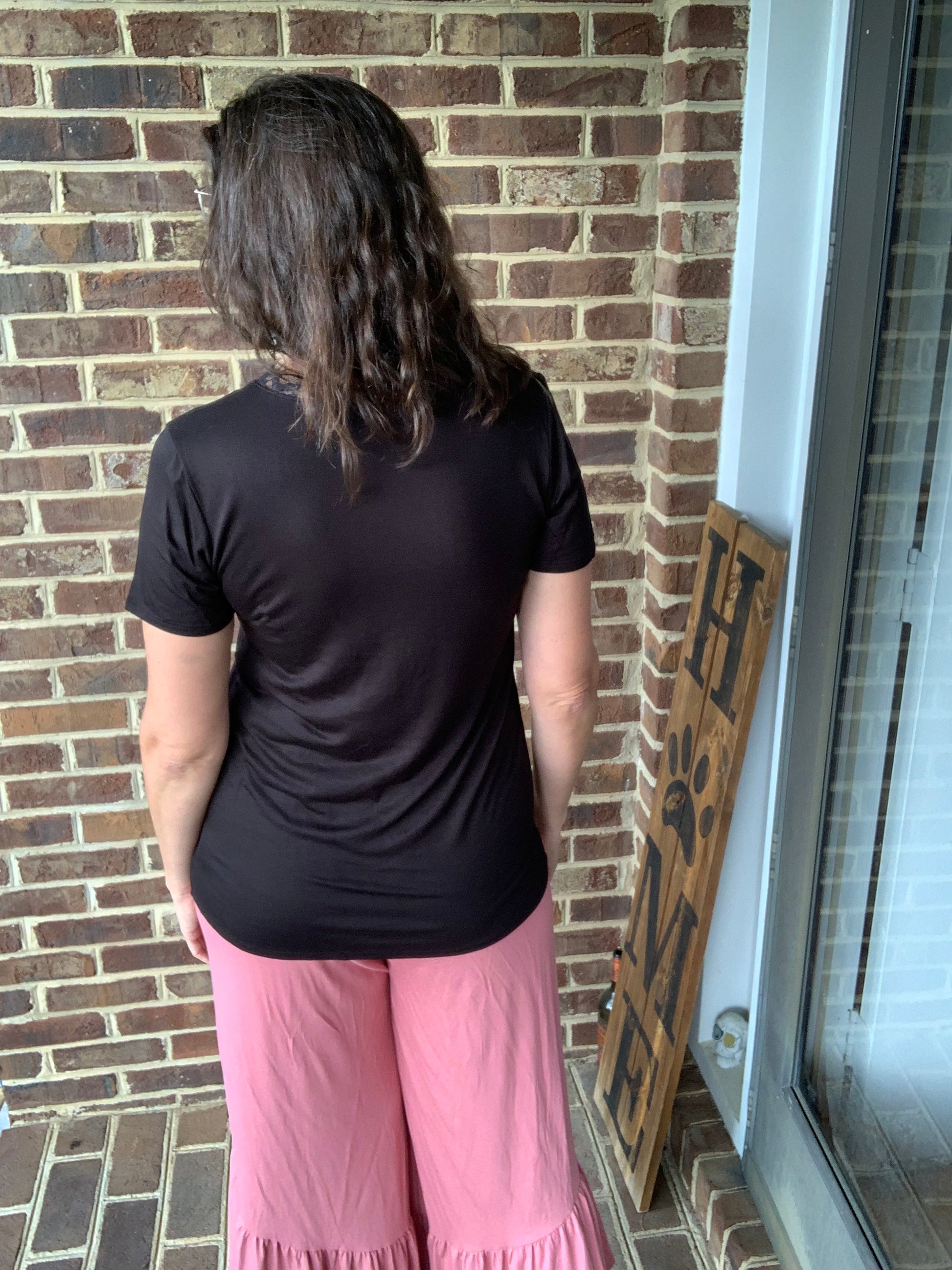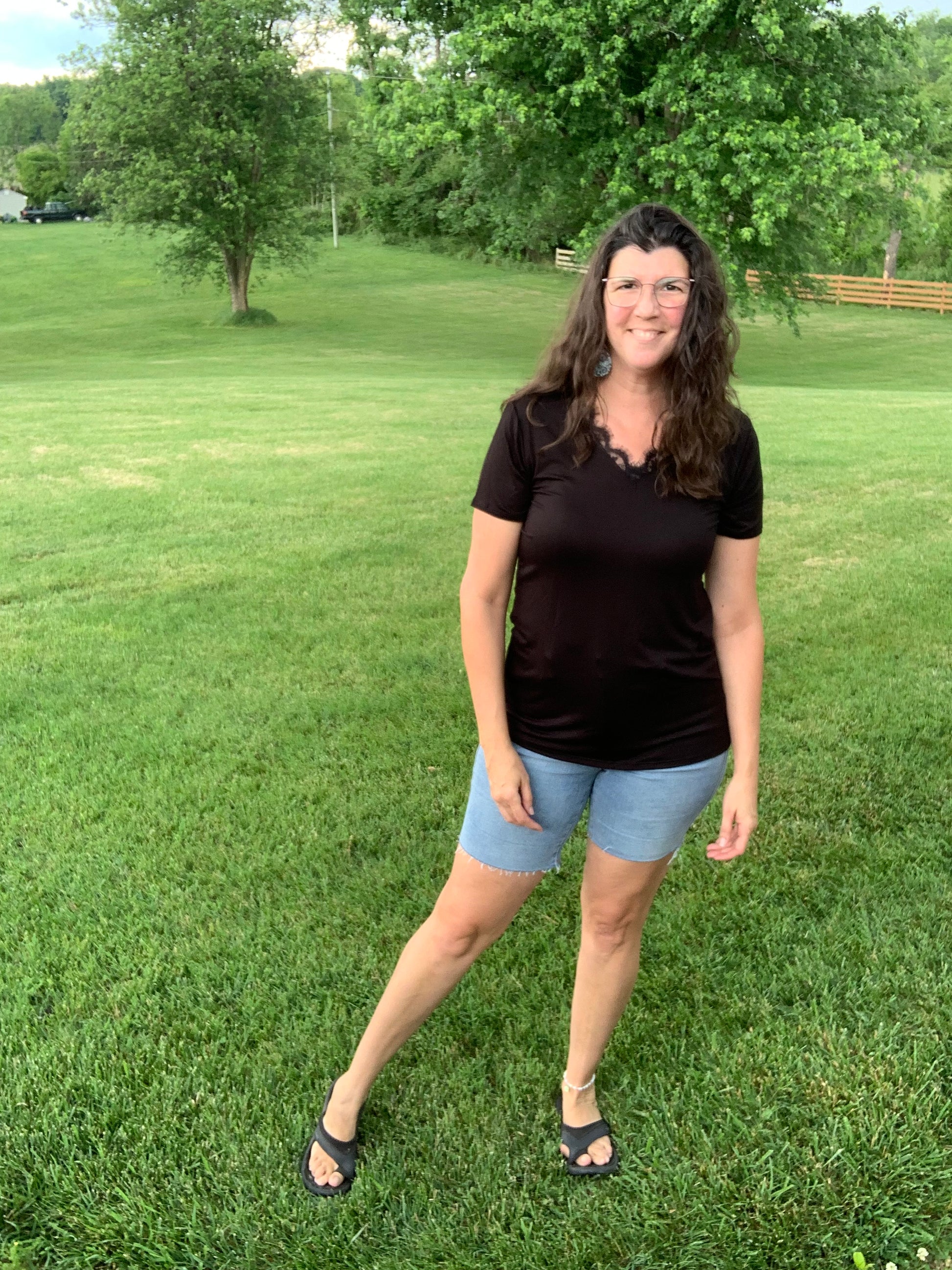 Solid black beautiful lace accented v-neck top. Very soft & stretchy. Perfect to dress up or down.