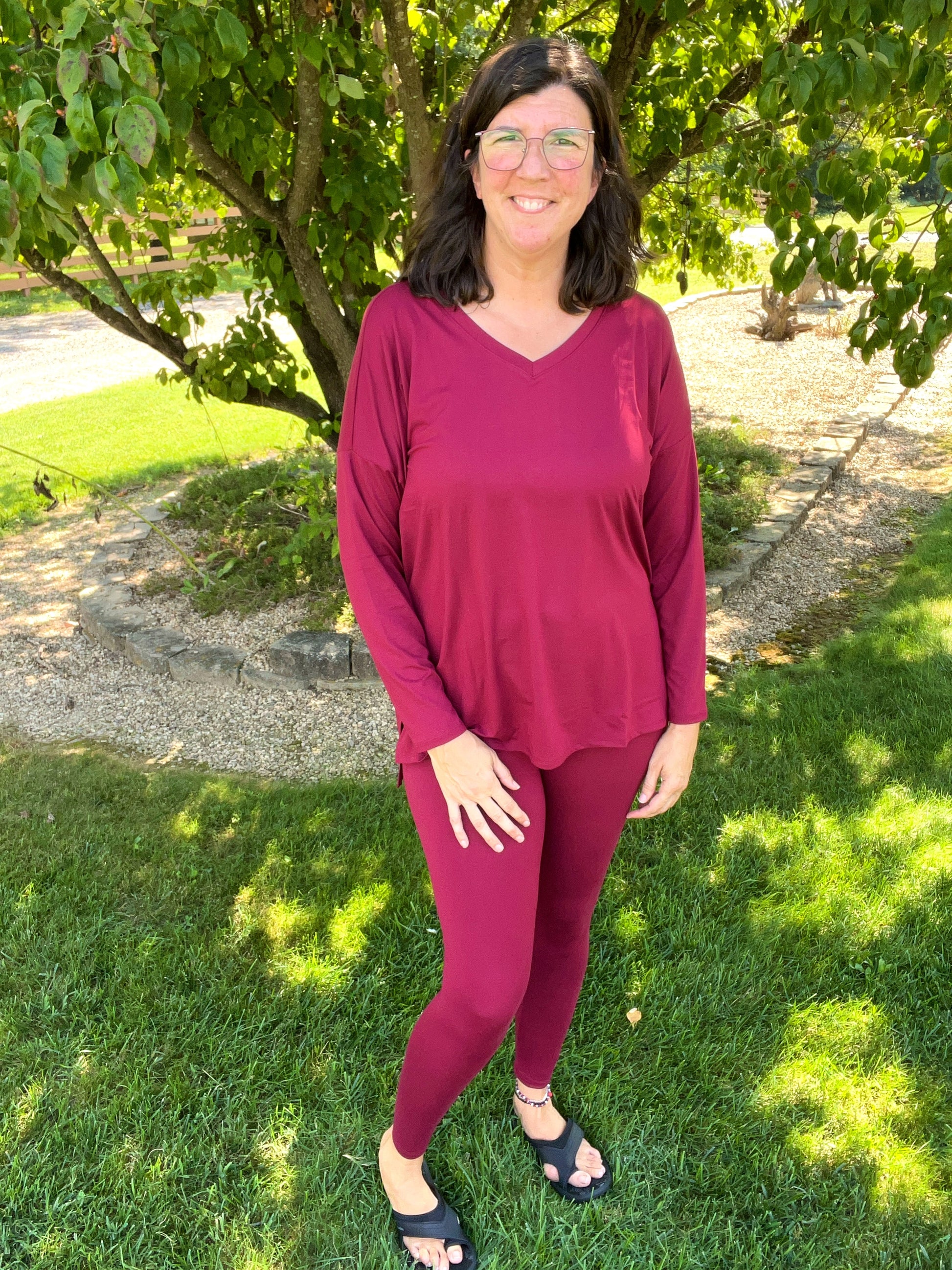 Oh so soft Zenana solid cabernet v-neck long sleeve top w/ matching leggings set!!!
