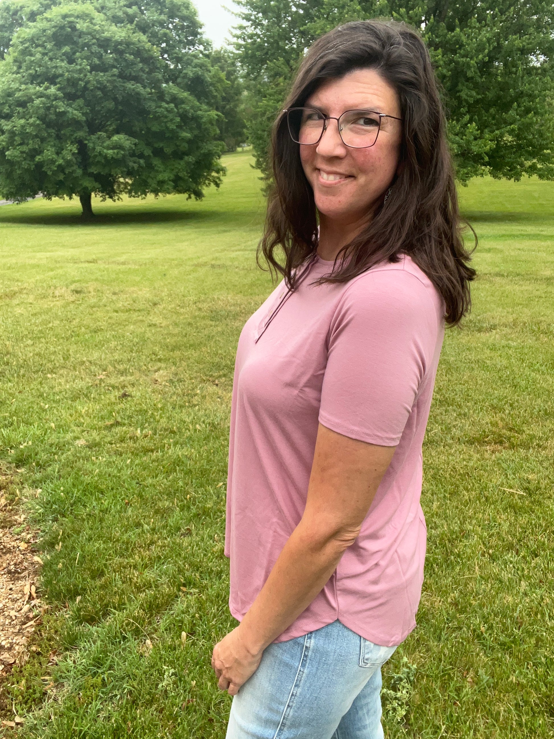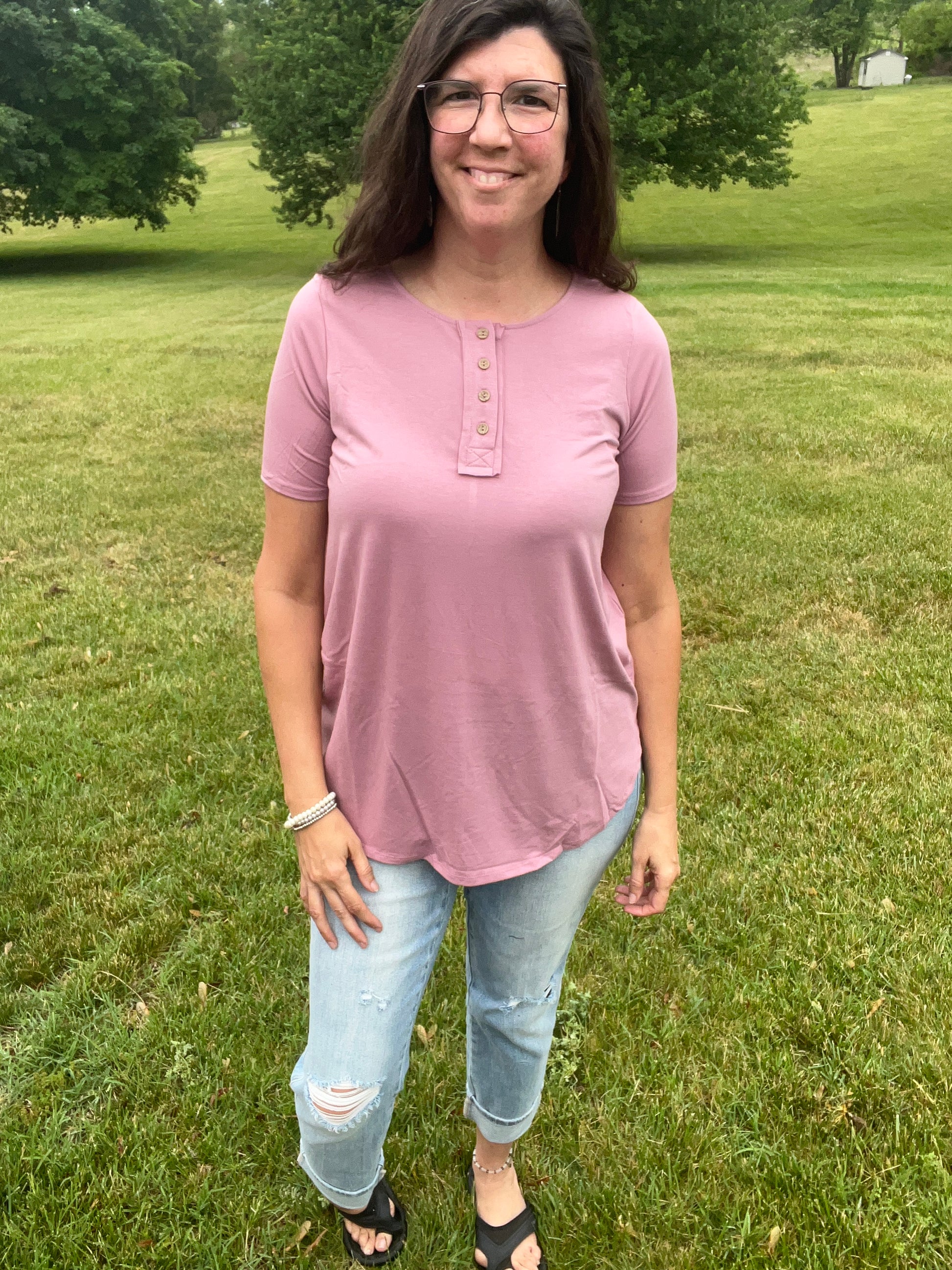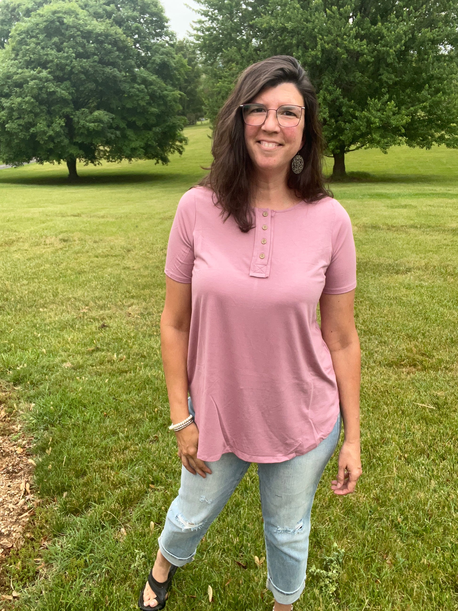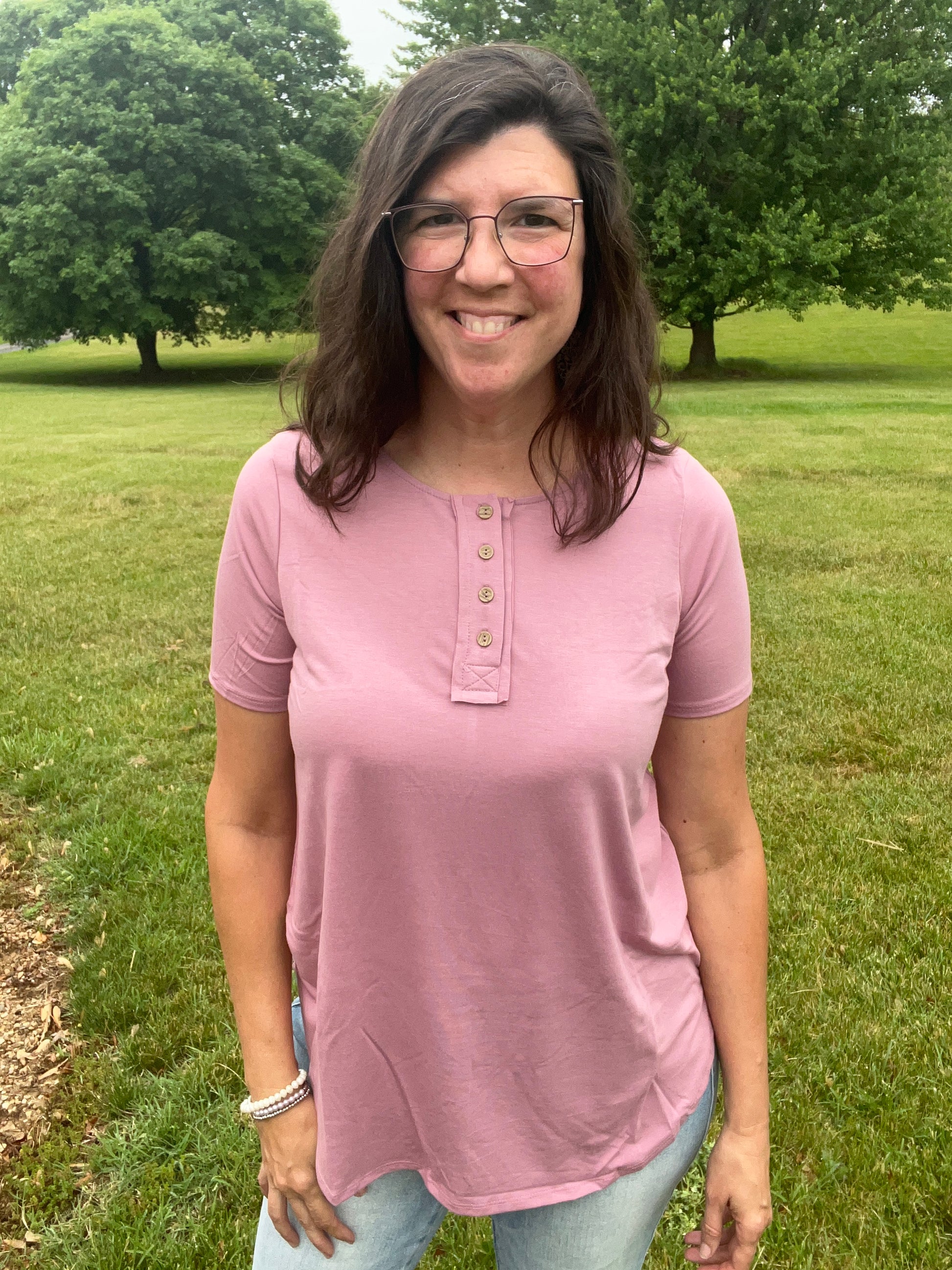 Wear buttoned or unbutton a few for a cute look. This top is soft & stretchy. You’ll love the curved hemline & relaxed fit.